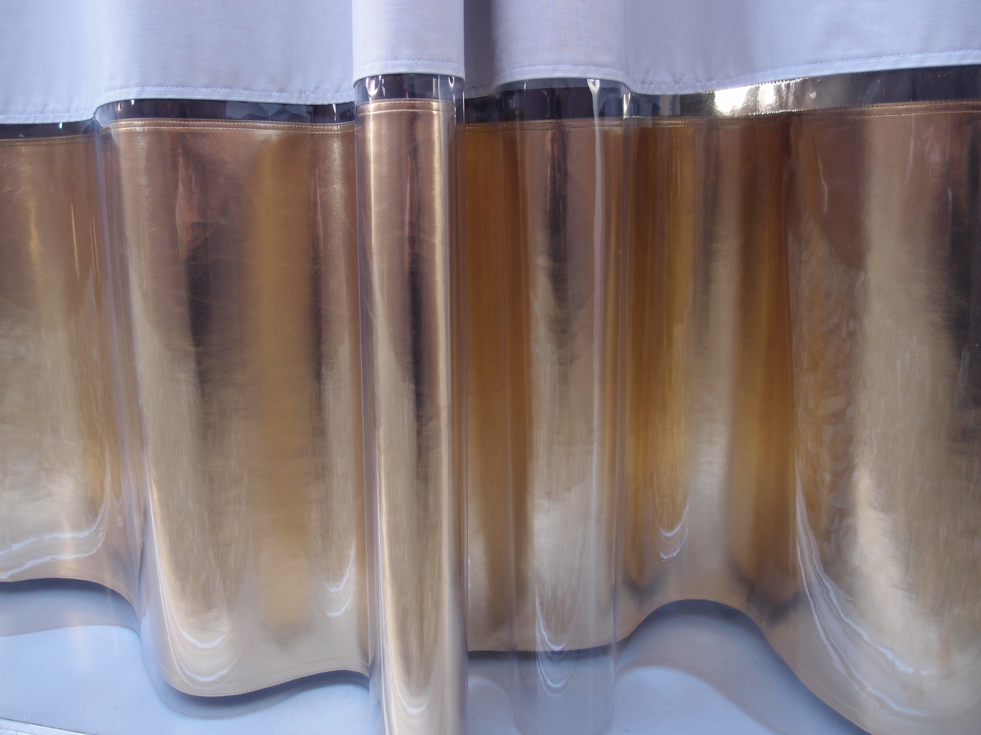 The top floor is semi-transparent, covered on both sides by a large facade punctured with portholes that light up the bedrooms. These round windows created an opportunity for Inside Outside to fabricate curtains that respond to the specific architectural conditions. White lacquer patches, lined with gold faux leather floating on a canvas of white voile cover the windows and softly reflect a golden glow on the interior wall. A horizontal slit in light blue and grey lacquer curtains provide a delicate view outwards while the penetrating daylight bounces on the curtain’s oily reflective surface. Thus the three different curtains for three different bedrooms answer to different demands for daylight entry and colour.