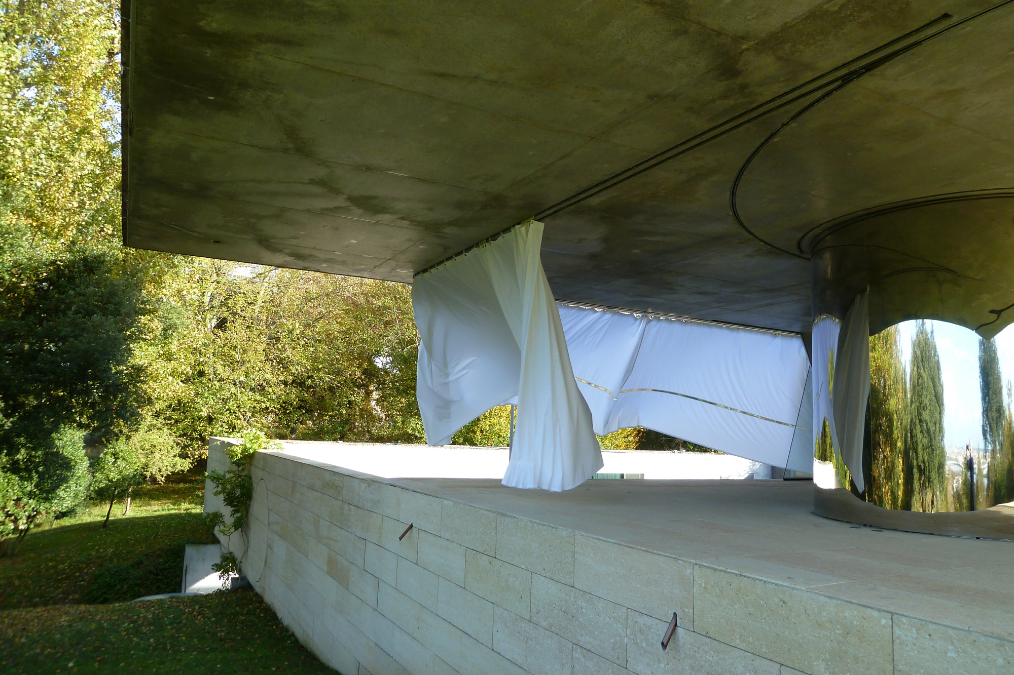 The middle floor is the most transparent, boasting a huge glass facade. The client wanted to be able to shut out the light coming in from changing angles during the day. A white cotton curtain with a horizontal slit reflects the bright light of southern France outwards and diffuses it inwards. A strategically placed circular window allows the owner to choose the views out to the garden, courtyard and the city as she moves around the space. The exterior track on the southern façade is inhabited by a grey net at present, whereas, in its early years, the house was accompanied by a jute curtain .The large net filters the view and the harsh sunlight, creating an extra in-between space on the terrace.