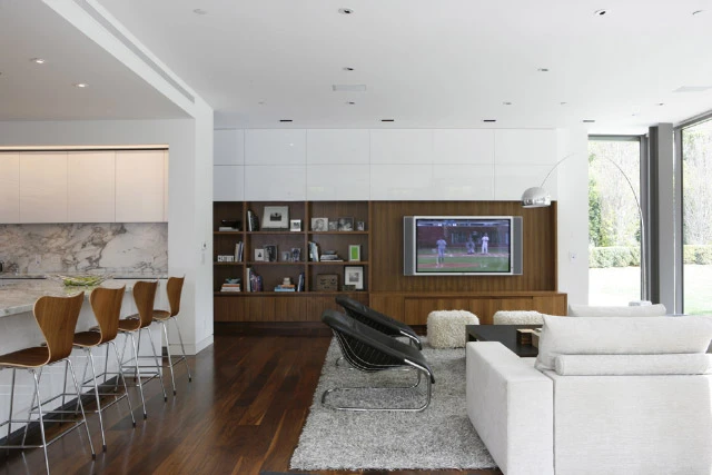 All materials that were specified by MLK Studio were thoughtfully selected to harmonize with the architect’s vision for the building. Walnut hardwood flooring throughout, as well as bluestone counter tops coordinate with the architect’s stacked bluestone walls. The kitchen’s palette of calacutta marble and high gloss cabinetry, as well as the master bathroom’s Turkish limestone walls and flooring underscore the client’s desire for a neutral palette.