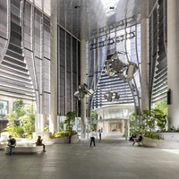 Located at the heart of Singapore’s financial district on the site of a former public car park and a hawker center, the 93,000 m2 mixed-use high-rise is defined by a dynamic interplay of orthogonal lines, lush greenery, and contrasting textures.