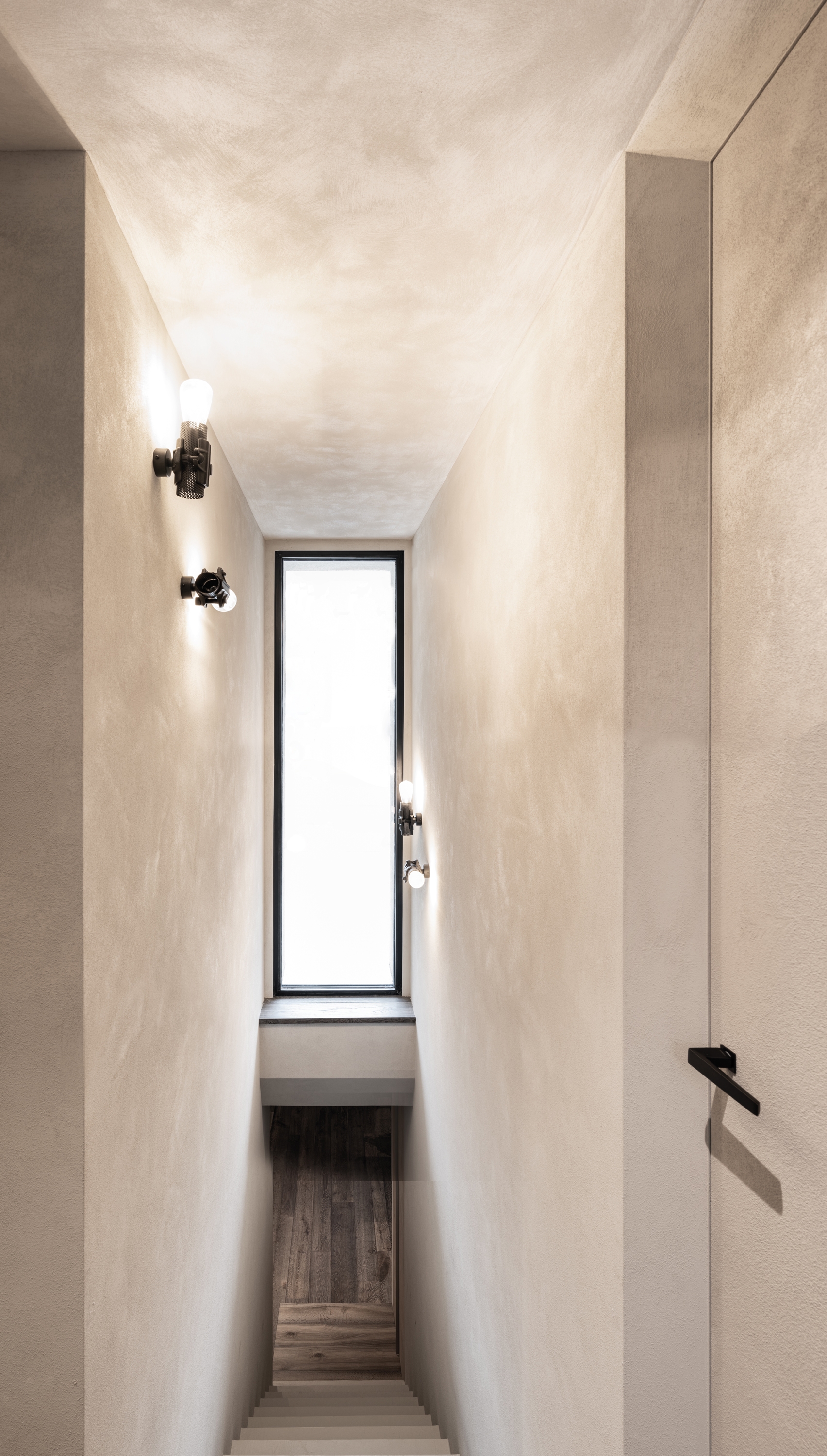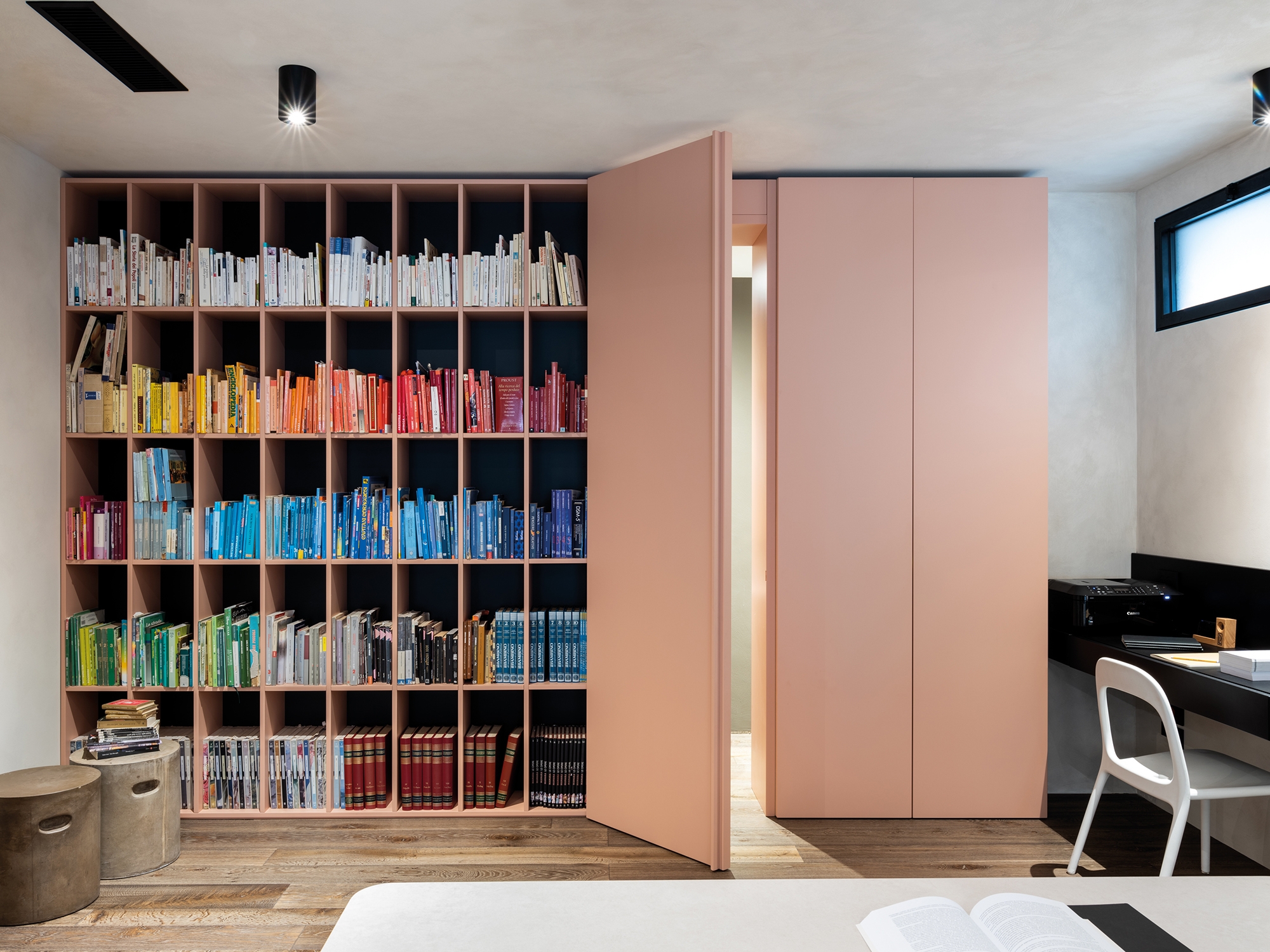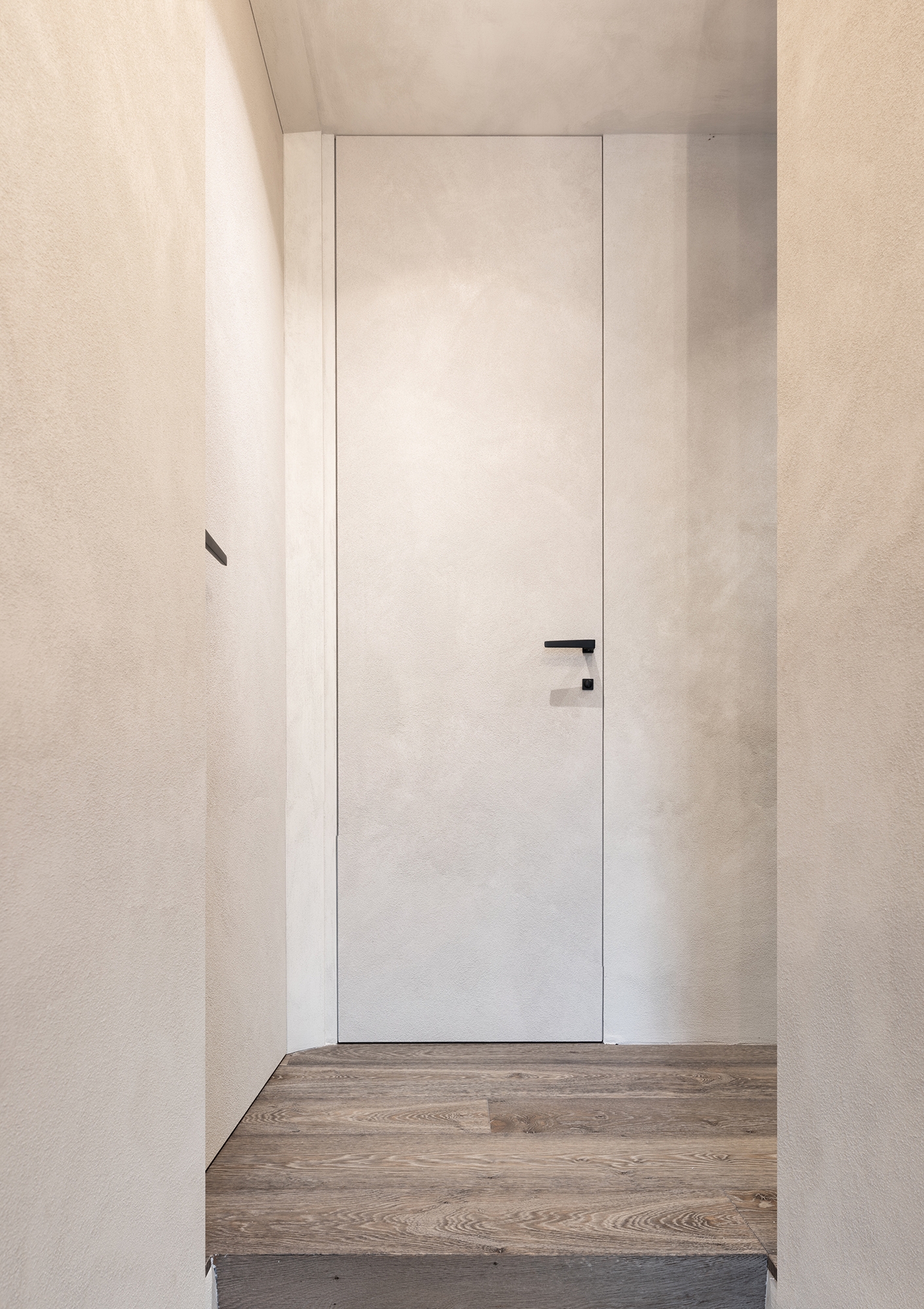 Los marcos de puerta abocinados ECLISSE 40 en versión pintable, combinados con paneles de puerta también pintables y ambos acabados como las paredes, encajan perfectamente en este estilo esencial. Completamente camuflados, desaparecen de la vista y amueblan esculpiendo volúmenes y creando juegos de luz. En el pasillo de la primera planta, que distribuye los accesos a los dormitorios y al cuarto de baño, los dos marcos abocinados ocupan totalmente los lados cortos, creando un juego de líneas que se entrecruzan y engañan a la perspectiva, mientras que en los lados largos dos puertas enrasadas a toda altura de la línea ECLISSE Syntesis ocultan los demás accesos sin interferir en este diseño minimalista. El único detalle que sobresale de la superficie ininterrumpida son los tiradores negros.