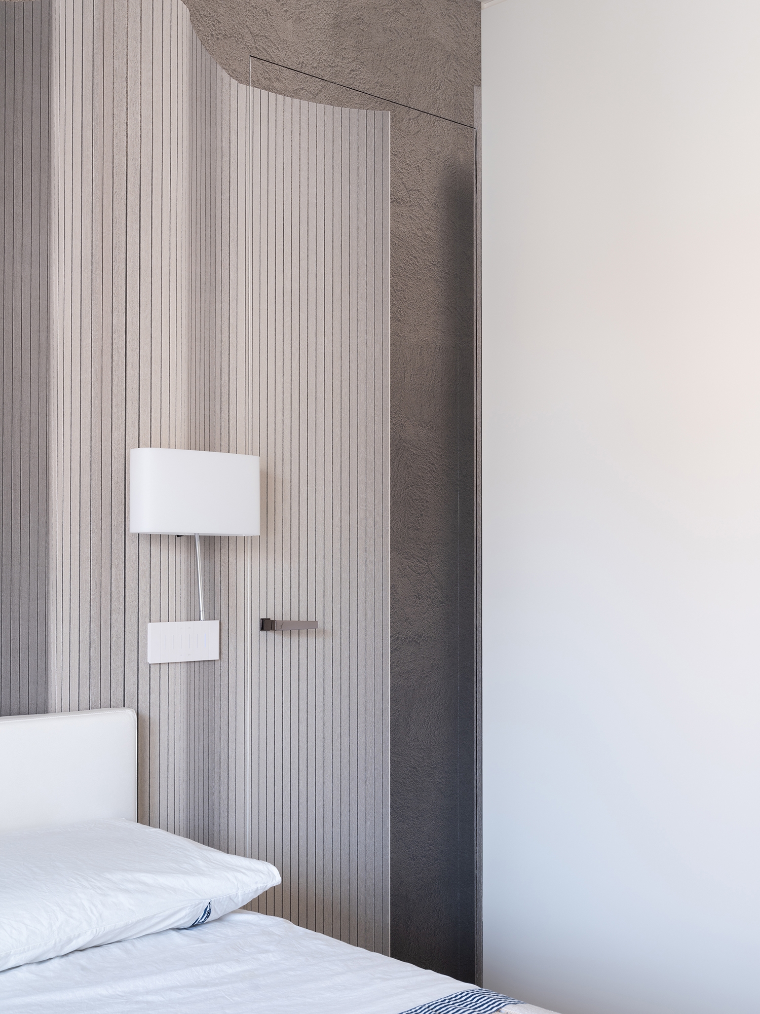 En el dormitorio, dos modelos ECLISSE 40 y dos puertas enrasadas sobre un marco ECLISSE Syntesis Line Abatible reproducen el pasillo del primer piso pero con un efecto totalmente diferente, dado por el contraste entre las paredes de color claro y los dos marcos abocinados en acabado Tobacco. Ocupando toda la pared trasera, definen la anchura del espacio y se convierten en aberturas escénicas y teatreras.