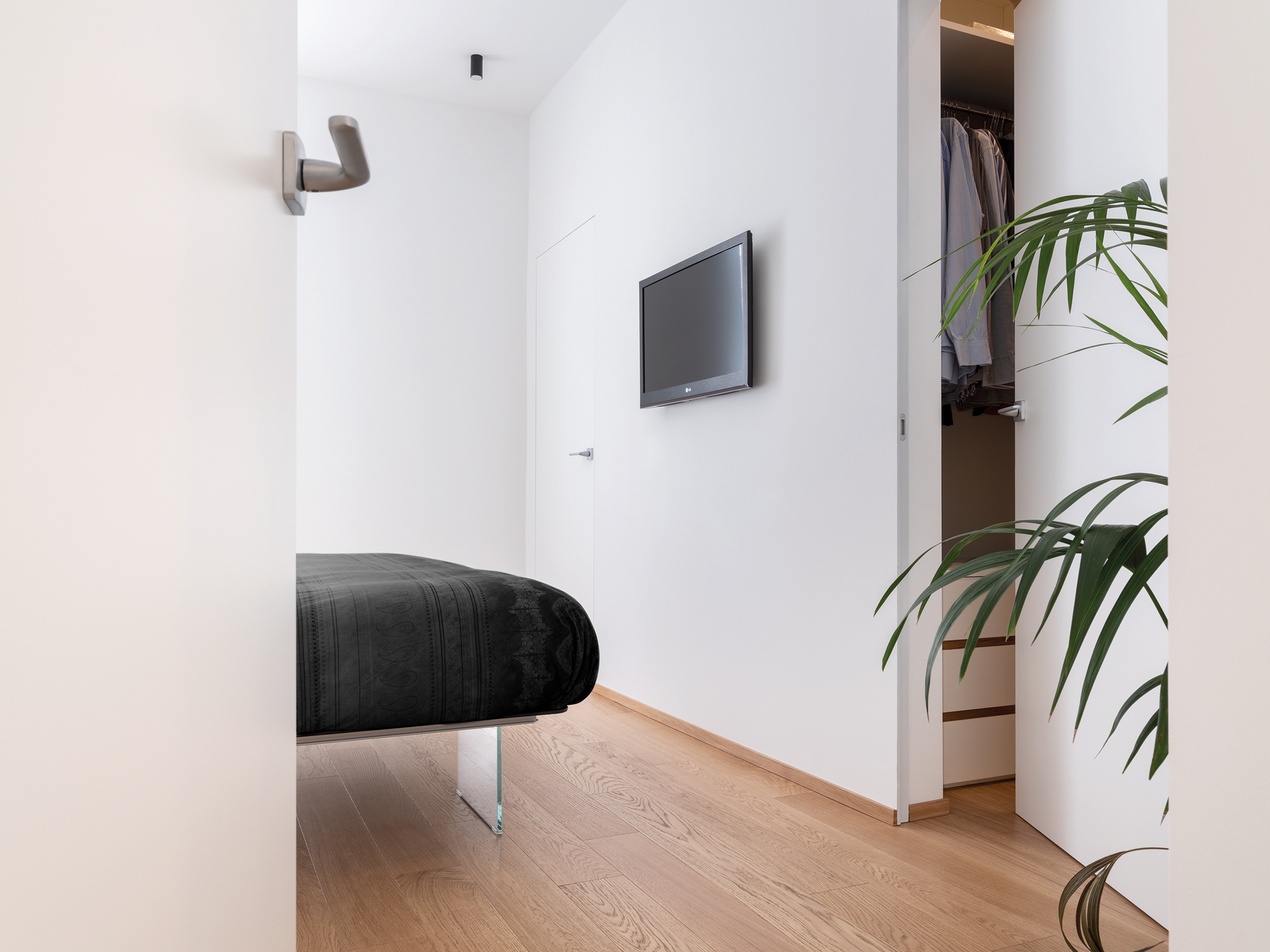 Para respetar la limpieza de los volúmenes interiores y la linealidad de las paredes y las habitaciones, todas las puertas interiores del proyecto están diseñadas a ras de la pared, absolutamente funcionales pero con un impacto estético mínimo.