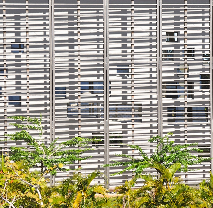 The sun protection of the building rests on the principle of the double-skin façade. All the facades and particularly the W/E facades are protected by this wooden filter that forms a very effective brise soleil, a second roof protects the programmatic heart from the solar radius very intense in Guyana (proximity of the Equator).