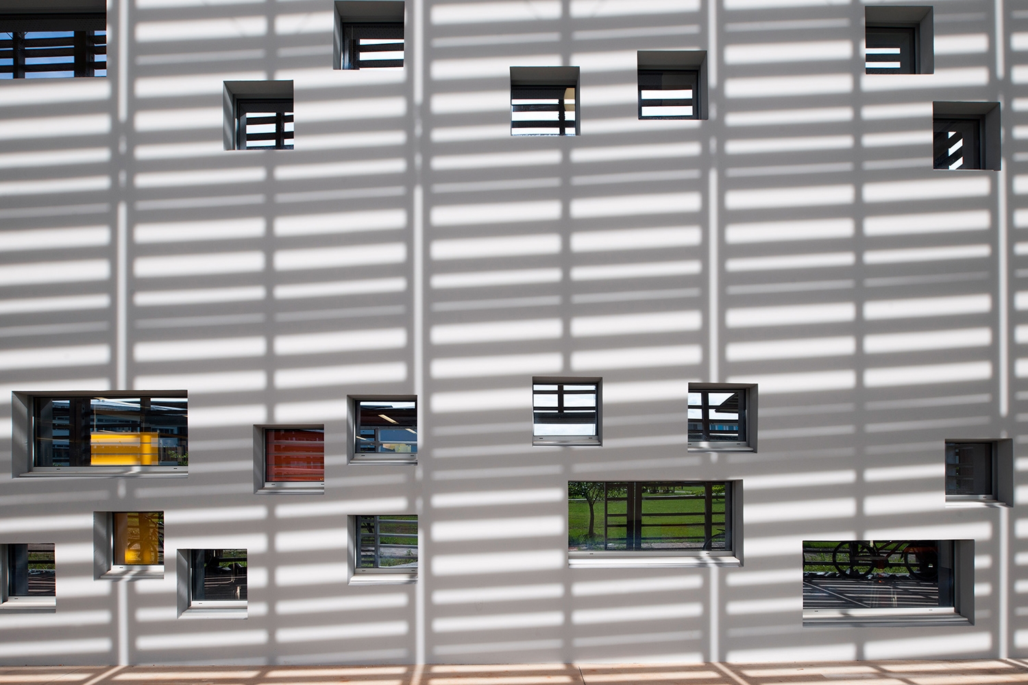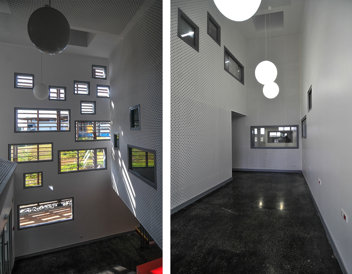 The main architectural choice is the creation of an open peripheral space: unlike a construction cast in one piece with no dialogue with the surrounding, the building is wrapped up with a peripheral space of variable dimensions called “gallery” or peristyle. This gallery is an open space, a place where the students meet and pass through, an extra room between inside and outside, sheltered from sun and rain.