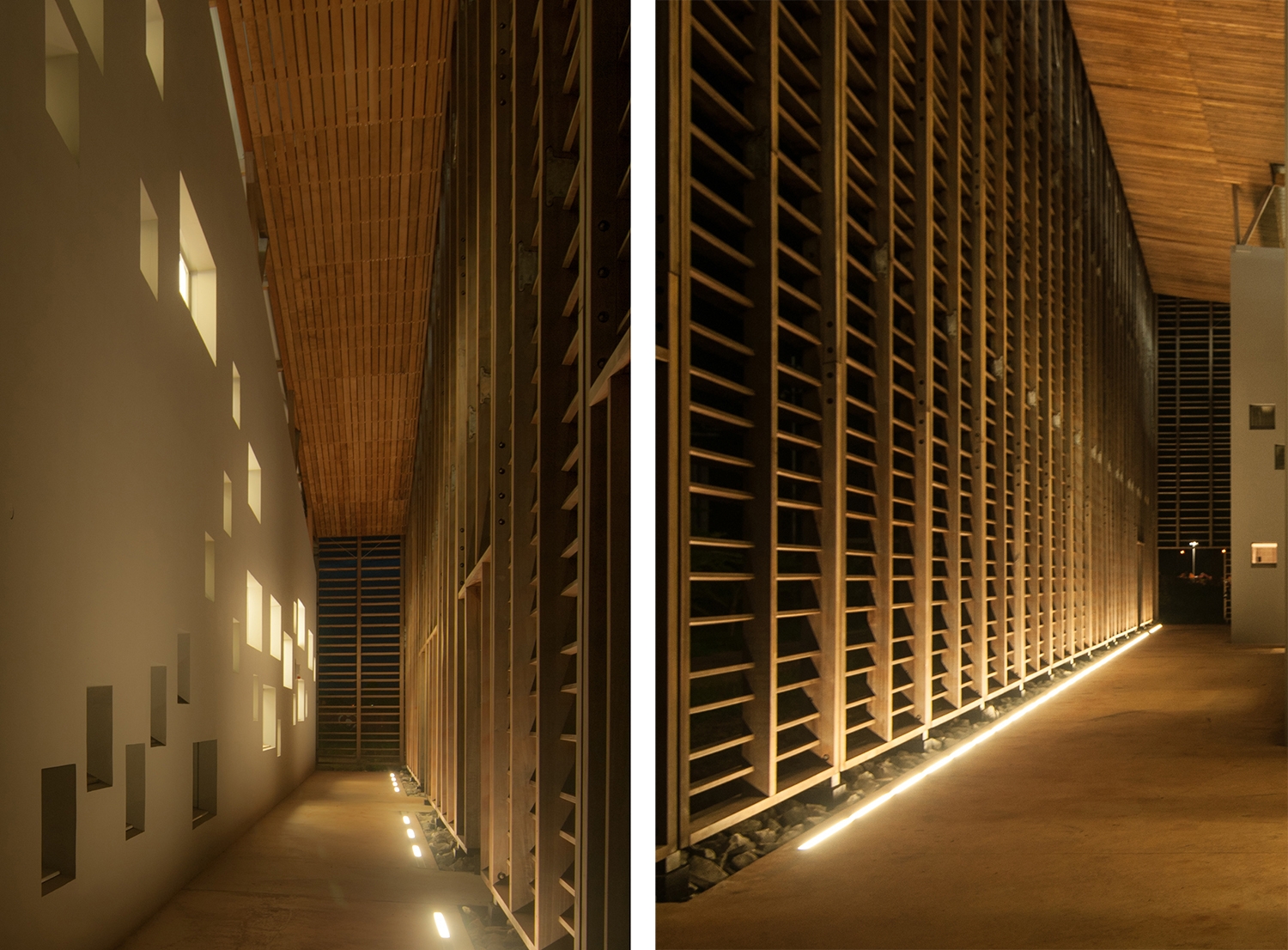 Additional wealth, the peristyle forms a place to exchange, a public space taken over – and even “the space for the public” – which connects the library to the rest of the University: the library is a place for studying that is not cut off from the rest of the world, all it takes to see the life of the University Campus is to look up when sitting at a reading table and have a look at the traffic and motions in the gallery. This one is made of a filter: a slope of wooden lace carefully placed around a concrete core.