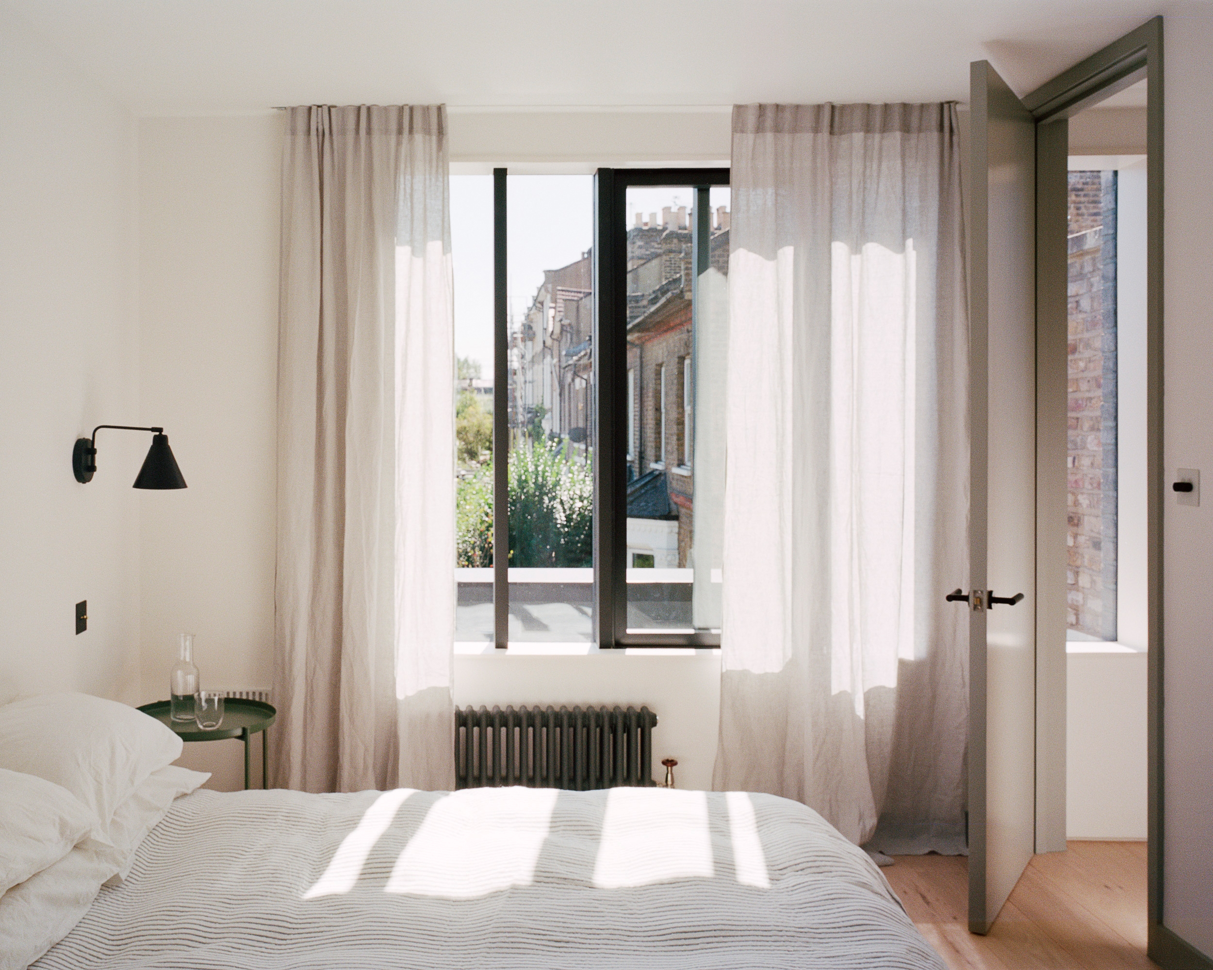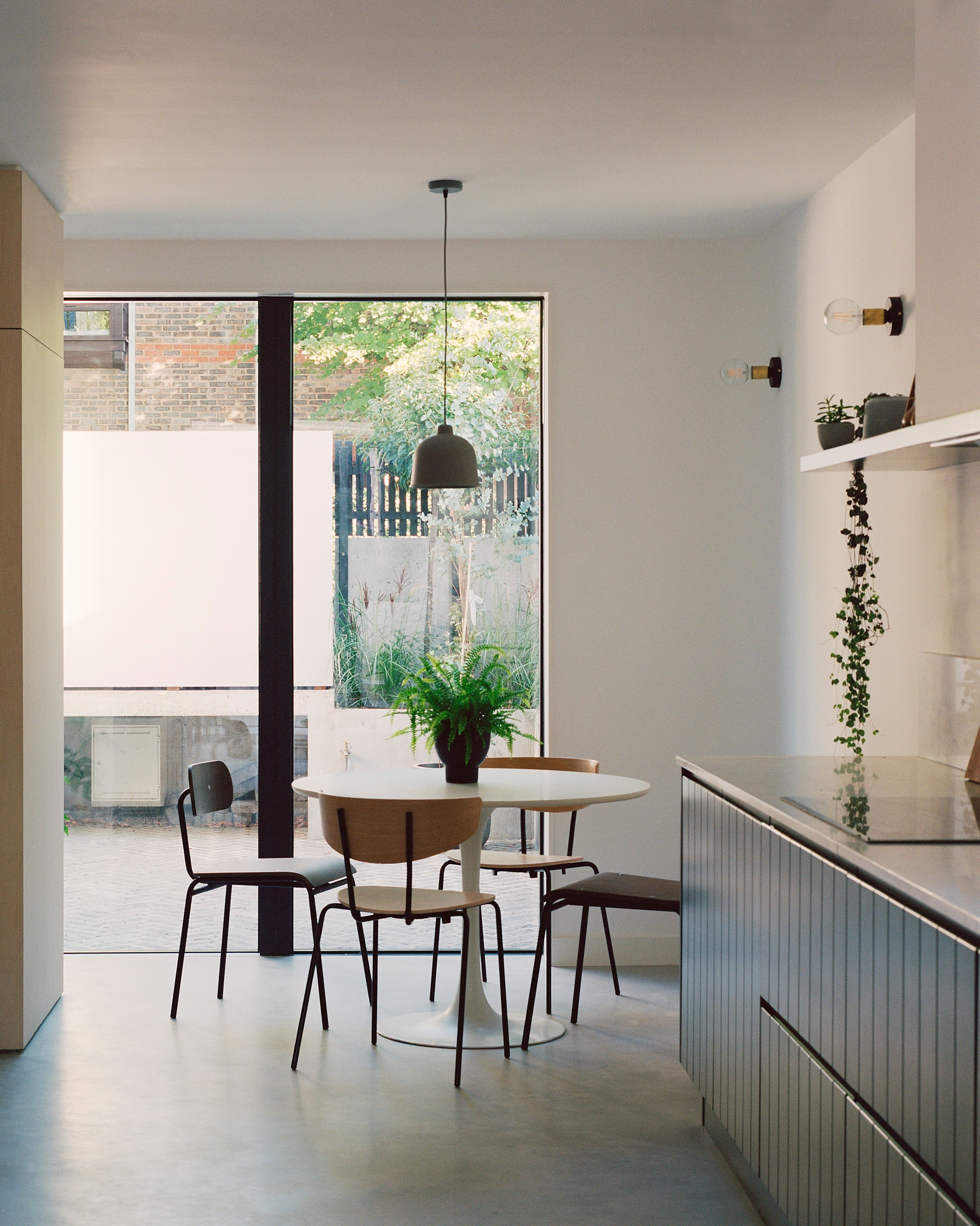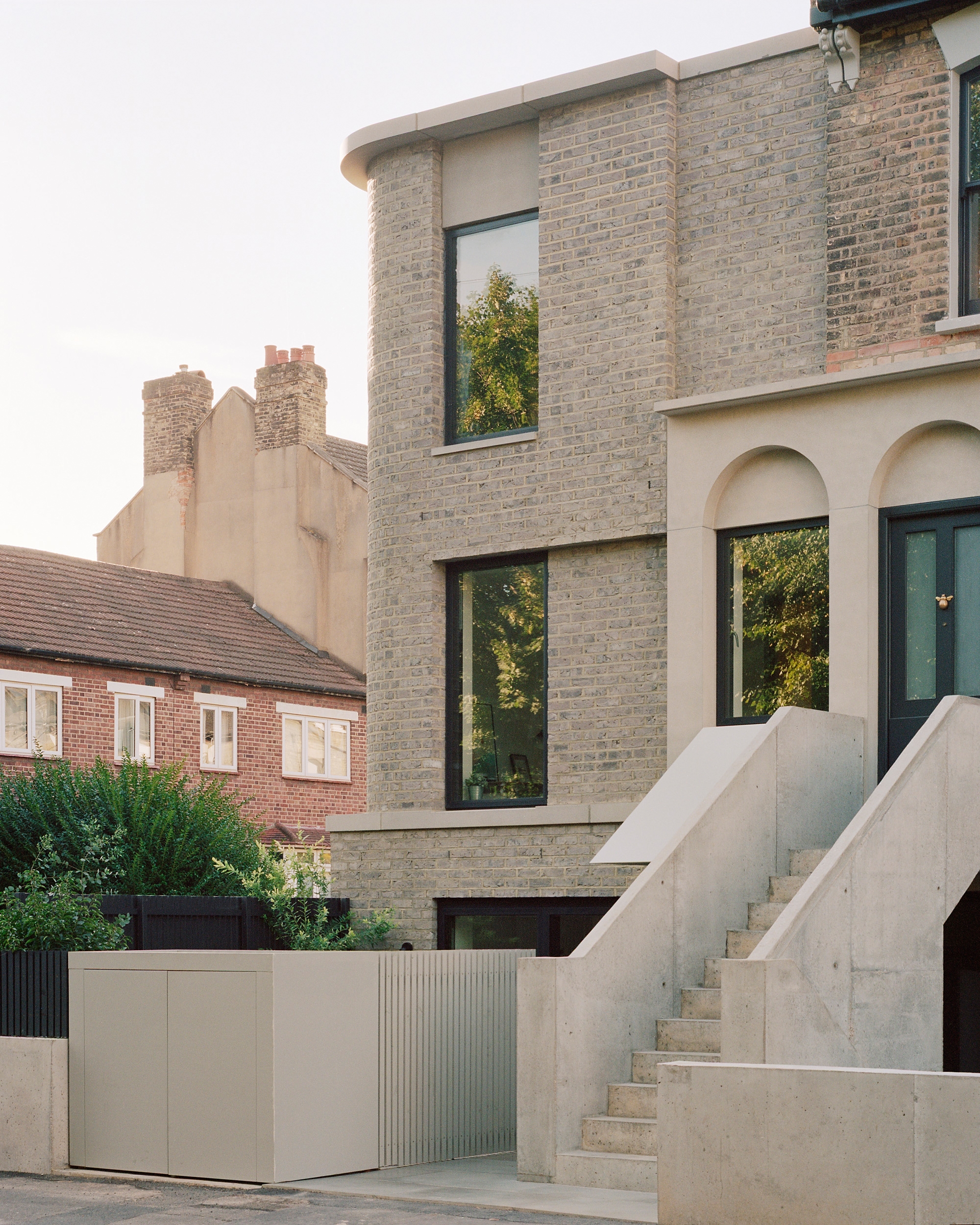Each small move reinforces the sense of a quietly subversive building to the casual passerby. The entrance stair to the new-build appears conventional until, on closer inspection, you see that the entrance is at the lower level; the upper ground ‘door’ has become a window, and the powder-coated metal porch canopy appears – out of the corner of the eye – as part of the stair. Windows and openings in the new-build reflect those in the existing terrace in size and placement, but are articulated in a contemporary treatment and playfully arranged alongside blind windows on the side elevation.
