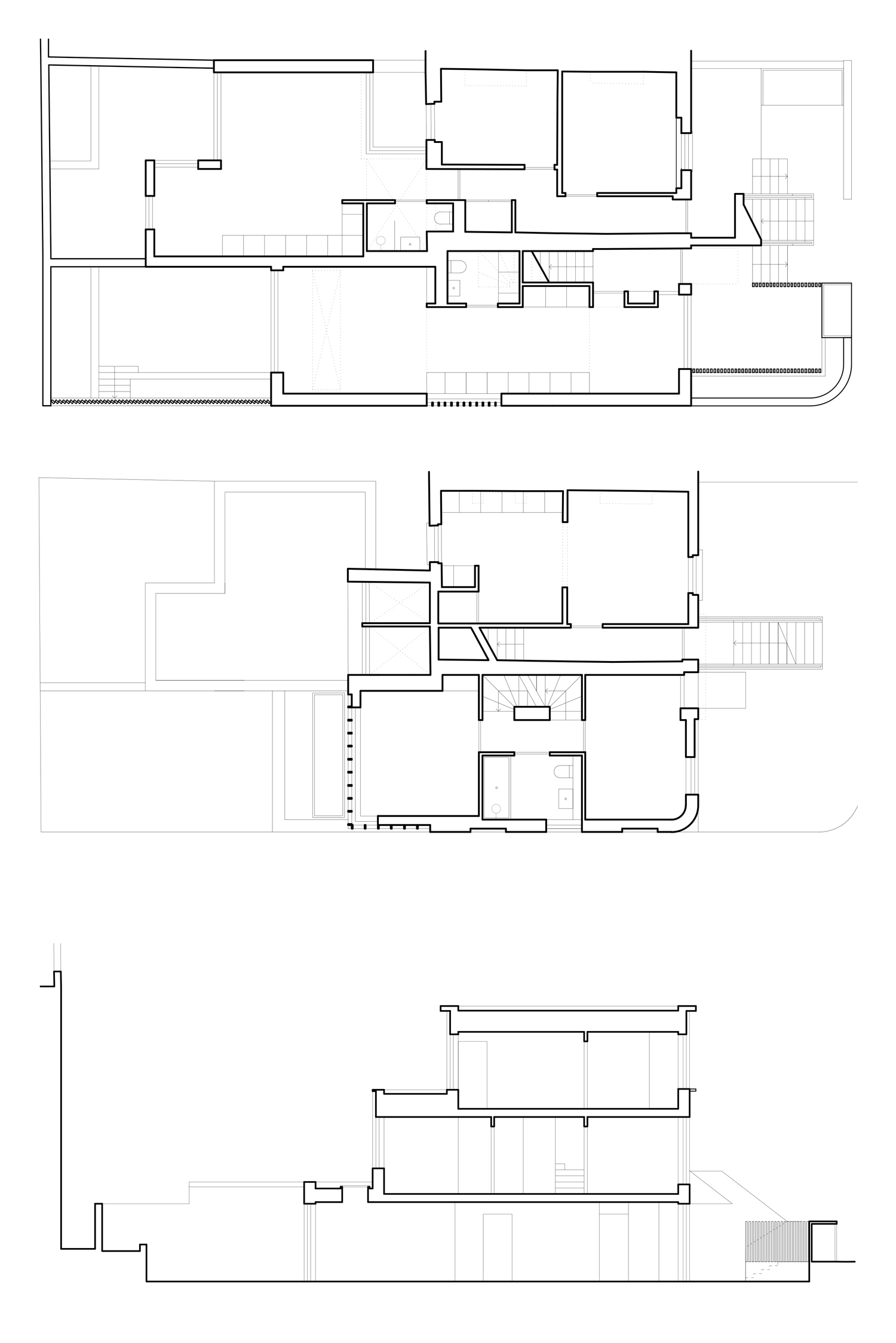 The new-build house is accessed at ground level and features an open plan kitchen/diner/ living space with direct access to private garden spaces at the front and rear of the property, both protected by the boundary garden wall. The neighbouring ground floor apartment benefits from a bijou court and small rear terrace to bring light into the property. The upper maisonette is reconfigured with the repositioning of the internal stair.