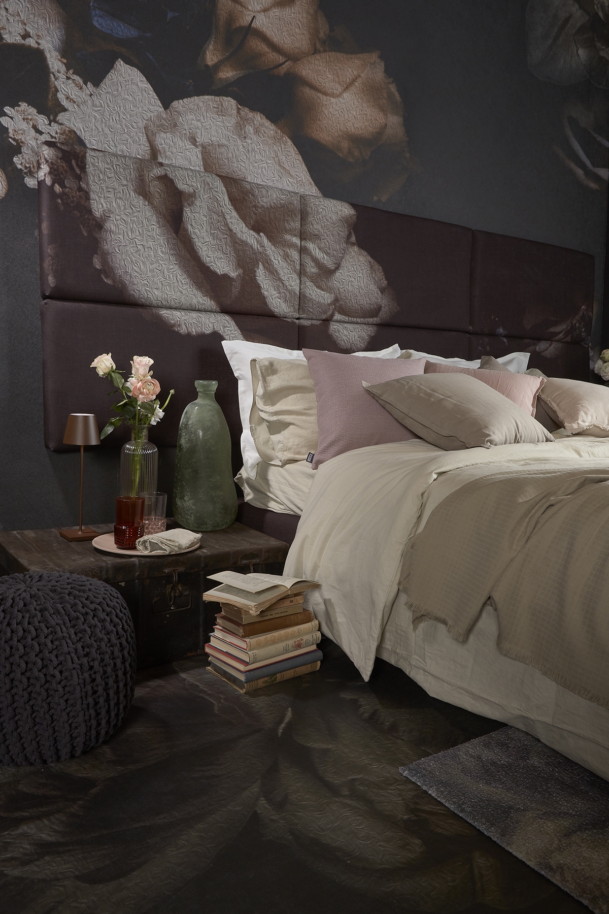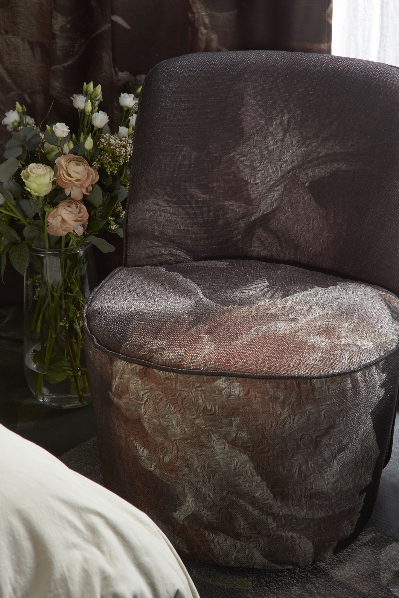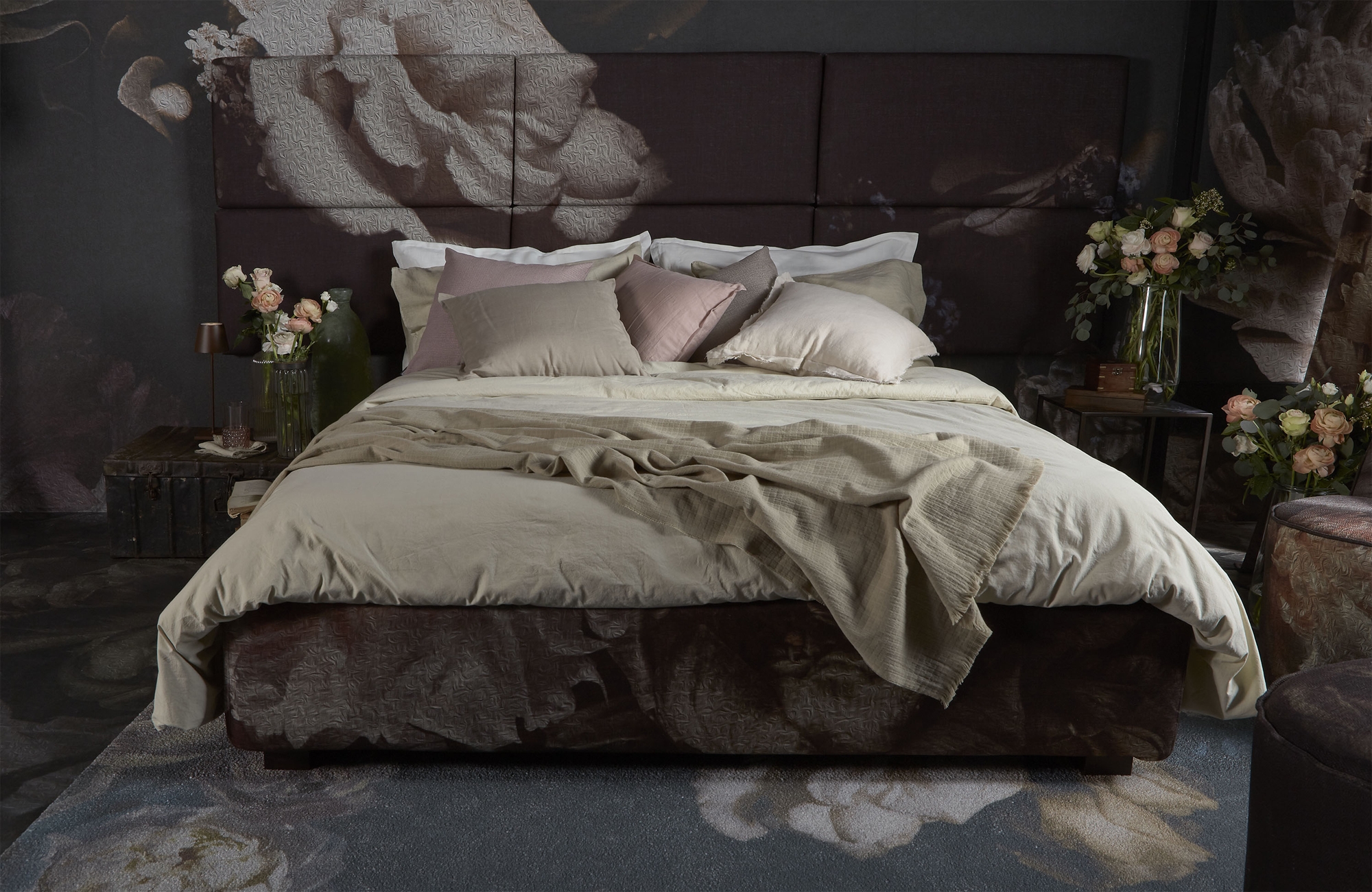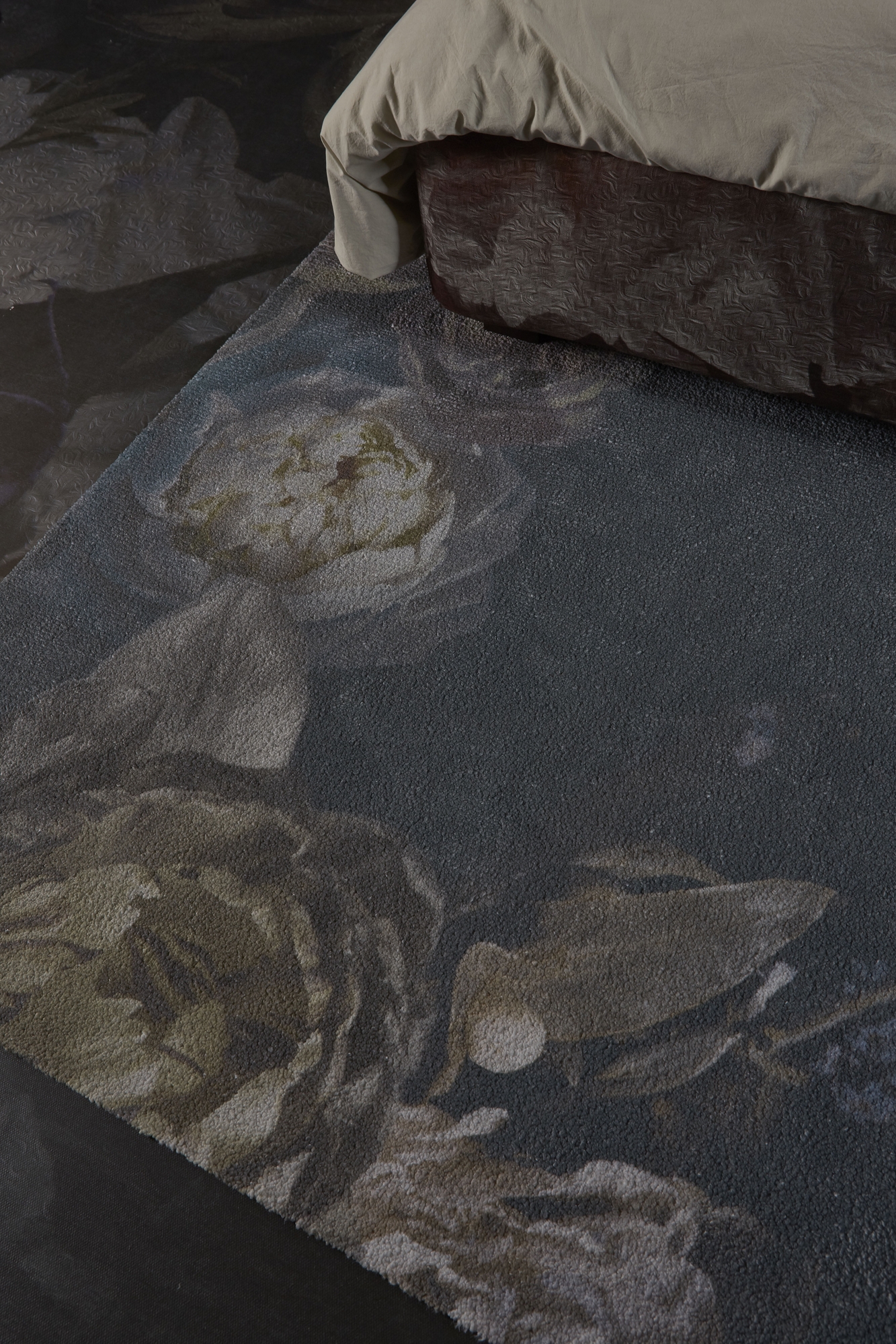 In this project an image has been printed over different materials and furnishings such as: bed, fabrics and curtains, coffee tables, floors, carpets, walls, lamps and small armchairs, keeping the graphic continuity and creating a real scenography inside the showroom.