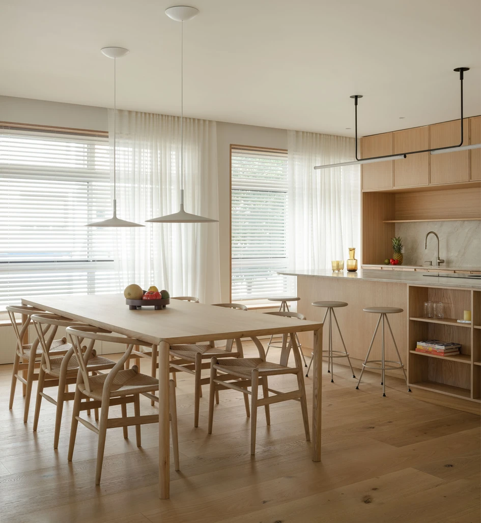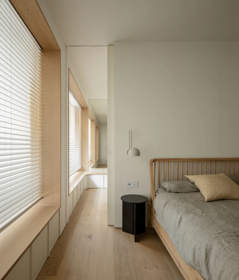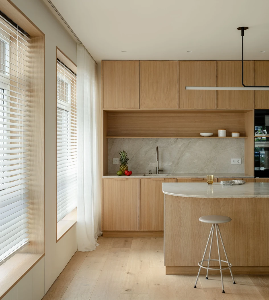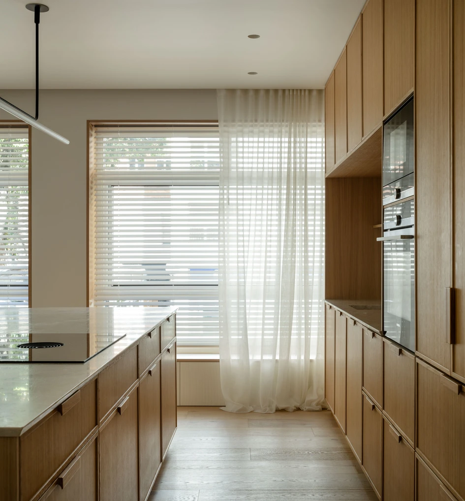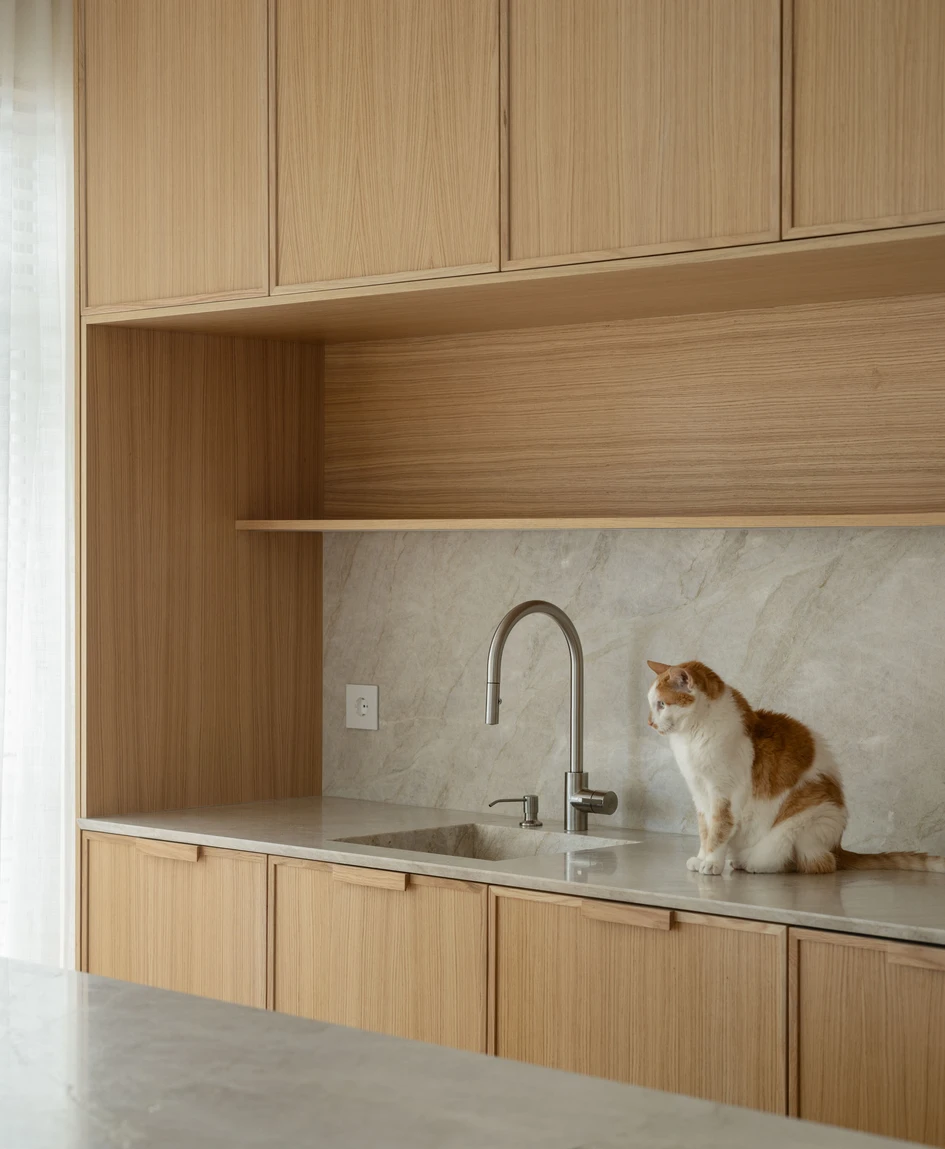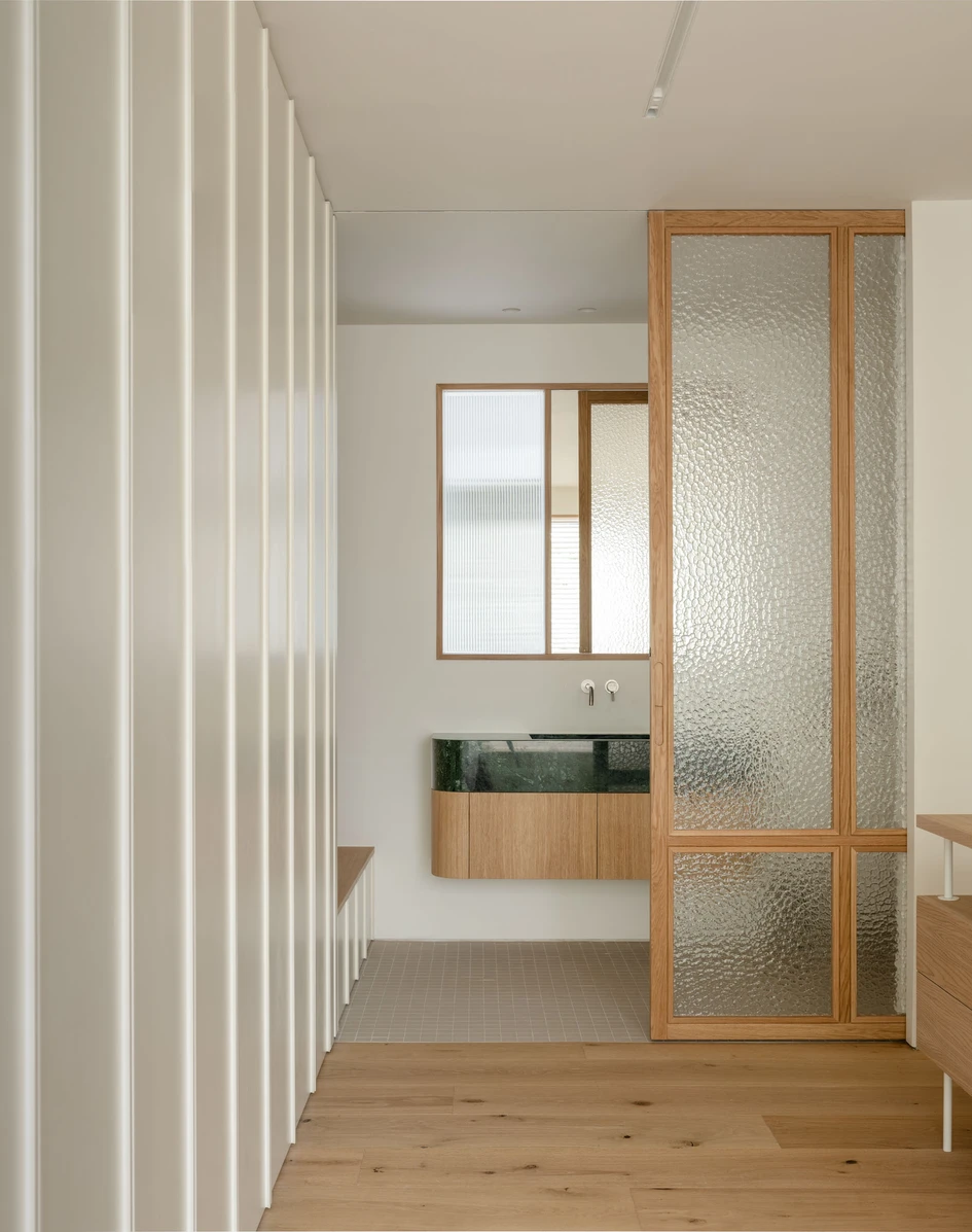 Special attention has been paid to the choice of materials and the design of each integrated furniture element. Natural materials and neutral colors have been chosen to achieve a sense of calm inside the house. The aim is to create an interior that invites reflection and is luminous. The flooring, doors and furniture are made of American white oak. Tadelak has been used to cover the showers and ceramic tiles for the flooring in the wet areas. The washbasins, designed by our studio, are made of terrazzo or marble