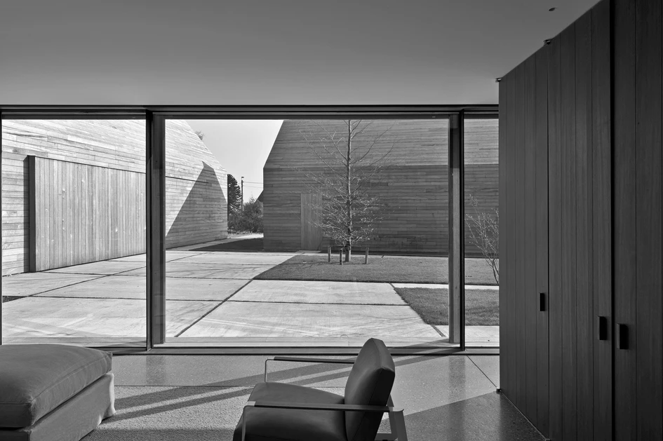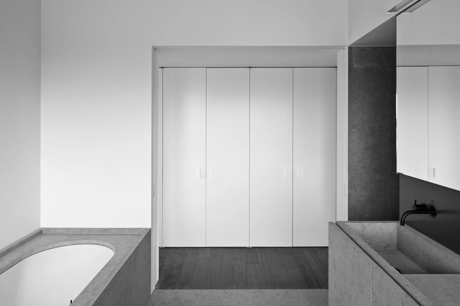 The abstract shape of the three volumes at a first sight do not seem to be well-established in its rural context, however after entering the courtyard along a covered path and analyzing the surrounding structures and extent of the entire project, one feels completely absorbed into tradition and the presence of the volumes. The principles to create a passive house were followed and achieved with the collaboration with Denc, an architectural studio specializing in sustainable construction. The garden is designed around the planning of solitary trees. The use of brushed concrete floor reflects the traditional farm and sandblasted finish suit the atmosphere while giving a visible continuation between the domestic and rural horizons.