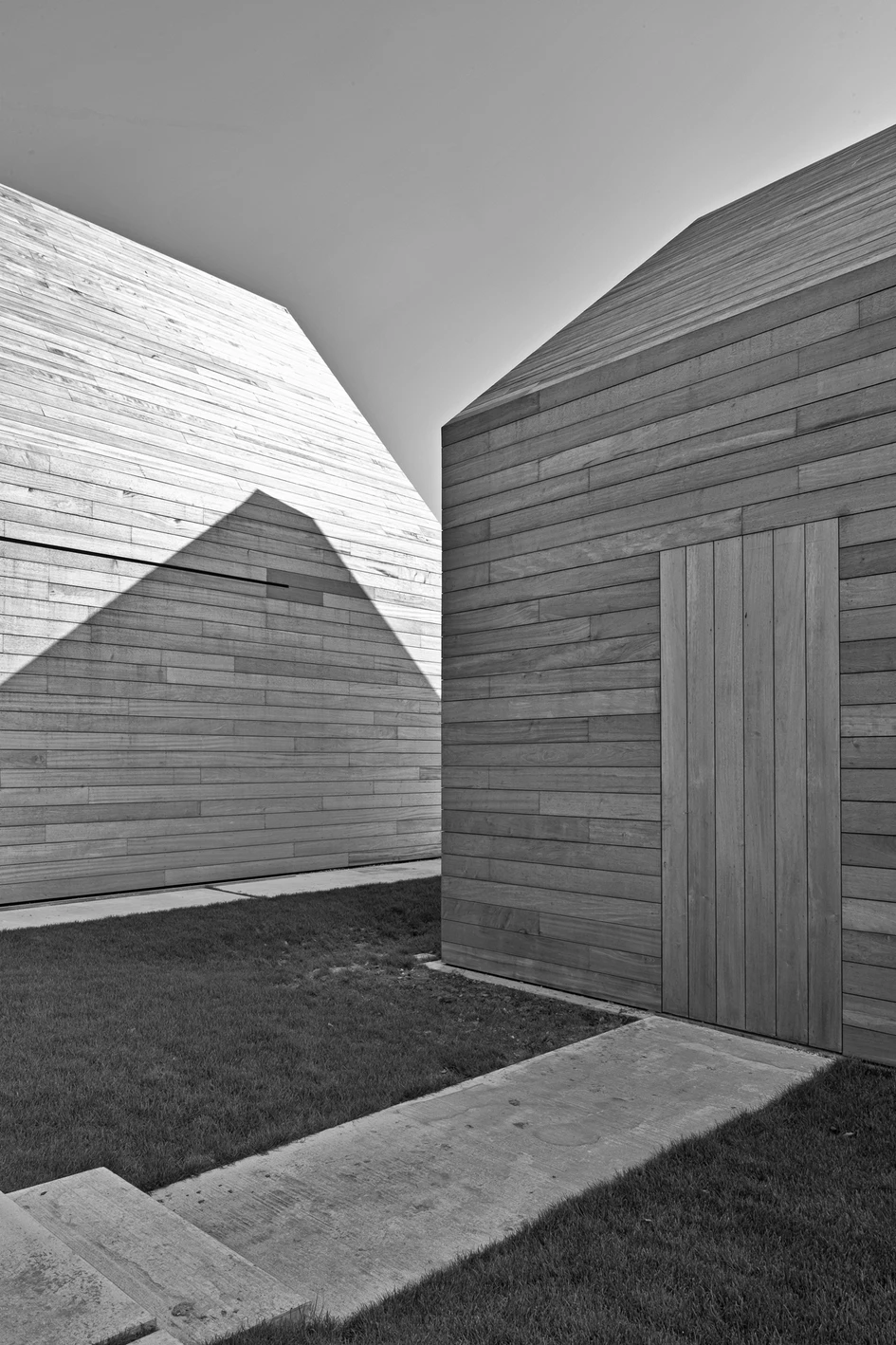 Reference to the simple, iconic, traditional building remains however with an added contemporary approach of the study of form without ornamentation, the use of materials and attention to detail. The facade of these buildings summarizes this concept; gutters and chimneys are invisible in its abstract form, doors and thresholds are not made of traditional stone and a complete wood façade (referring in original barns) wrap each volume including the roof. After careful analysis of the client’s brief, VVDA decided not to refurbish the two original barns but to build two new volumes imitating the ‘barns’. All volumes based on the same shape of the main building, strengthening further the conceptual idea of the project.