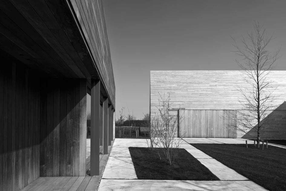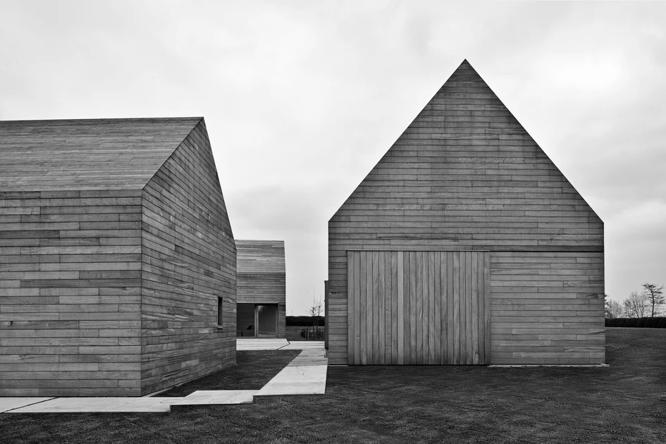 Located in the heart of Belgium, a house, an abode, a peaceful and welcoming place with a contemporary and informal character is inserted perfectly in its rural surroundings. A project made up of several nuclei: a main building and two barns have all been rebuilt to reminisce the old farm. Its only restriction was to build the new volumes on the existing footprint. The concept was to retain and acknowledge the simple shape of the rural building (a long extended volume, built perpendicular to the road and with a 45° slope tympanum roof); an inspiration from the Flemish regional farm, where one side of the building faces the small central courtyard (with the midday sun) and the other opens the view onto fields.