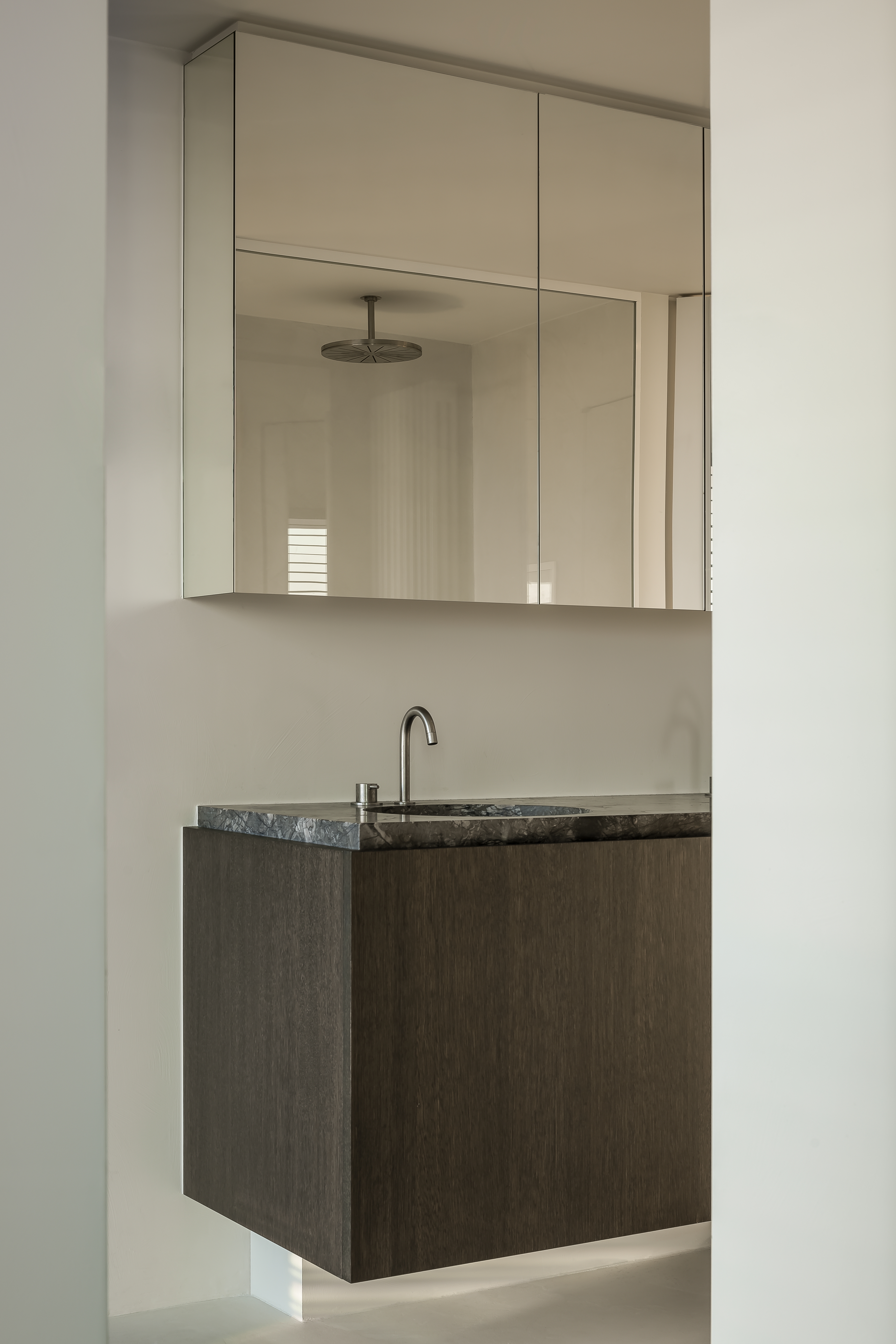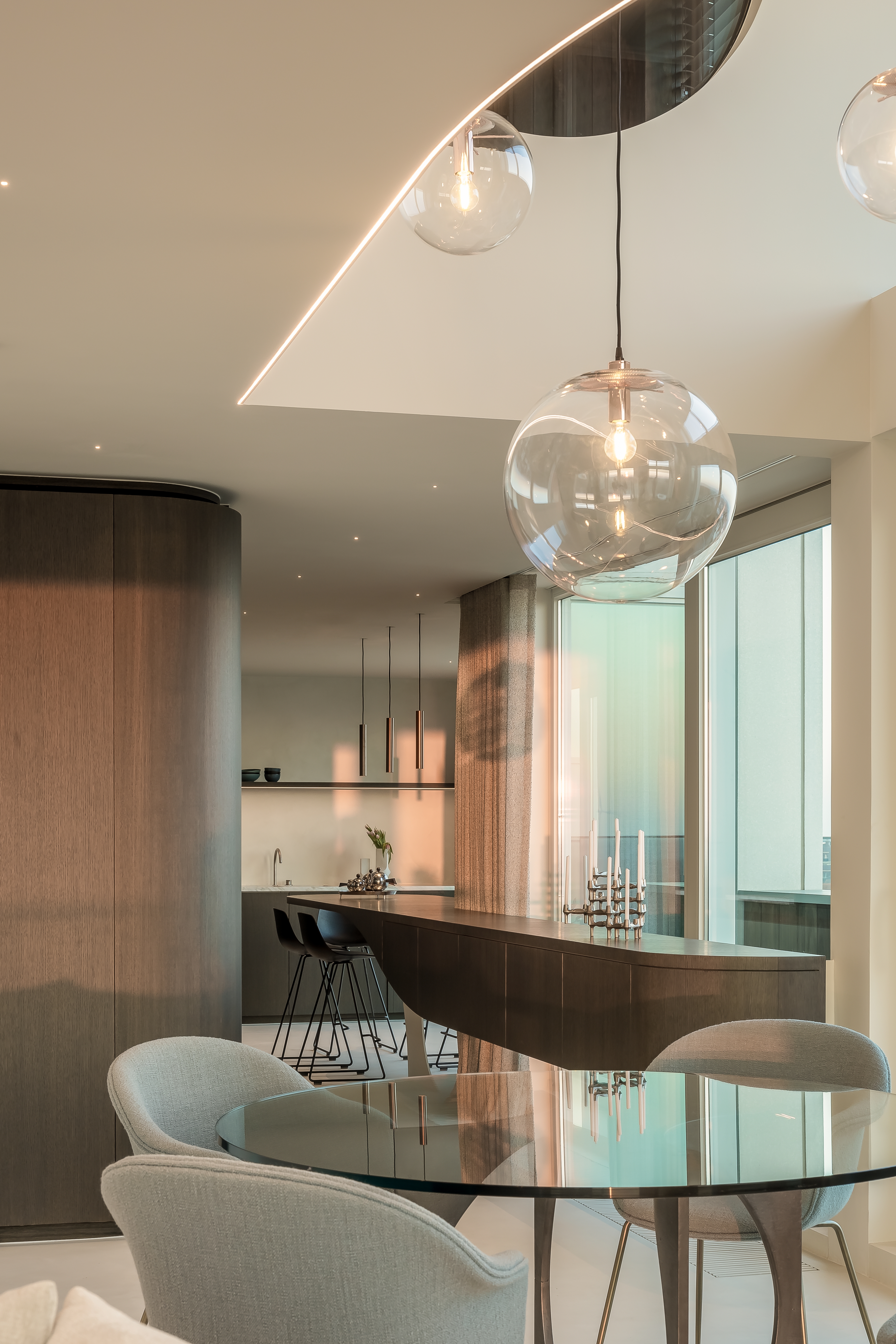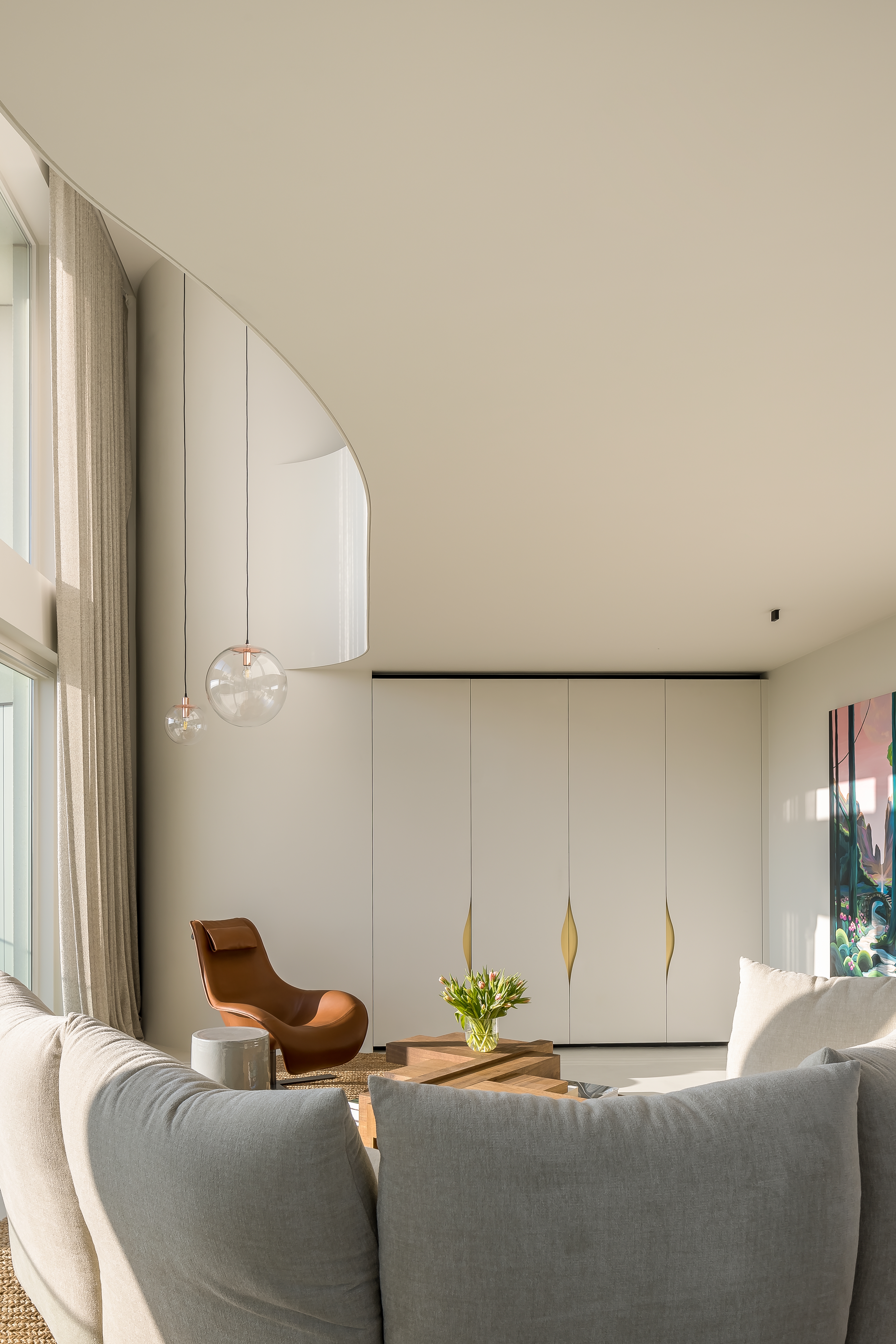 On the lower level the spaces are connected through the organically curved lines in the ceiling, the rounded corners of the furniture and the use of continuous materials.