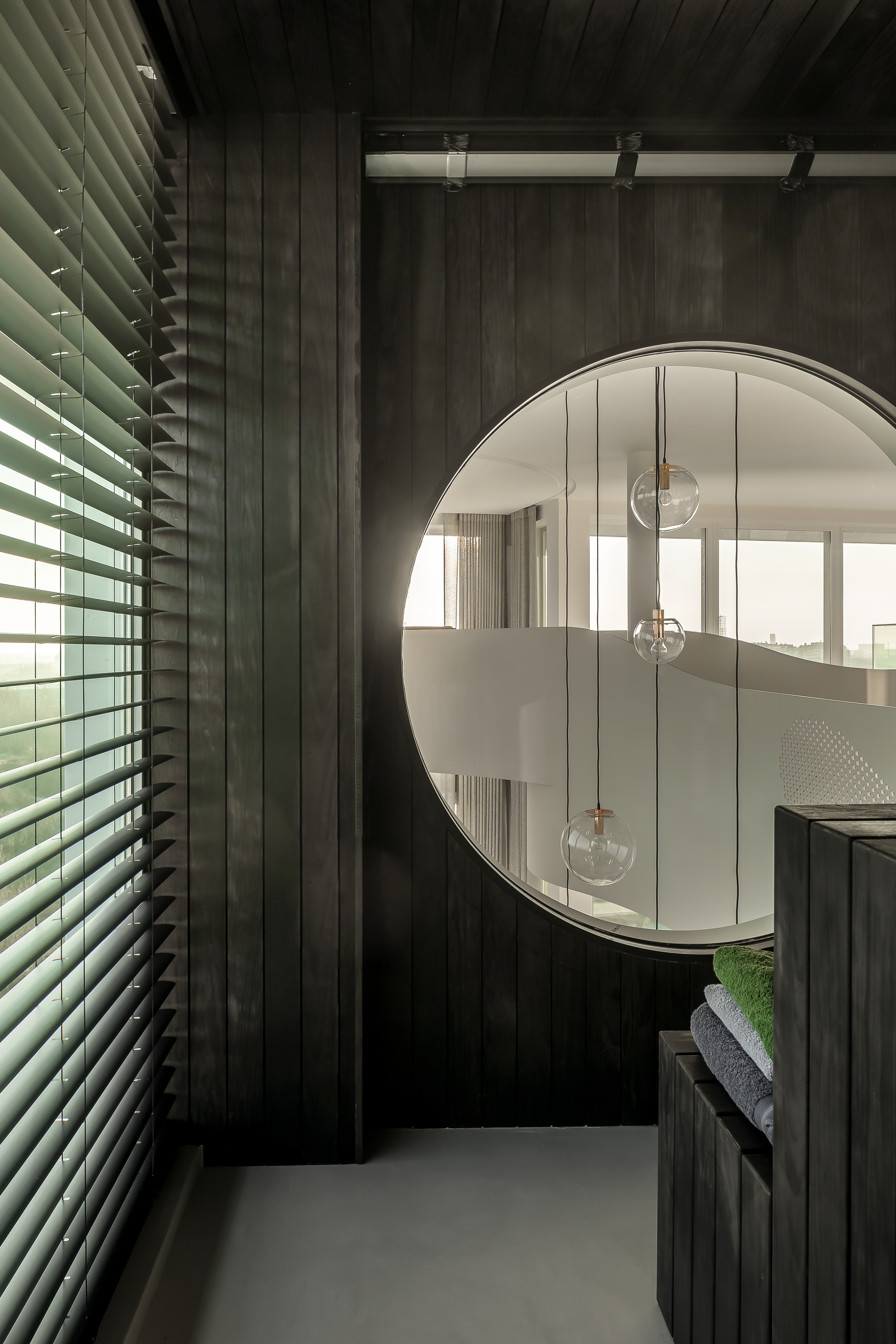 From the office desk, located in the bow, you have a magnificent view on both hinterland, sea and harbor. The sauna on the upper level is visually connected with the living space below through a round window.