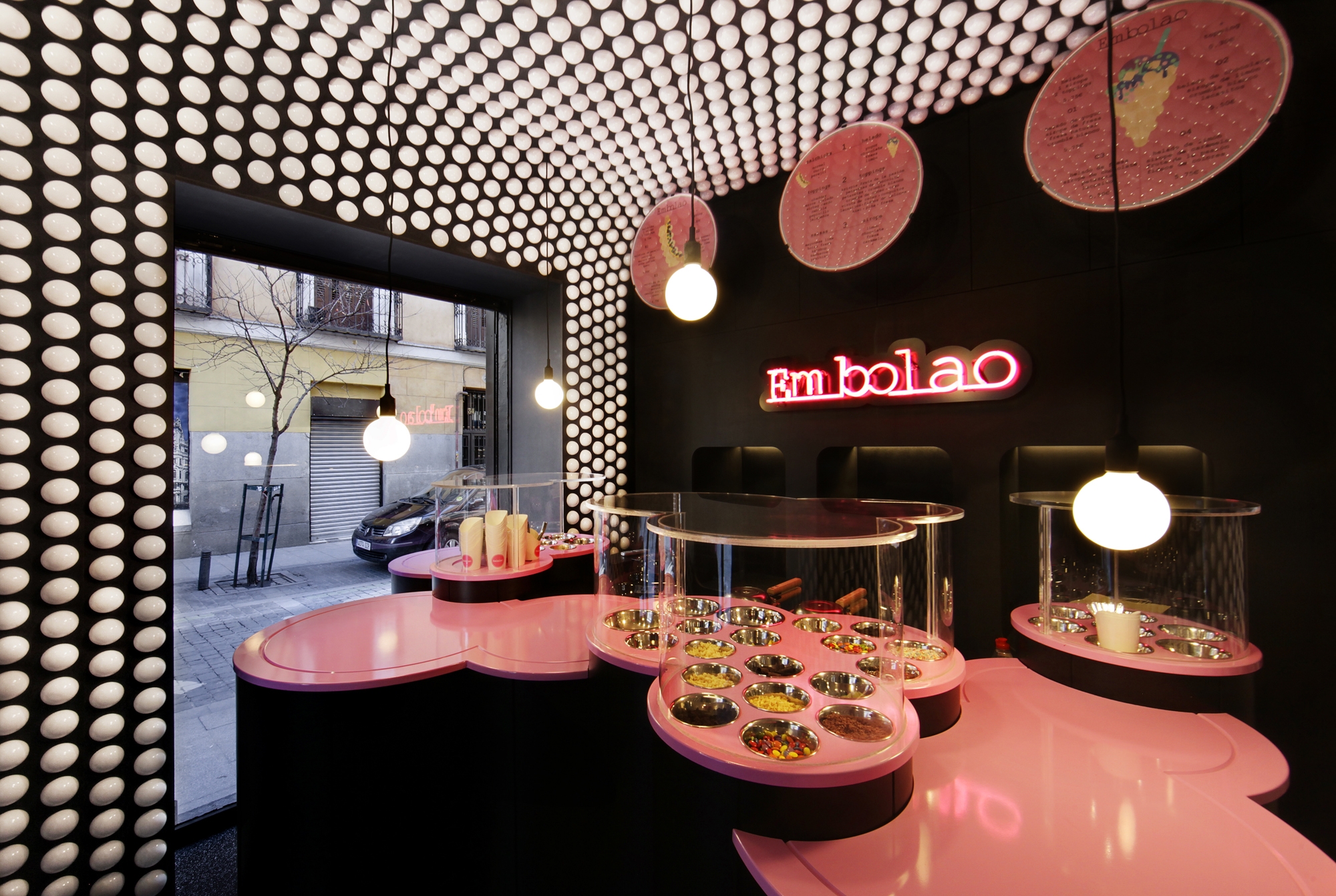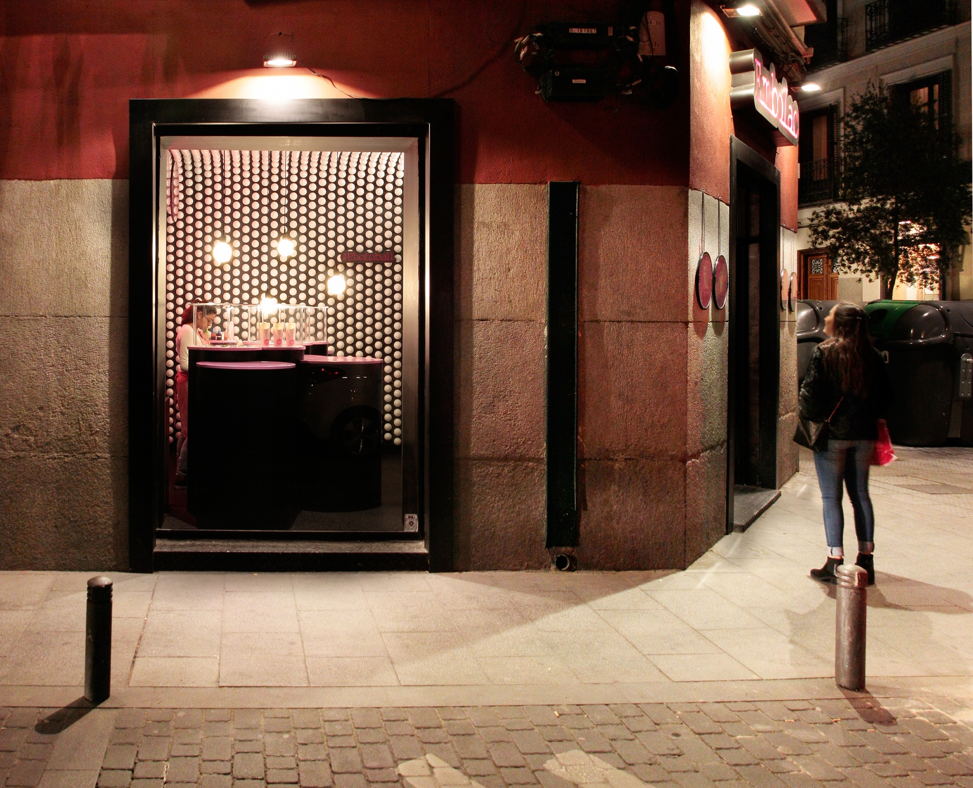 Embolao is located in the Chueca neighborhood, in downtown Madrid. Embolao is based on the concept of ‘take-away’ street food. The surface of the local is 15m2 and it also has a utilities basement for personal use. Embolao, has an architectonic system that is applied to the surrounding of the local, creating a distinctive and recognizable area due to the resembling spheres that were easily placed. For this, we used a prefabricated type of object which is decontextualized and part of the mechanism.