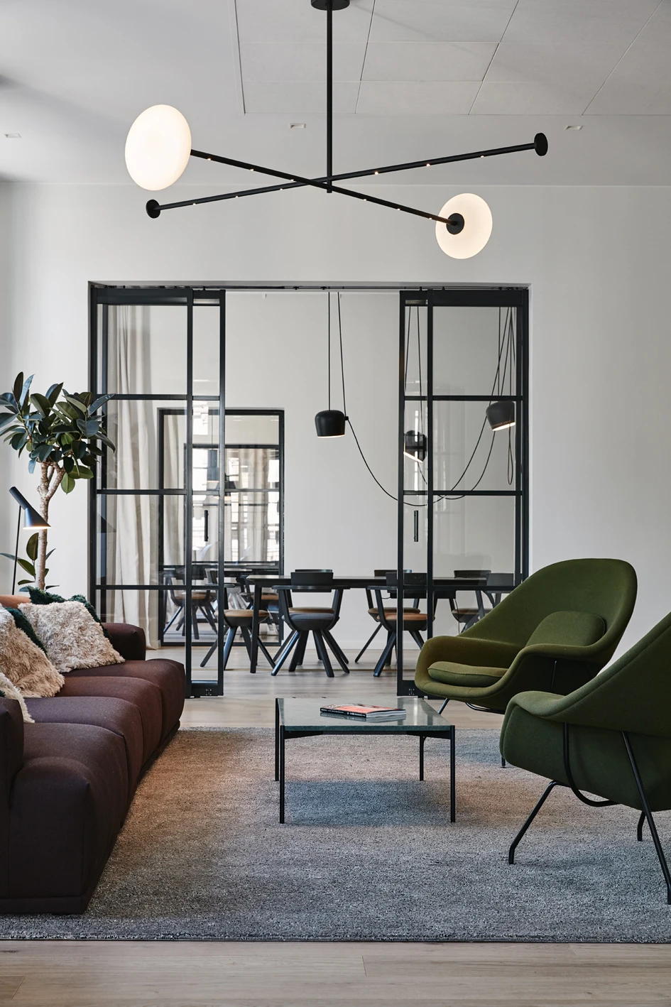 For Fjord Helsinki, it was important that most materials and pieces of furniture were of Finnish origin – without being too explicit about it. Meeting rooms are furnished with Artek Rival chairs and living rooms’ large carpets are from Woodnotes, whereas Knoll’s Womb chairs were designed by Finnish designer Eero Saarinen. Living rooms’ large lamps are called PJ01, and they were designed by Joanna Laajisto and designer Pasi Kärkkäinen. The green kitchens blend in with the natural materials, and they were furnished with Ilmari Tapiovaara’s Domus chairs as well as oak tables and benches from Nikari.