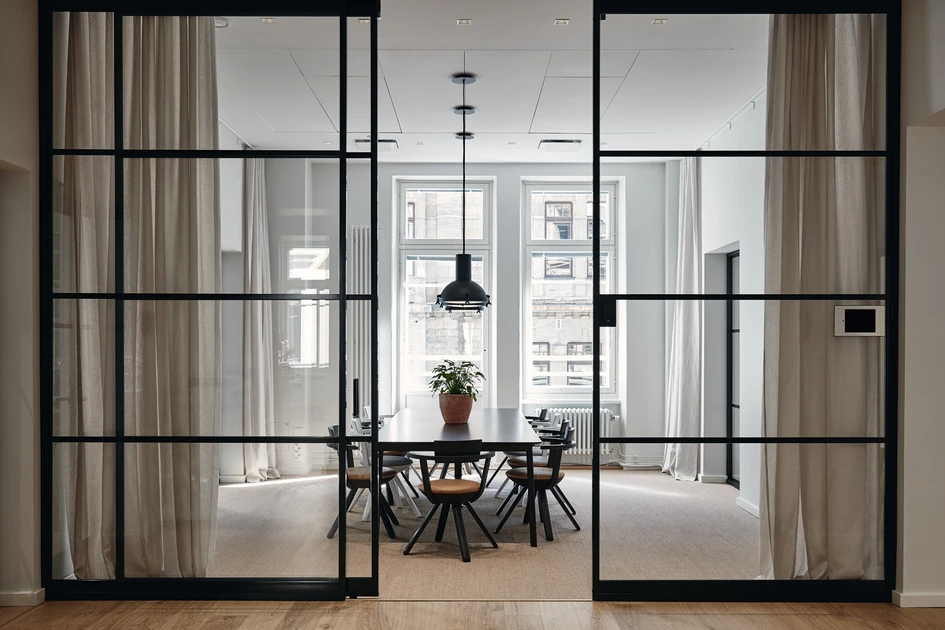 The 1000 m2 studio was furnished with natural materials of high quality: oak floors with sound-absorbing underlay, sisal carpets, and loads of plants. Light flows through the studio’s delicate, metallic room dividers, and linen curtains give privacy when needed. Instead of building a traditional office, the aim was to create an approachable, homelike workspace. Therefore, the studio includes several different kitchen and lounge spaces suitable for collaboration, creative work and casual hang-outs. Privacy can be found in comfortable phone booths lined with Kvadrat’s acoustic Soft Cell panels.