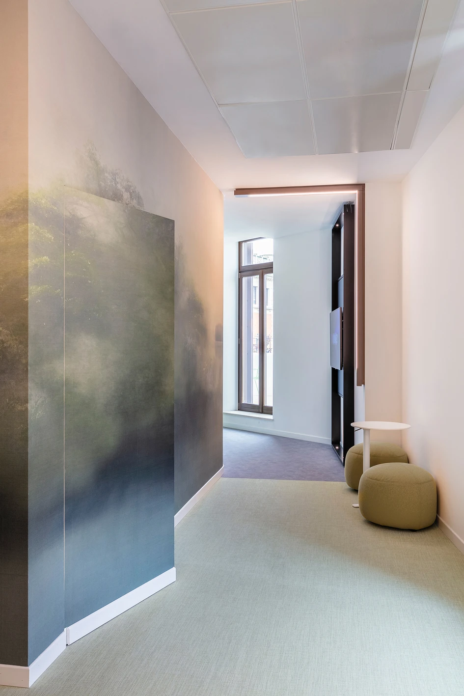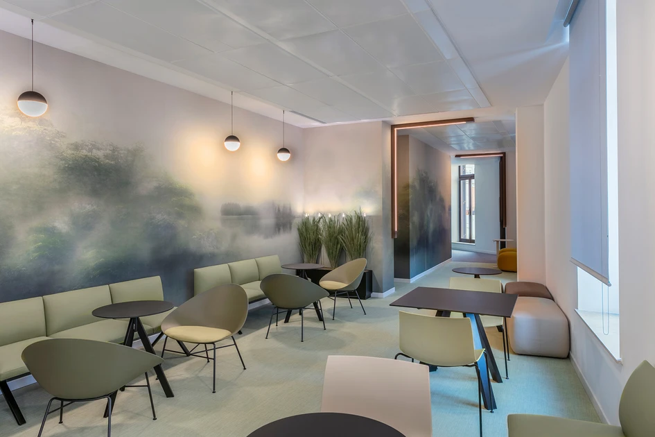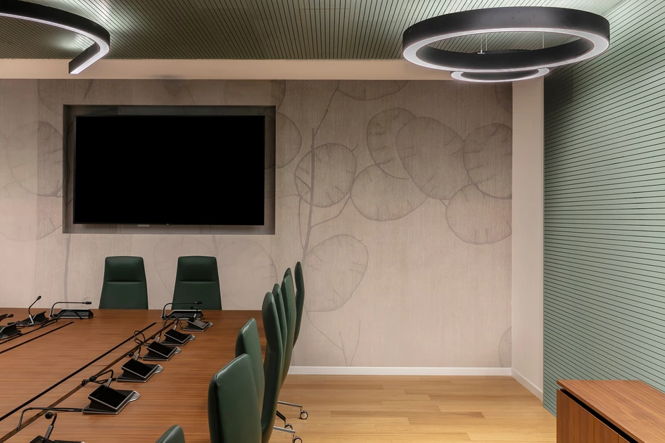 En las oficinas de espacios abiertos, definidas en parte por paredes acristaladas para lograr la máxima ósmosis visual, se utilizaron los temas Mangrove, Pure y You en los tonos cálidos de la tierra (beige y marrones), que recuerdan el travertino y la terracota, los colores típicos de la «ciudad eterna». En las zonas de descanso y de paso, en cambio, elegimos Matinée en los tonos sombreados del gris y el verde, para resaltar la importancia que la empresa dedica a la sostenibilidad. Los muebles y las luminarias también están coordinados con los revestimientos murales. En la sala de reuniones, la esencia de la madera de la gran mesa central se combina de forma natural con el verde de los sillones tapizados y los matices de los escenarios murales Mangrove.
