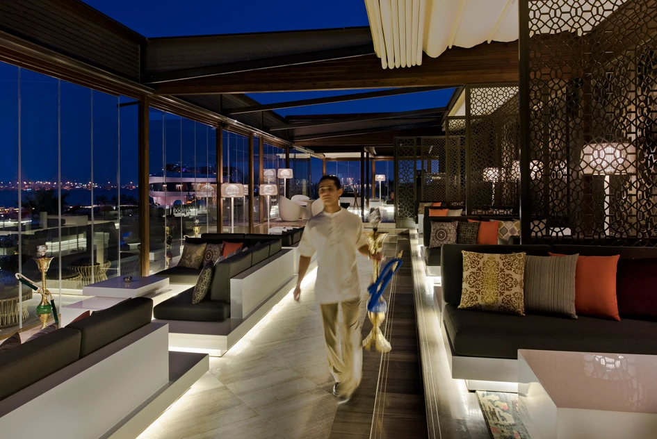 La terraza Shisha, con vistas al puerto deportivo, tiene un techo que se puede retraer para disfrutar del sol y la brisa en un ambiente relajado.