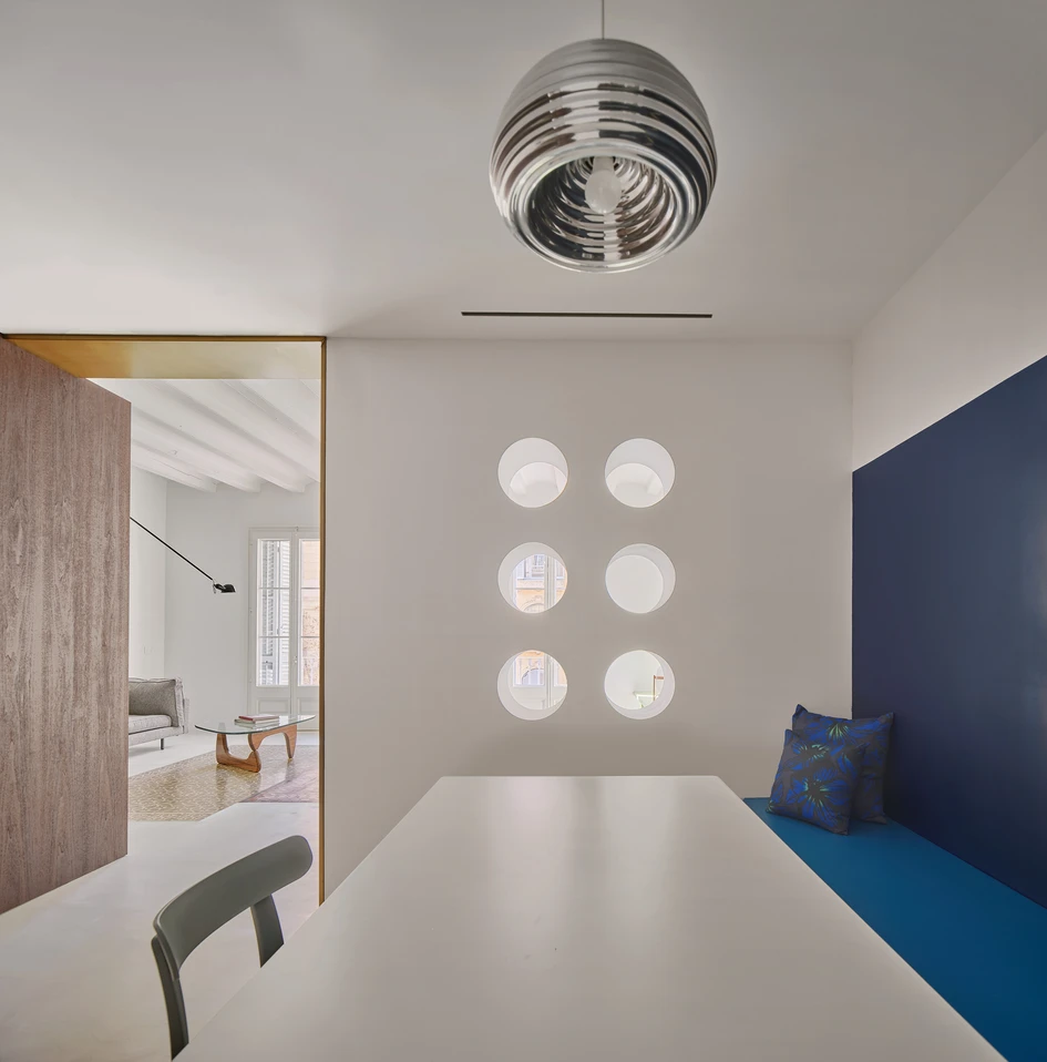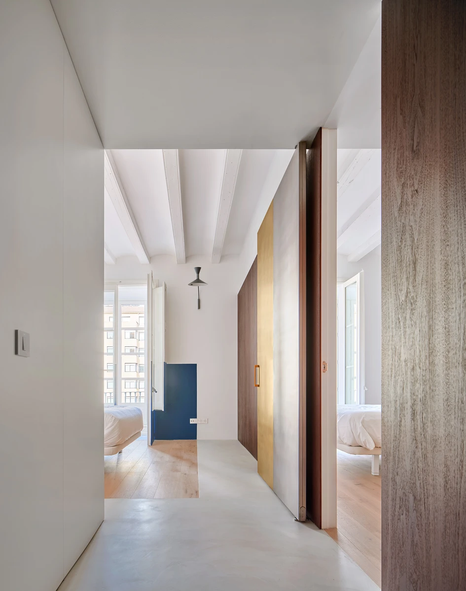 This spacious and large apartment is located in a noble estate from the end of the 19th century, and enjoys a privileged position facing both Girona street and a large interior courtyard typical of the Barcelona ‘eixample’, additionally, the apartment enjoys extra ventilation and lighting through a beautiful interior patio with wooden carpentry and tinted glass. This condition of the apartment is precisely what dictated its transformation and refurbishment: a long walnut wood front, dark and elegant, with an open pore, starts from the living room next to Girona street, and runs the entire length of the apartment, 21 meters, until it reaches the gallery that leads to the inner courtyard of the block. Along this interior wooden façade, spaces with a more collective use follow one another, and their width is always oversized, to be living spaces, not just passing-through, mixing rooms with a more defined use, such as the living room or the dining room, with other more ambiguous ones, such as the cozy space next to the interior patio, which receives light through the original blue-tinted windows. The importance of this interior cutting plane/facade is reinforced by providing it with a beginning and an end: in the living room, a 'picture' of brass and stainless steel finishes it off; towards the gallery, a pivot door of the same dimensions receives the same materials, but this time it changes position, insinuating an immaterial union of these two metal fronts at each end of the plan. Beyond this pivot door, the wooden front slips into the room to indicate that this space has a hybrid label, being able to be both a bedroom and a room for common use.