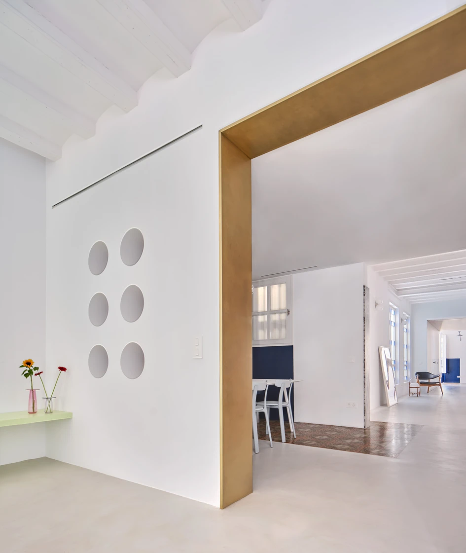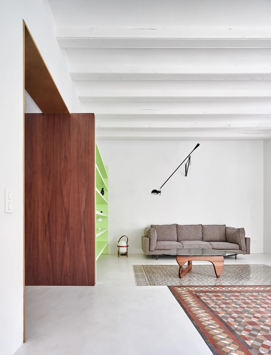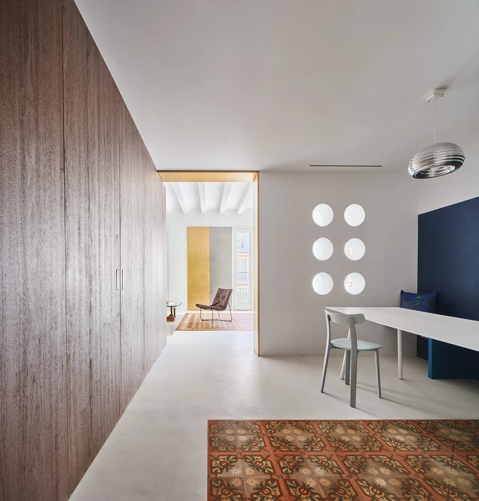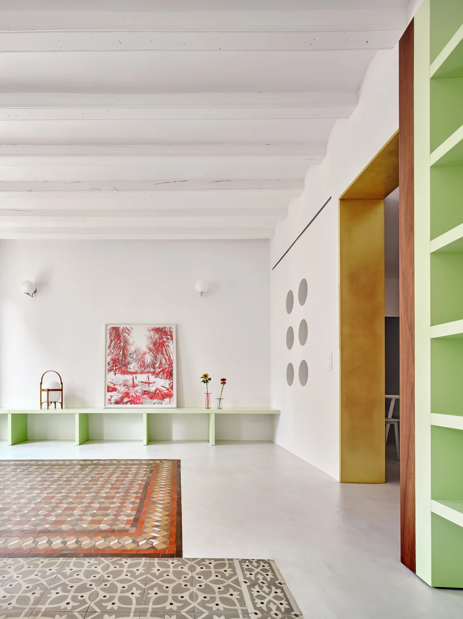 All the common spaces are united by the same white microcement flooring, while recovered hydraulic mosaic floors are arranged in strategic places; continuing the axis of the wooden plane towards the living room by means of two types of mosaic sliding between each other, or welcoming in the access and directing the steps towards the dining room. For the rest, different pieces of integrated furniture, all designed specifically, use color tones intentionally far from the colors of the mosaics or wood, adding counterpoints of color to a mostly calm interior.