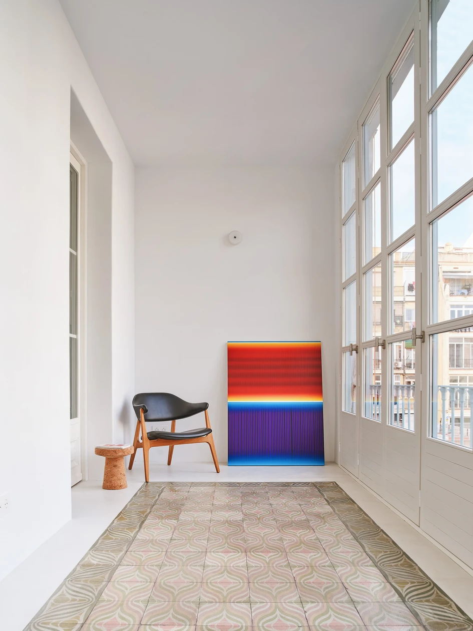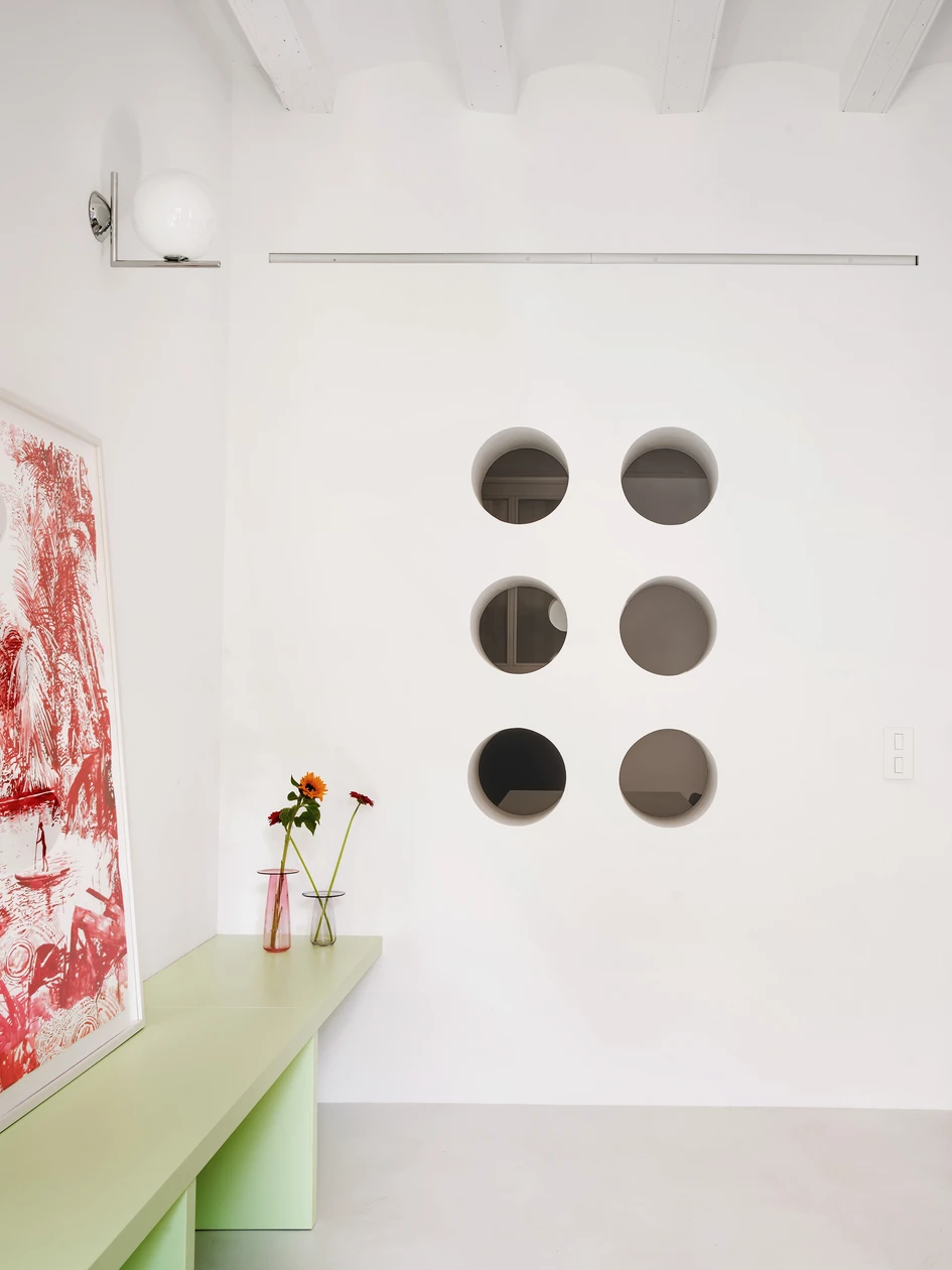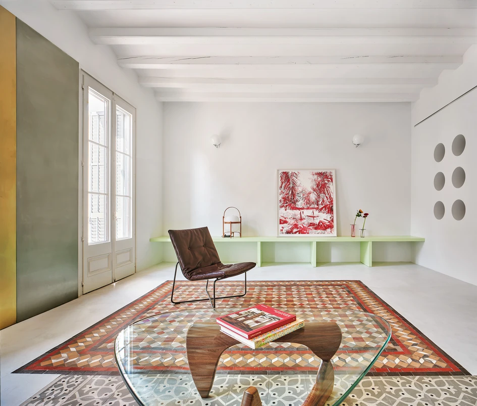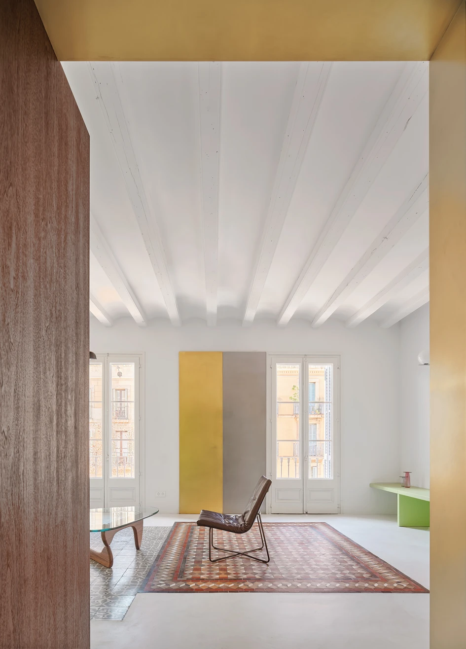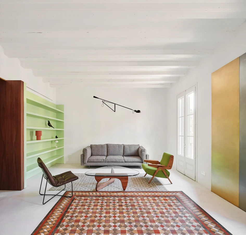 All the common spaces are united by the same white microcement flooring, while recovered hydraulic mosaic floors are arranged in strategic places; continuing the axis of the wooden plane towards the living room by means of two types of mosaic sliding between each other, or welcoming in the access and directing the steps towards the dining room. For the rest, different pieces of integrated furniture, all designed specifically, use color tones intentionally far from the colors of the mosaics or wood, adding counterpoints of color to a mostly calm interior.
