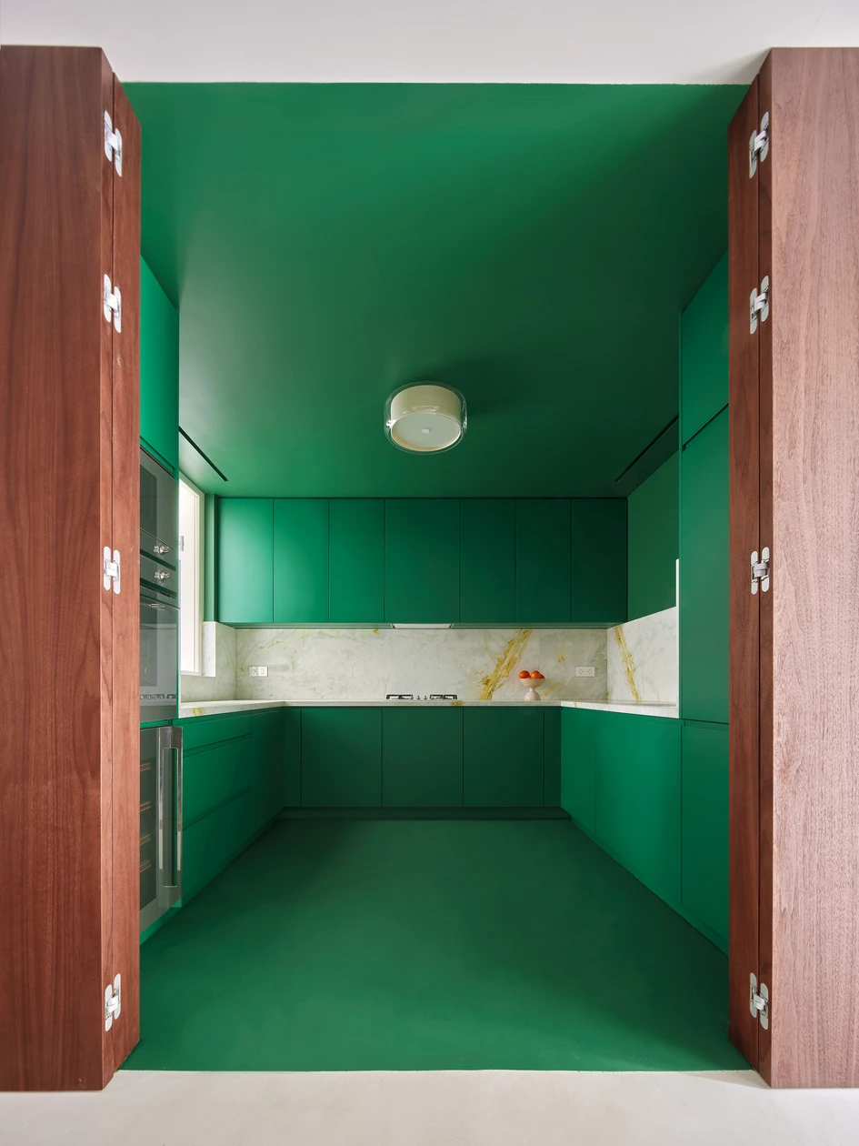 On the other side of the walnut façade, are the rooms that are more private or in need of privacy. Their entrances are hidden from the front, with all the flush doors, and each of these spaces follows its own law, as if they were independent rooms that share the same access street: the kitchen opens onto the dining room like a green world with a white and yellowish band on the marble front; the shared bathroom plays with different niches and shades of green and yellow, matt and shiny, while the bedrooms are calmer environments with oak wood floors and accents in blue through wall coverings or textile designs by Catalina Montaña, made expressly for this project.