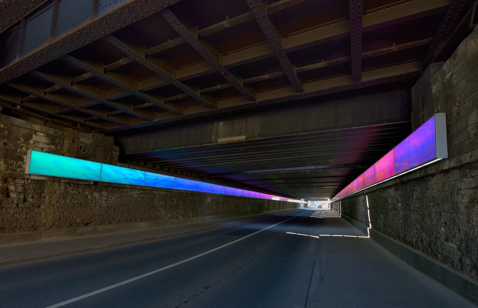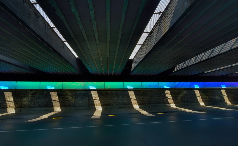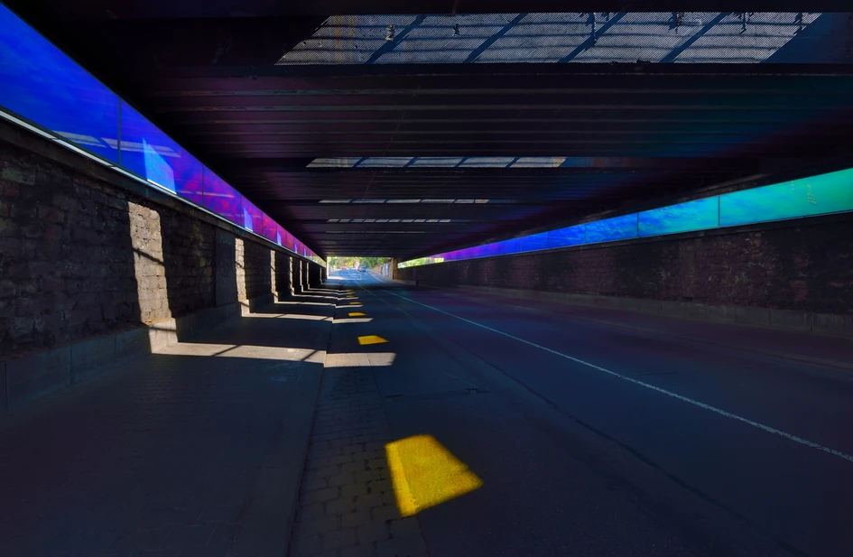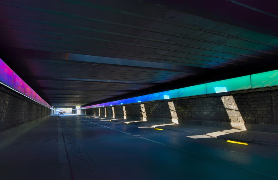 Because - in contrast to darkness - light and colour are experienced in a positive way, moving through the tunnel the observers experience is stimulating and no longer repelling. Since its refurbishment the Goethe Tunnel has risen above ist purely functional neccessity, becoming an attractive entryway to Mainz Neustadt.