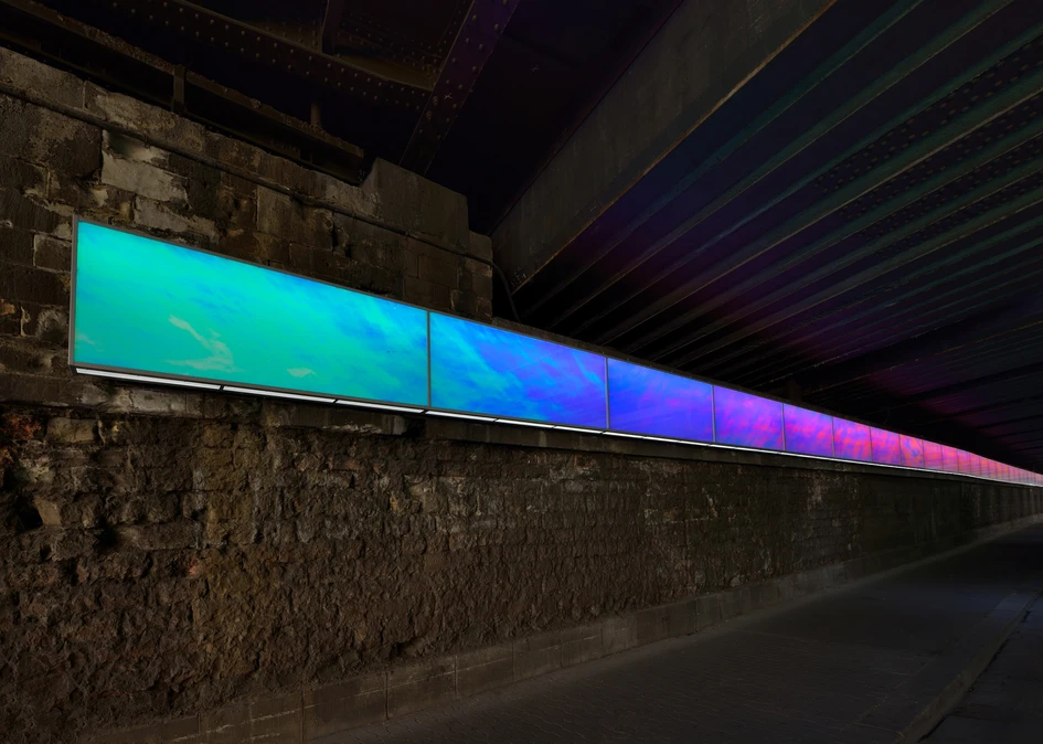 The foil creates an ever changing colour spectrum featuring all colours of the rainbow. Whilst the observer moves through the tunnel the colours constantly shift, creating an interactive experience.