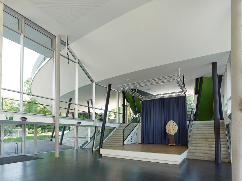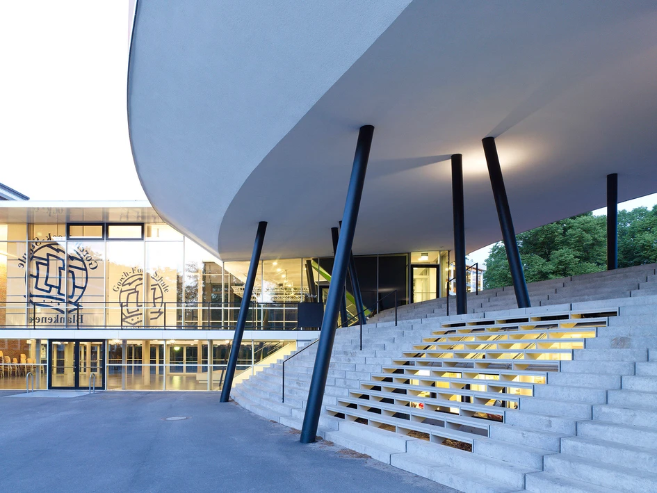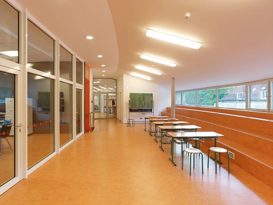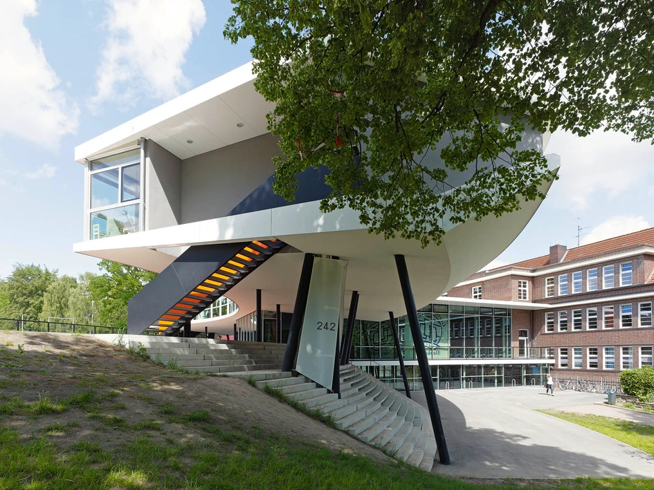 This enlargement of the school represents further development of the historic building designed by Fritz Schumacher back in 1931 via the new auditorium while equally taking advantage of the difference in elevation on the grounds to reconceive the facilities for sports. The new assembly hall / auditorium annexed to the south containing a stage, servery for food and a terrace facing south combines the old and new buildings across the schoolyard and beyond. On the other hand, the new classrooms do not follow the symmetrical guideline set by the red-brick construction but are instead aligned with the running track on the sports area situated above – allowing corresponding options for expansion. As a result, the first-formers receive space for themselves beyond the track, while the last forms prepare themselves symbolically for ‘take-off’ to schools of higher education. Due to the curved, open-sided storey and the wing-like layout of the group zones enlarged by the mandatory corridor width, the view from the old building remains relatively unimpaired.