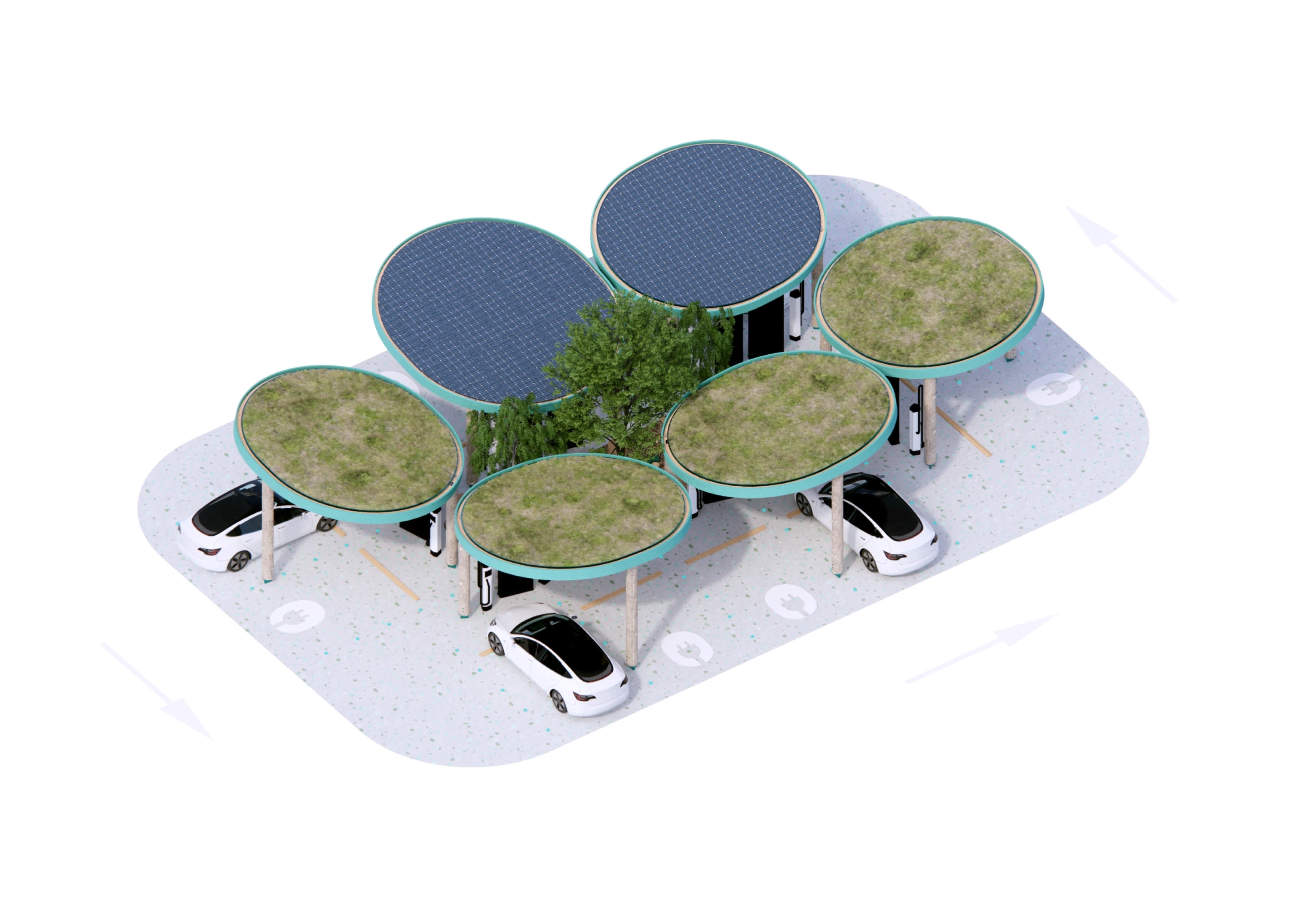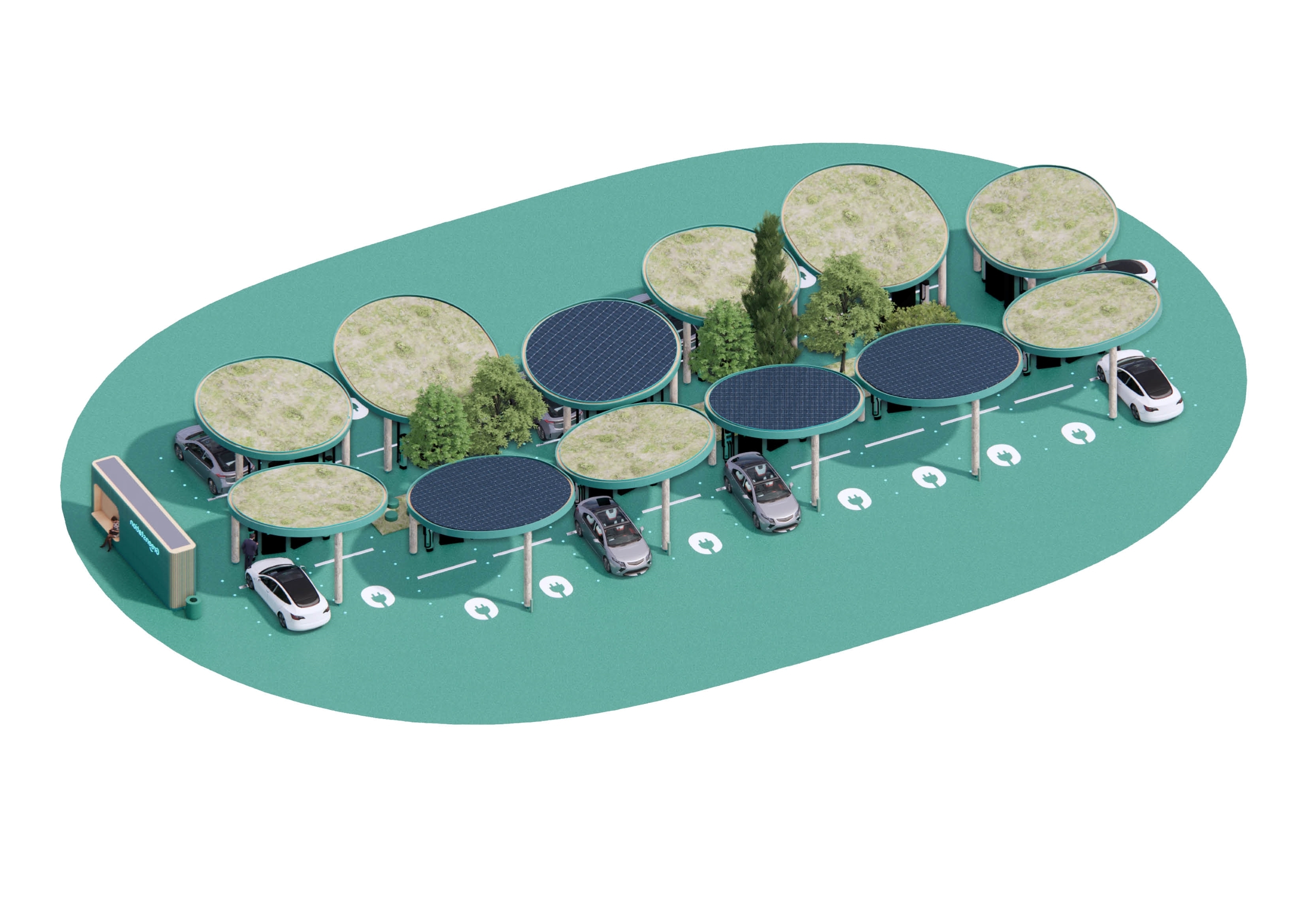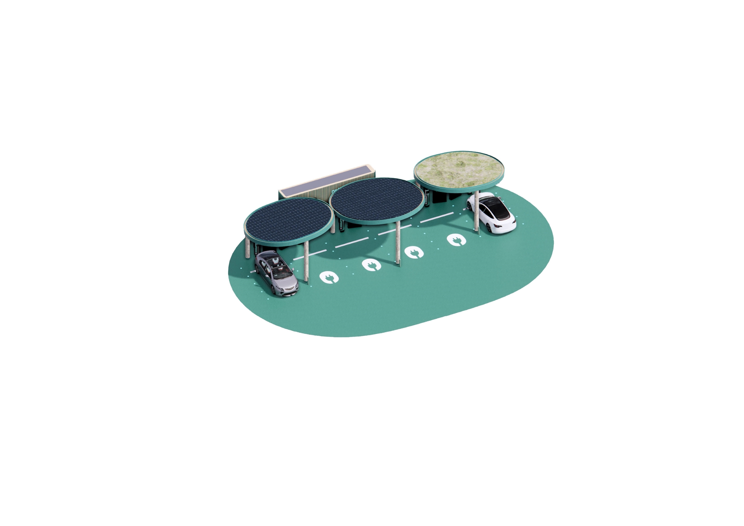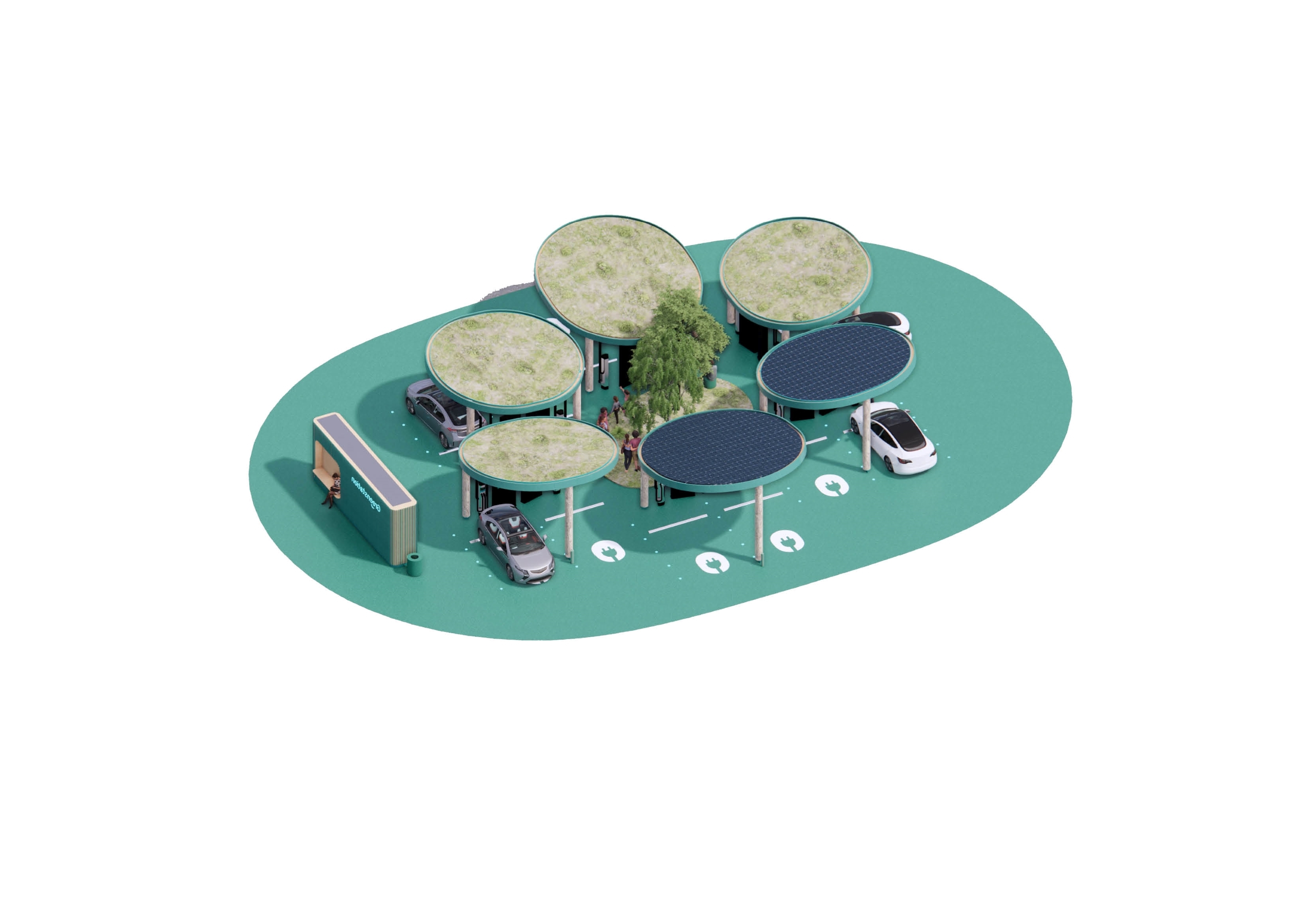 LOCAL has been working in close collaboration with them to develop the energy station of the future. The project is based on a 100% wooden canopy that can be implemented at different scales from 2 charging points up to 24. We are not building a roof but a landscape where the elements together create a dynamic and welcoming environment. The top is either planted soil of wild local vegetation or sedum with the alternative of also providing solar panels.