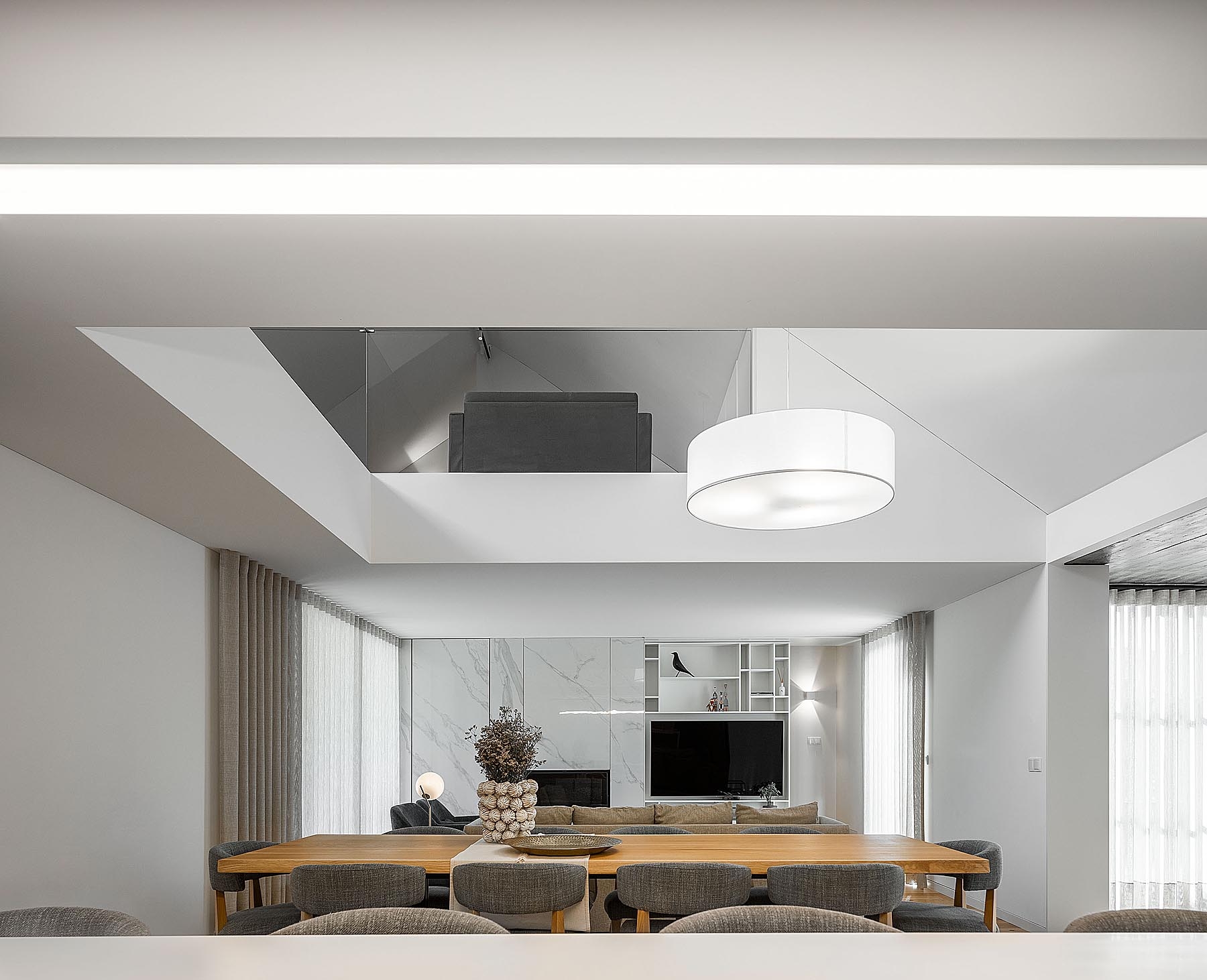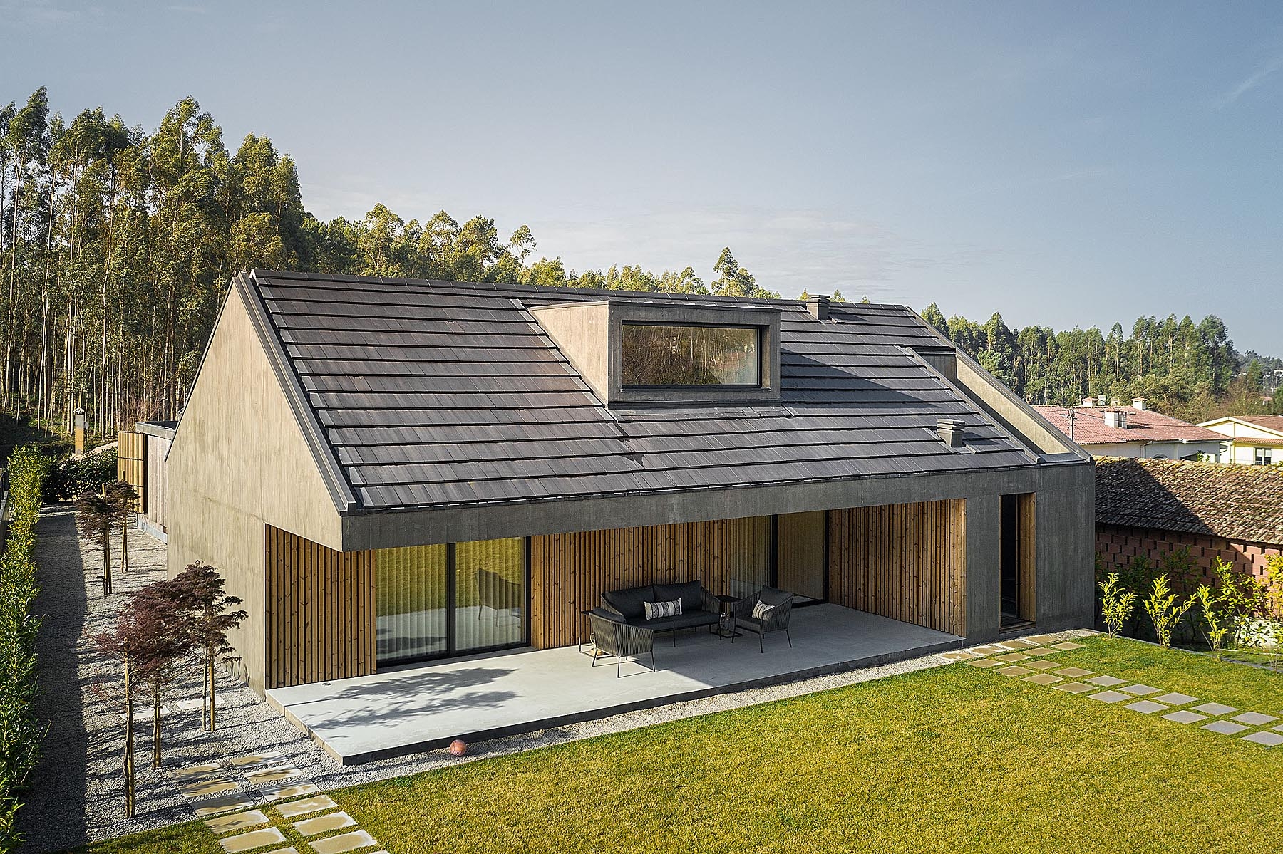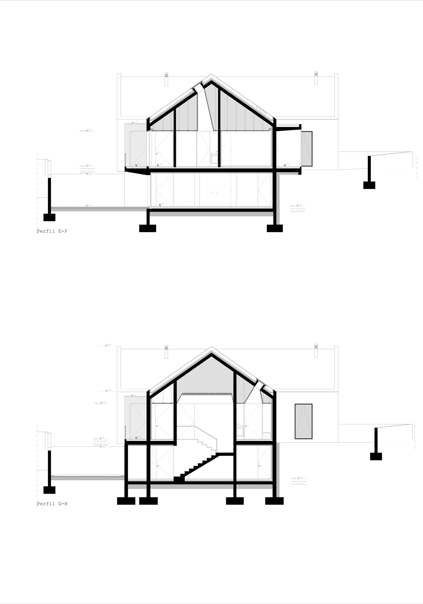 A set of volumes draw the house that embodies a recognisable archetype and divides the intimate and social area, separating the bedrooms from the kitchen and living rooms. These volumes are organised in different orientations in search of the best relationship between them, and each other with the outside.
