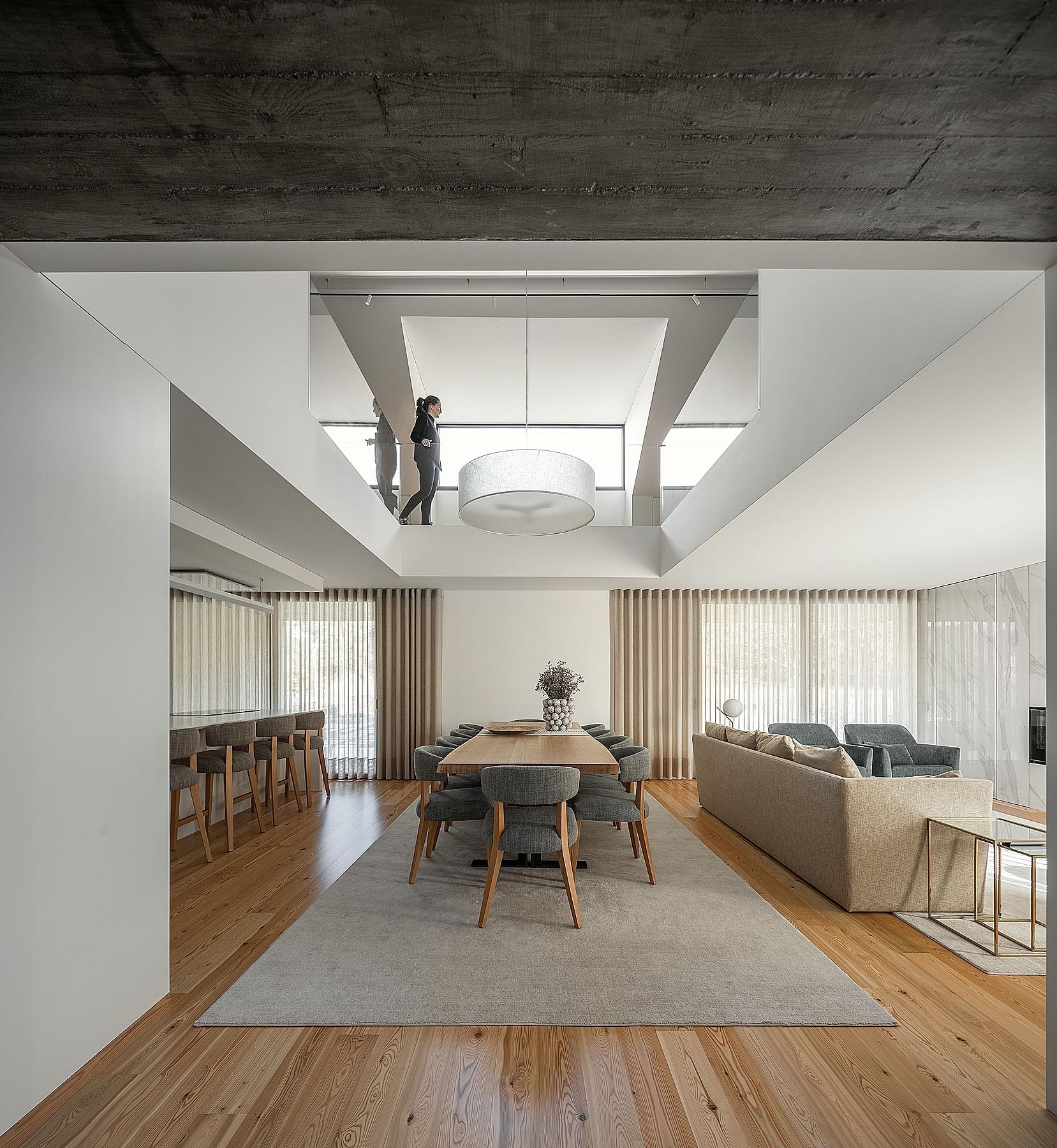 The intimate area, on the other hand, confines a covered outdoor space providing privacy and allowing, simultaneously, natural light to flood the interior.