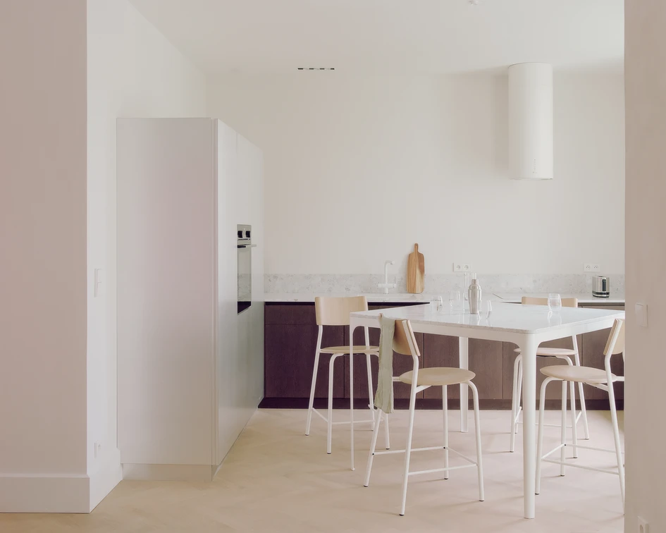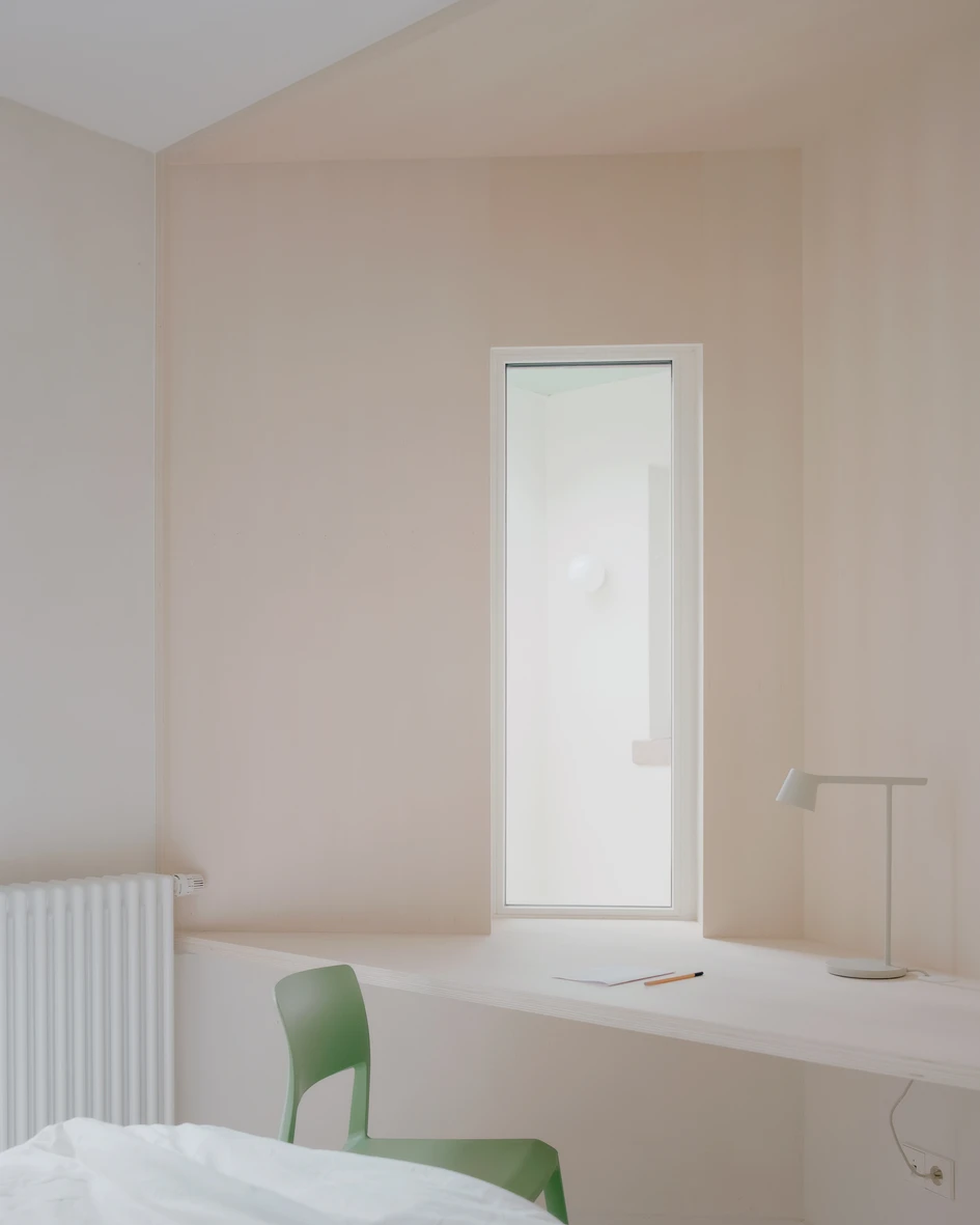 On the second floor, a wall clad in pink felt provides a gentle transition between the various rooms in the living area. On the top floor, several light wells are created to naturally illuminate circulation and wet rooms. The existing staircase, enhanced by a large glass roof and a continuous, full-height balustrade, brings light into the heart of the building.