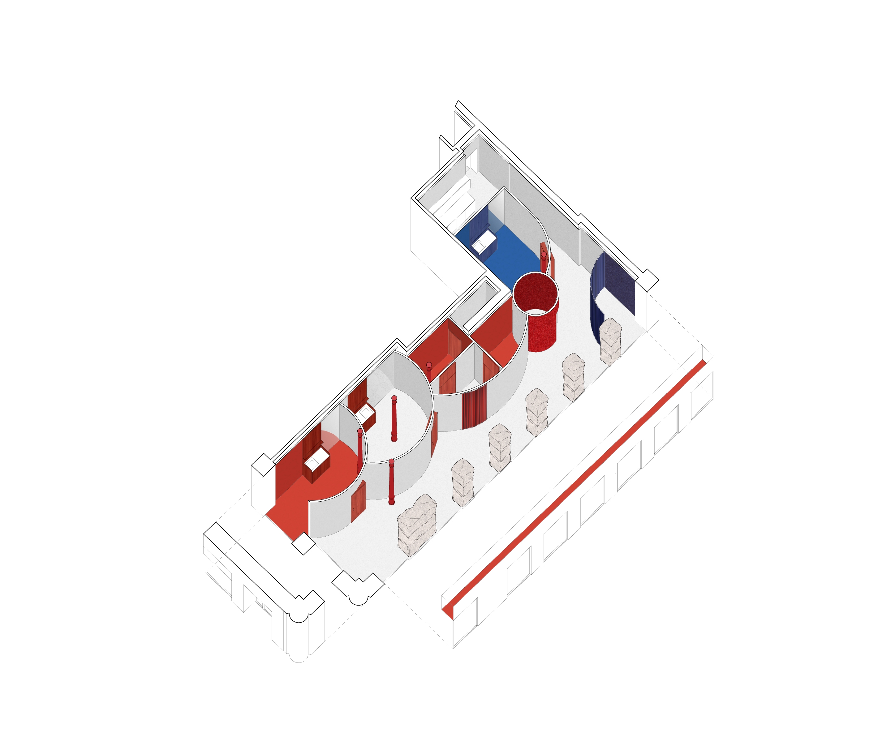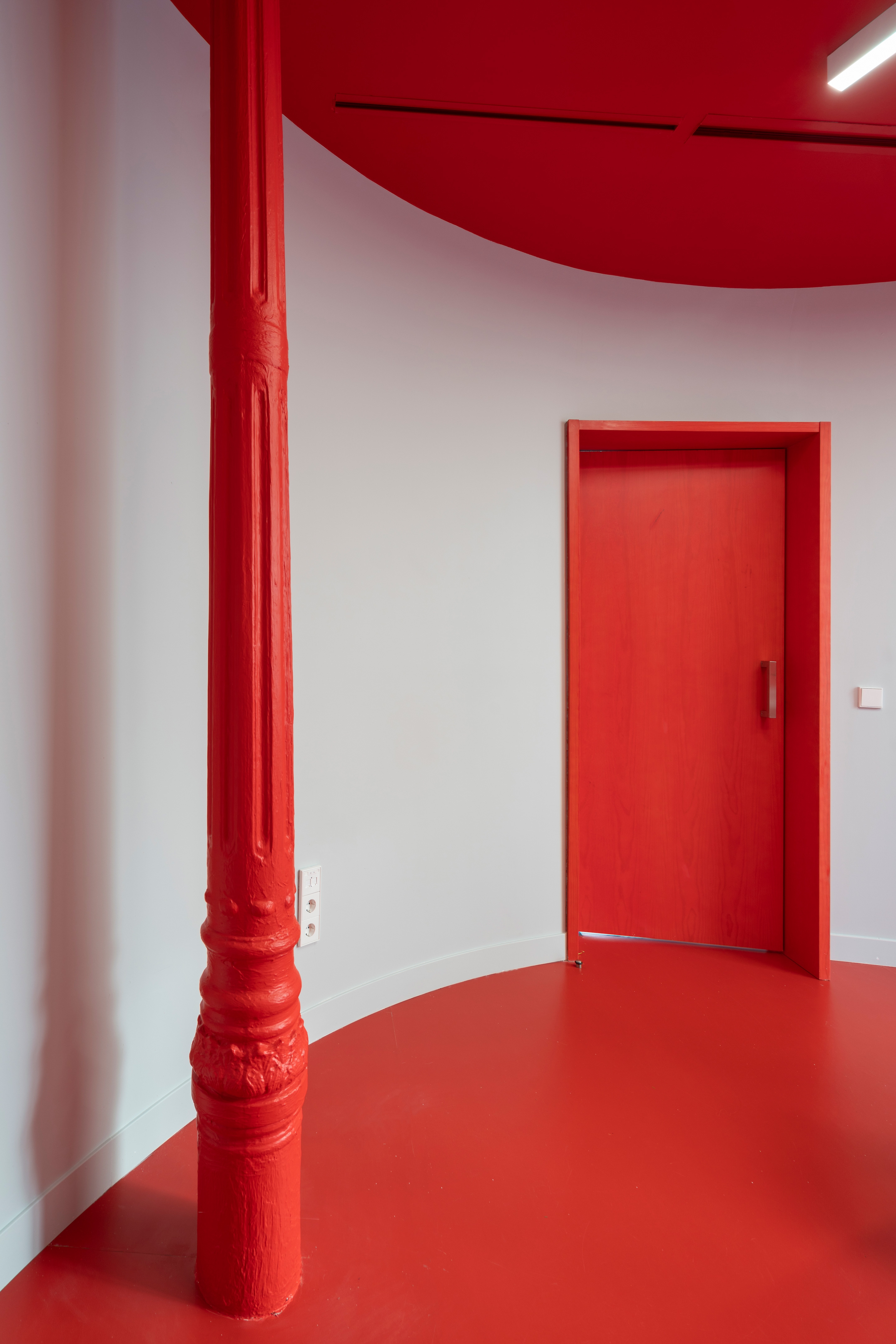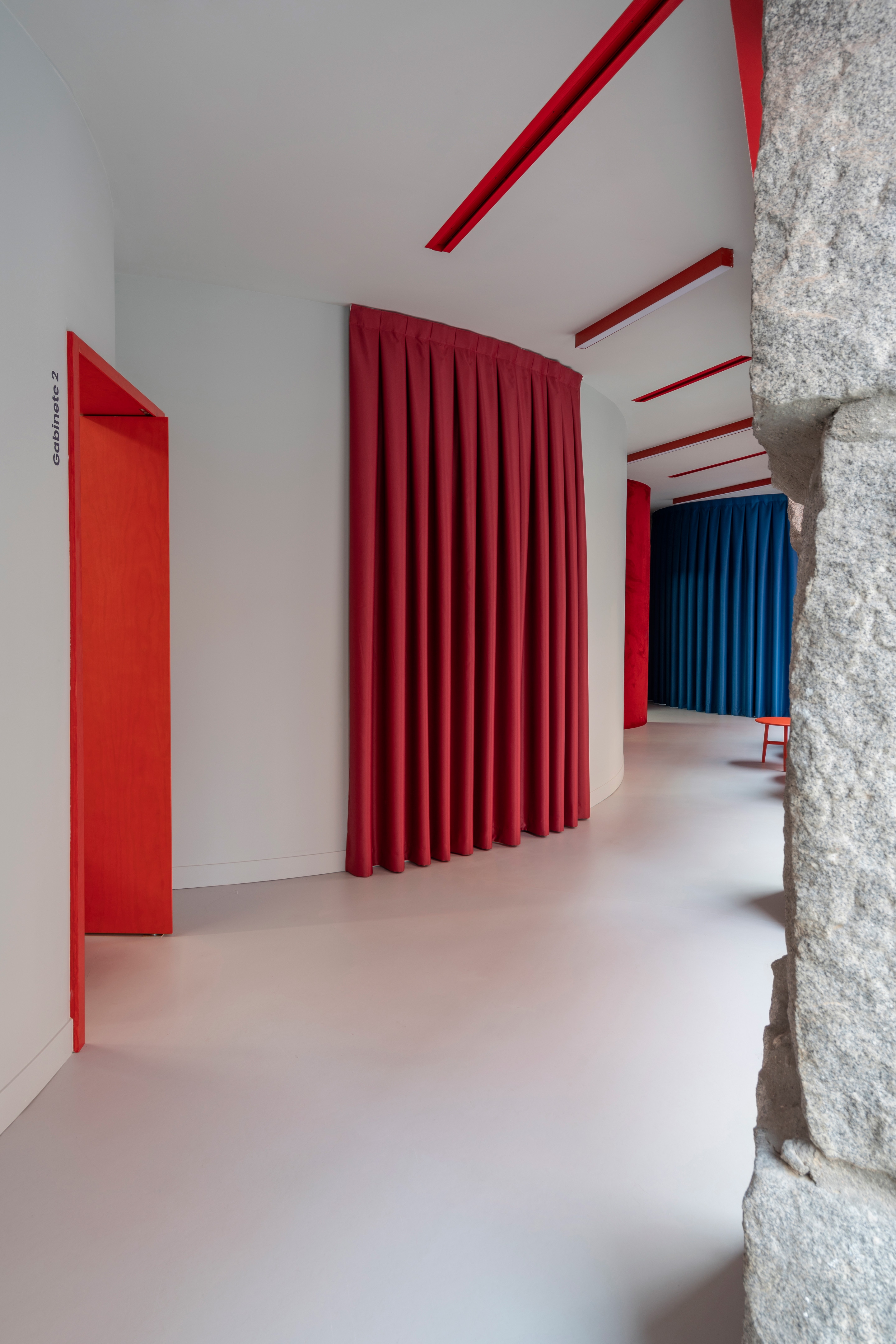 This new clinic for Impress in Madrid is located on a busy corner of Carranza street, where a line of huge granite ashlars delimits the perimeter towards the street, while inside, slender and refined wrought iron columns make the counterpoint to the ashlars. This striking contrast between these two porticoes guided the design process: a series of curves in the form of cylinders crowd the interior party wall and play with the wrought iron columns, leaving them inside or outside them, while leaving an empty space towards the stone ashlars, where the lobby and the waiting area are resolved, always in close contact with the street. In this way, a dialectic game is created between the enormous stone pillars, which are given space to be seen, and the curves and iron pillars, which appear, in contrast, as fragile planes and lines that approach and move away from the ashlars. Even the iron columns themselves have been painted red, giving them a more playful character compared to the stony seriousness of the granite.