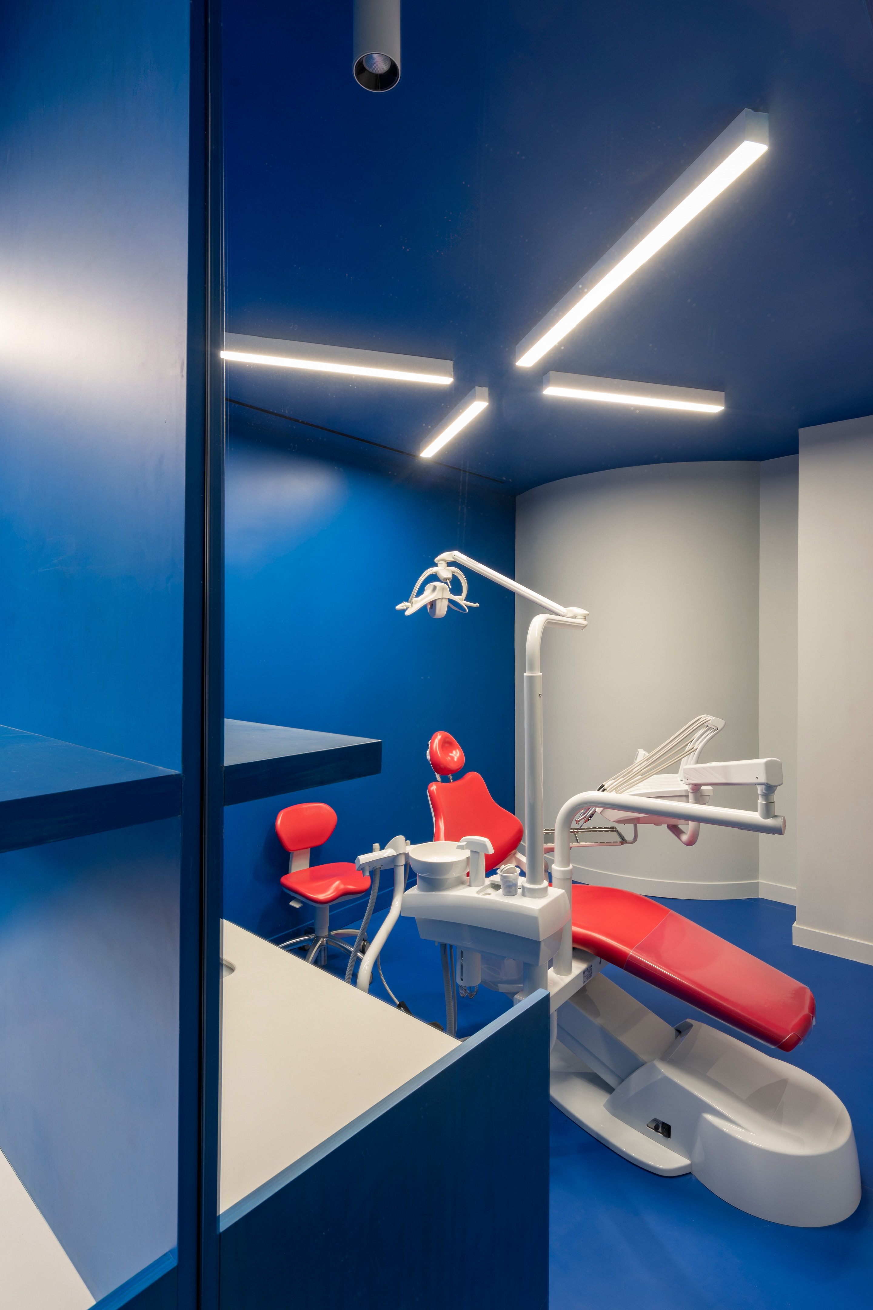 The hall/waiting area, developed longitudinally in close contact with the outside, is stained gray, both on the linoleum floor and on the lacquered walls, where the ashlars, clearly outlined by a red soffit, stand out for their massiveness. The doors, blocks of wood tinted red, announce the passage to other rooms (dental boxes, X-ray and toilets), where the color codes change in each one of them. Thus, the three corporate colors of Impress, red, gray and blue, star in each of the three boxes, applied indistinctly.