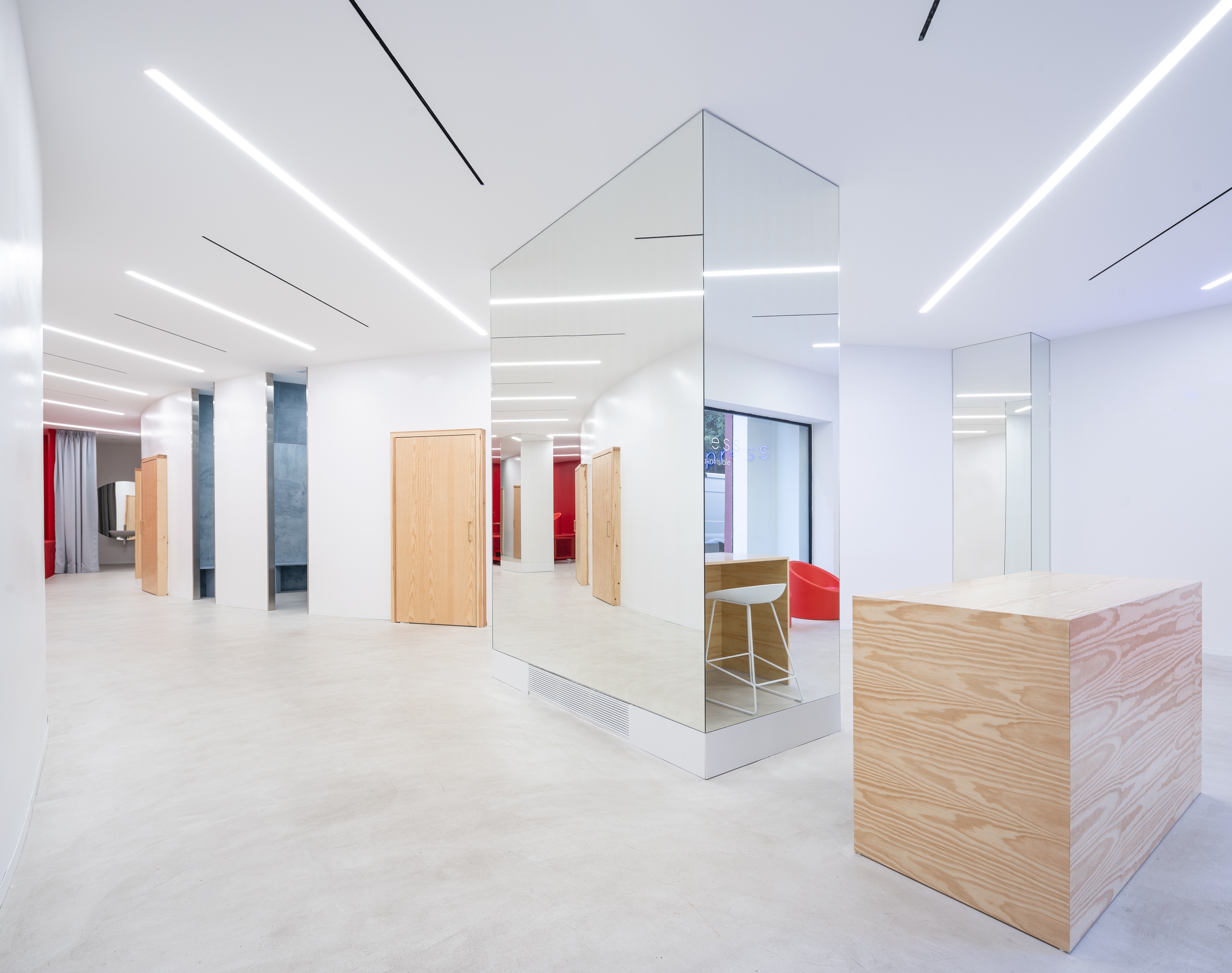 La clínica de Impress en Valencia se ubica en un local de forma irregular, alargado y con poco frente a la calle. Un aparcamiento subterráneo genera una elevación del suelo en la parte trasera del espacio.