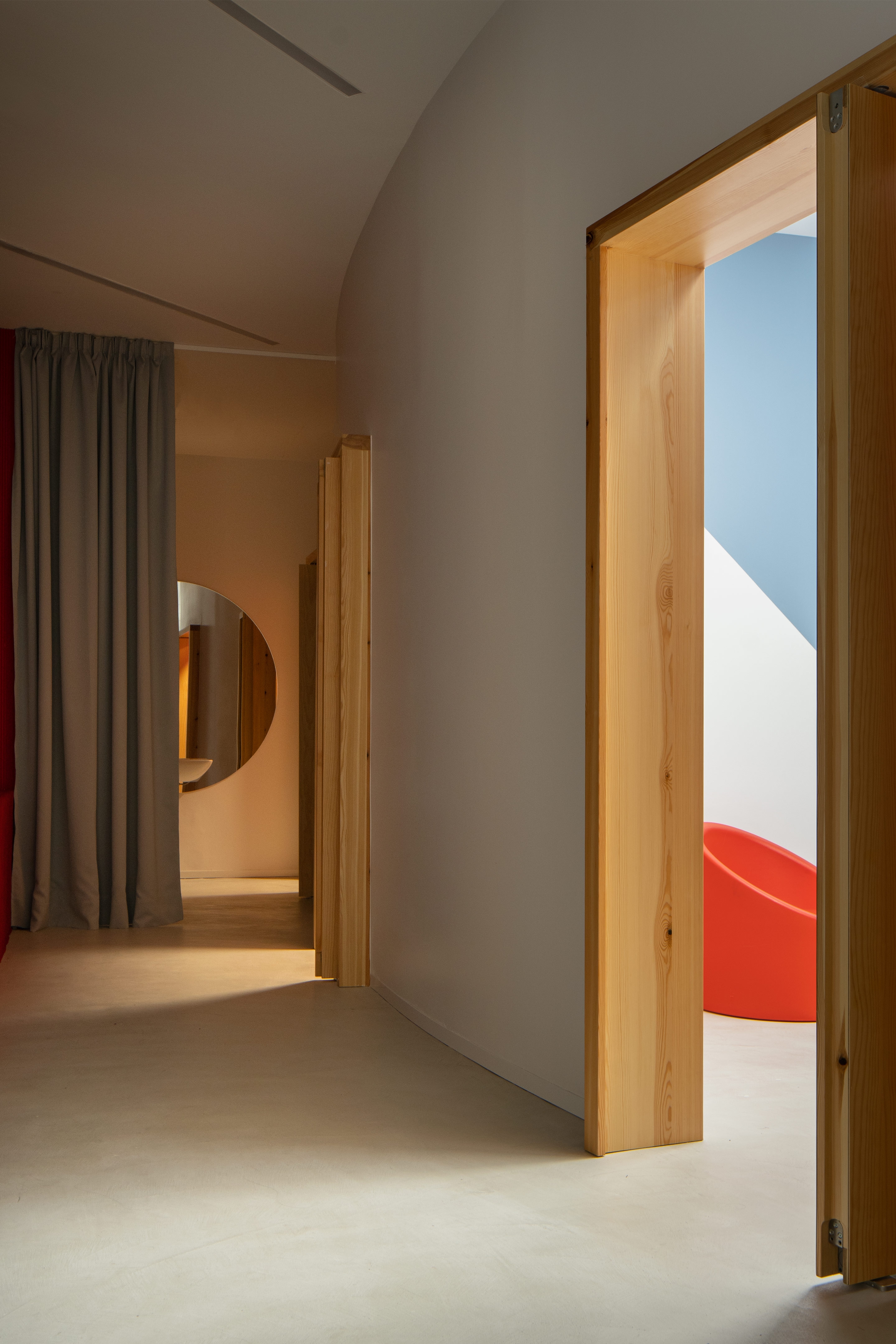 Las curvas dominan el espacio, y los elementos existentes (pilares) que quedan entre ambas se tratan con espejos, para borrar las barreras espaciales y añadir complejidad espacial mediante los reflejos. Las curvas están lacadas en blanco, y las puertas de acceso a los gabinetes con cajas de madera de pino, incrustadas en las curvas. En el interior de los gabinetes, azules y blancos juegan en diseños diagonales, las cuales son un referente de la marca, y que significa la apuesta de Impress por clínicas dentales de nueva generación. En el techo se reproduce la dirección diagonal en la posición de luminarias y rejillas. Los puntos de venta se resuelven en tonos azules, recubriendo las paredes con moquetas, y ejecutando el mobiliario in situ con tableros de fibras coloreados en masa. Los tonos rojos del fondo son precisamente un reclamo para convertir la que a priori era la zona más residual y oscura en la zona más especial de la clínica.