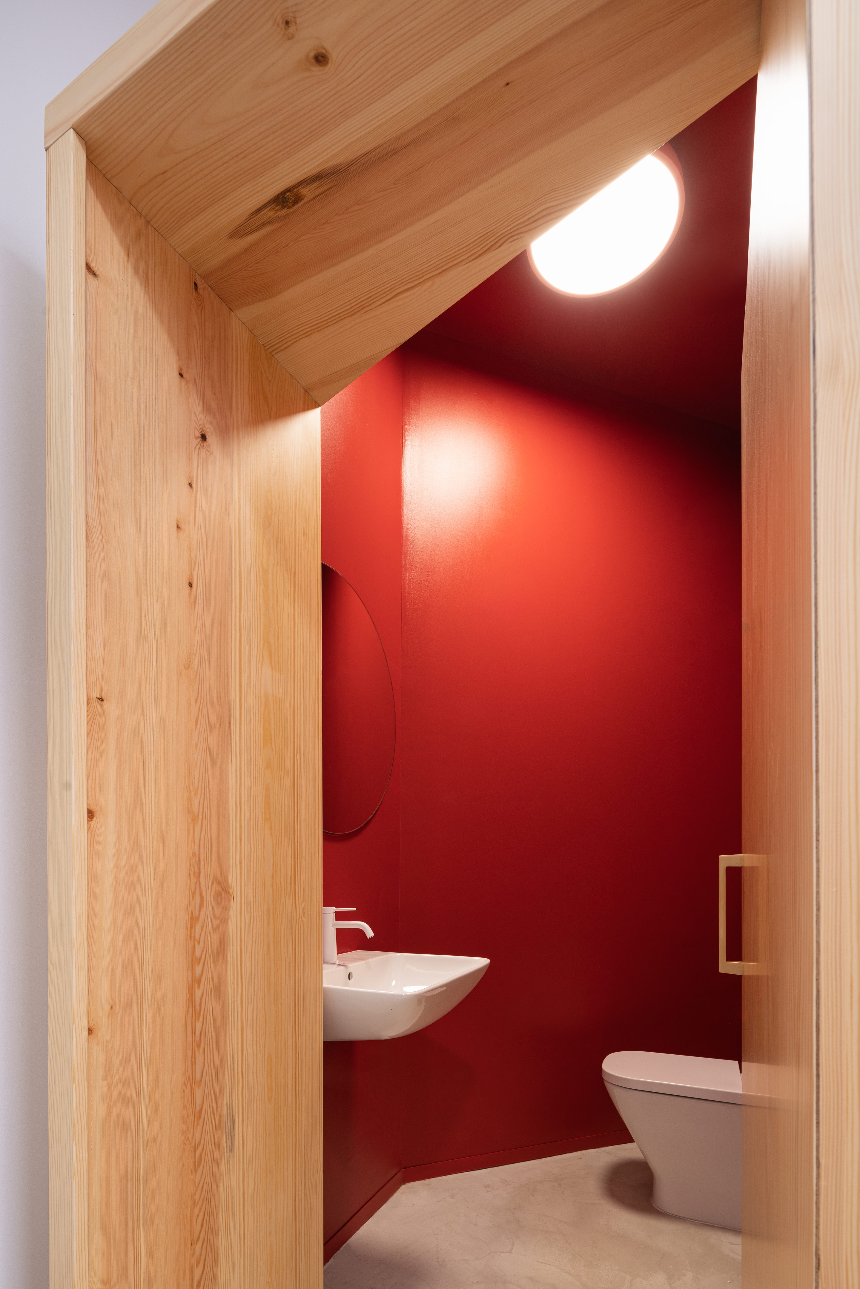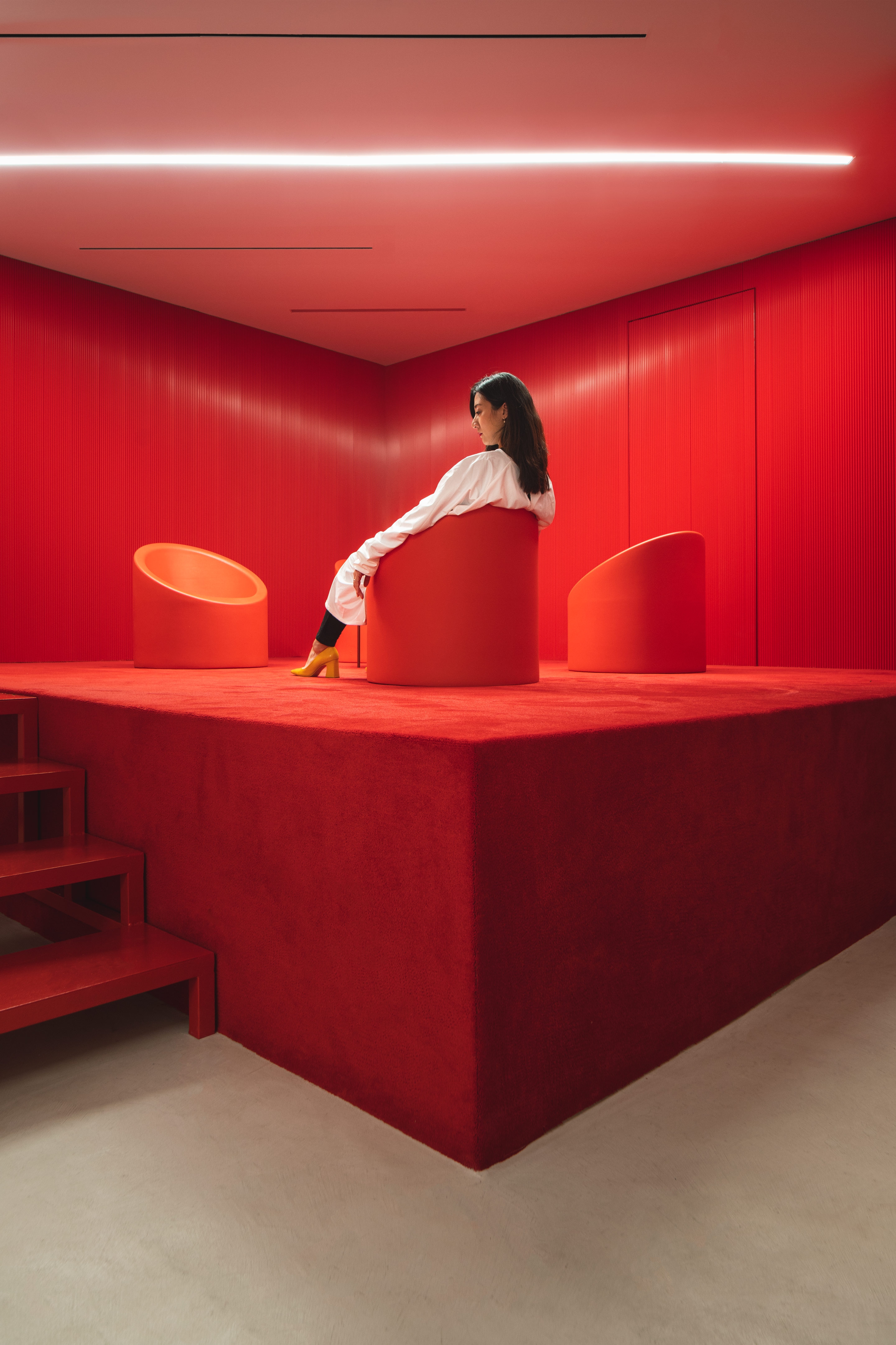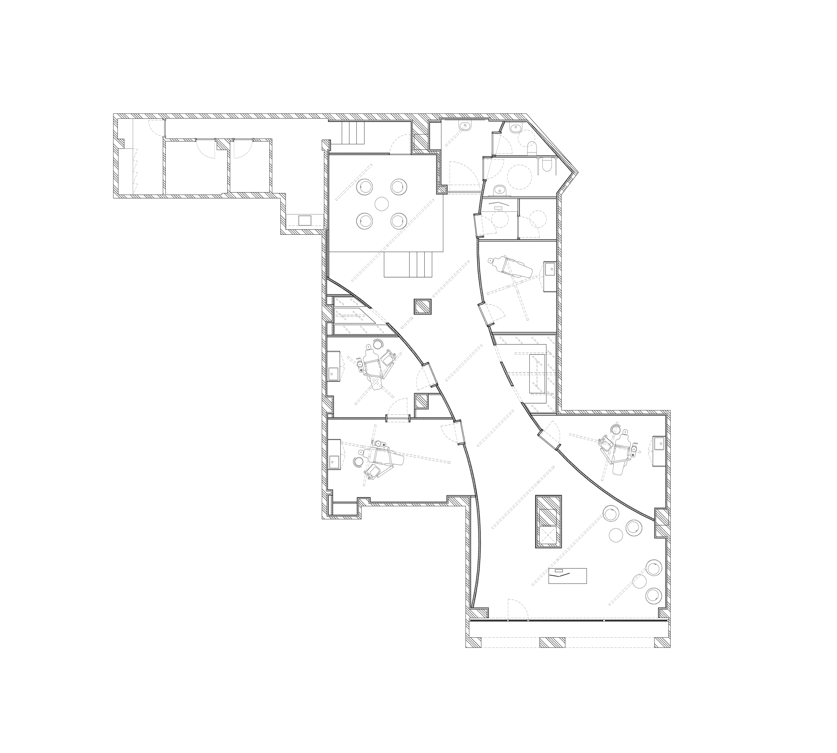 El diseño toma en cuenta la peculiar geometría del espacio y propone dos curvas que se van acercando y alejando, jugando entre ellas, y encerrando detrás todos los espacios funcionales (boxes dentales, puntos de venta, aseos…). Estas curvas, que recrean de forma sutil el logo de Impress en planta, difuminan el clásico planteamiento de pasillos y puertas de clínicas de este tipo, dejando entre medias espacios suficientemente amplios como para ser estancias donde sentarse, convirtiendo todo esta zona central en una gran sala de espera, desde la que en todo momento se tiene contacto con la entrada de luz por la fachada a la calle. El espacio elevado del fondo se aprovecha precisamente para crear una zona de escenario, donde organizar eventos, conciertos, o demostraciones de los tratamientos de Impress. Esta zona trasera se ha tratado como un punto especial, al ser el área hacia donde se dirigen las dos curvas en planta. Moquetas rojas recubren el suelo, y planchas de chapa del mismo color recubren las paredes, jugando con el color rojo corporativo para crear una fuerte sensación espacial, con un guiño a Twin Peaks (David Lynch).