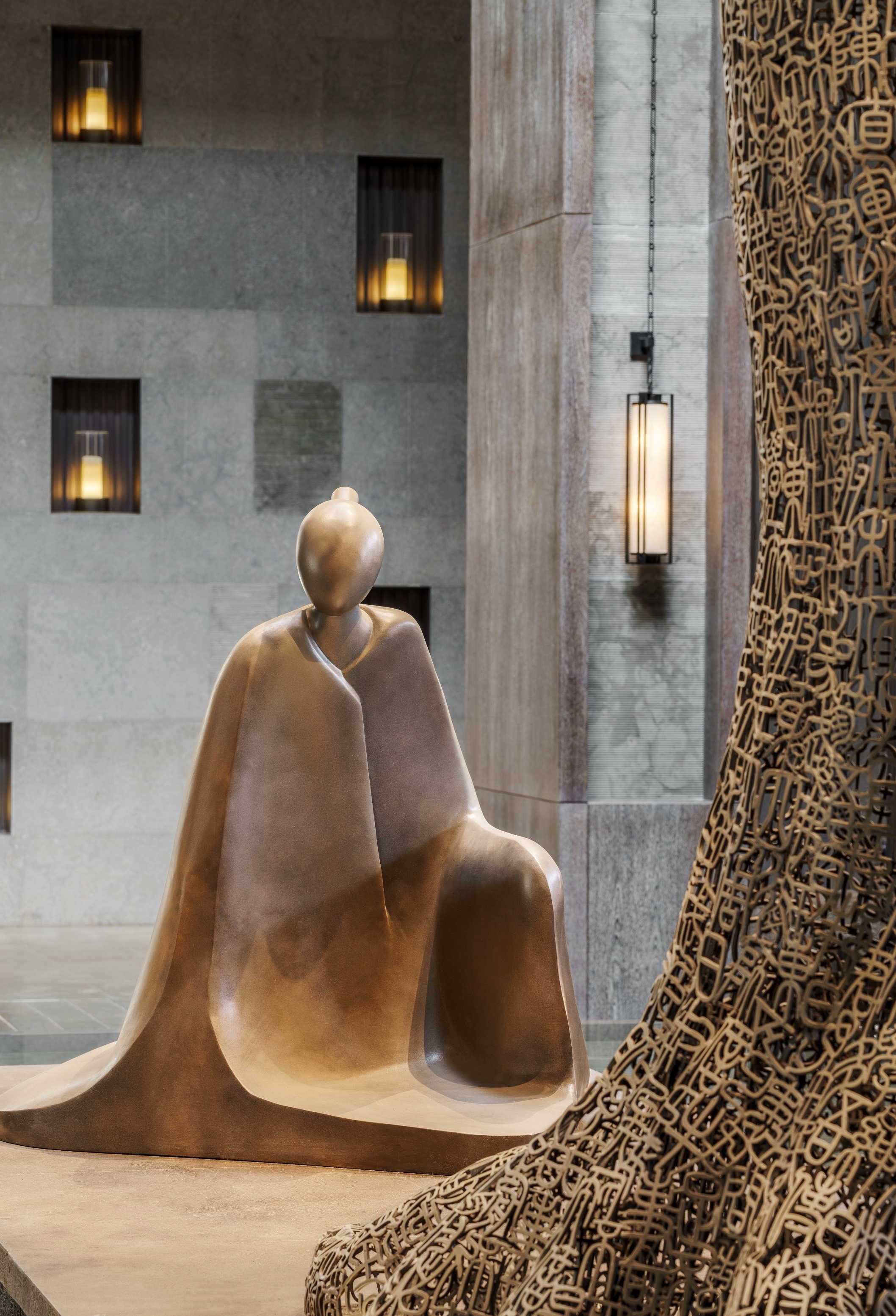 Stepping into the Lobby, guests are met with a stone relief wall depicting tales of Confucian history. Graced with slate tiles, grey stone features, and bronze lattice with white ceramic ornaments, the Lobby emulates an outdoor courtyard. Sitting atop a raised stone pond at the lobby’s Atrium, a poetic allusion of “The Great Teacher” takes centre-stage: A statue of Confucius courteously kneels before a seven-metre-tall gingko tree art installation, created with intricately weaved metallic scriptures.