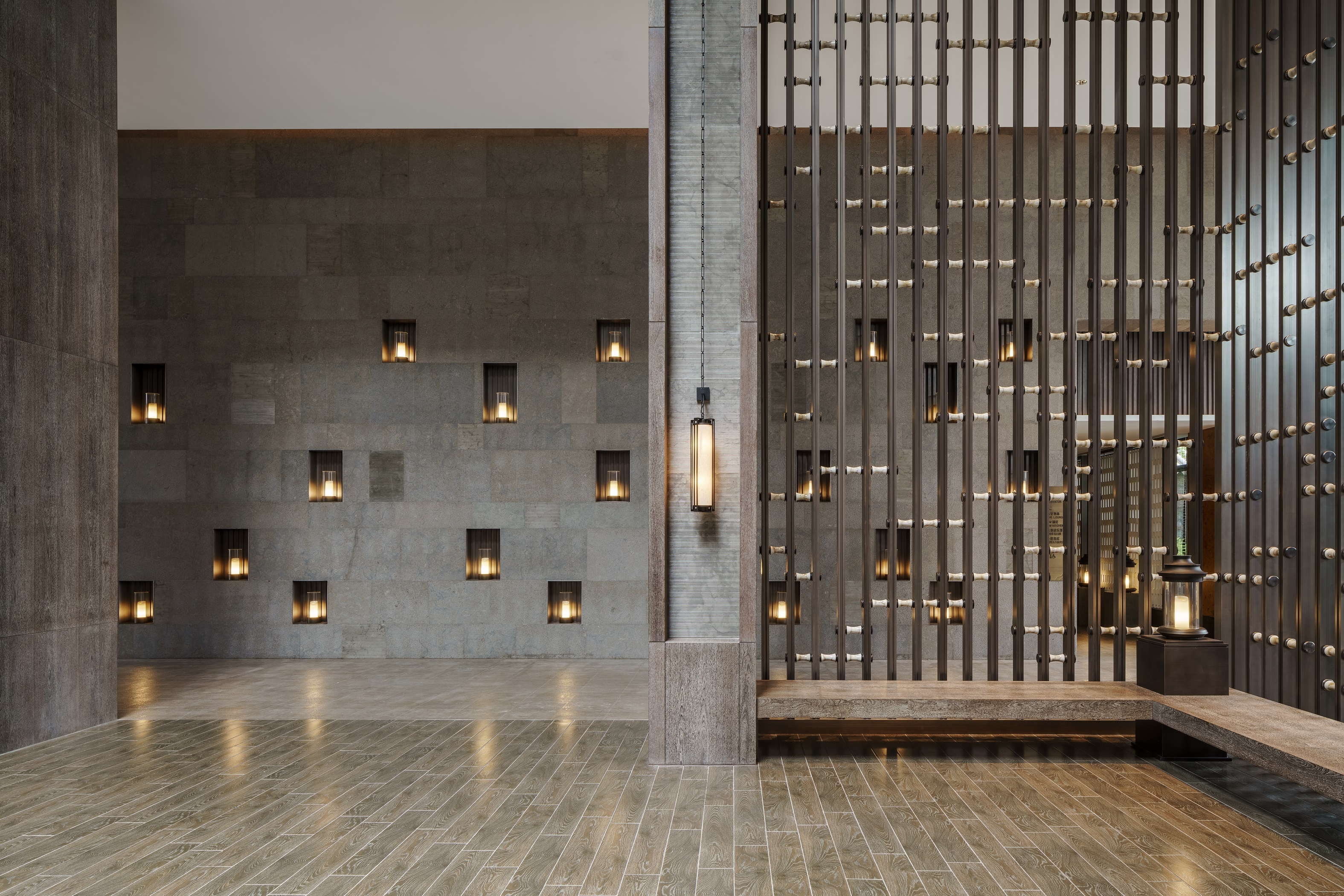 Public and private spaces are partitioned by white ceramic lattice, accessorised by figures of the Disciples and artistic representations of books, and musical instruments. To the right of the Lobby, a grey stone wall encased with small glass lanterns illuminates the hallway leading to the restaurant spaces. Boasting a full view of the courtyard, the All-Day Dining Area is complete with dark timber tiles, complemented by textured walls and tawny brown leather seating, providing flexibility of functions for groups and private dining.