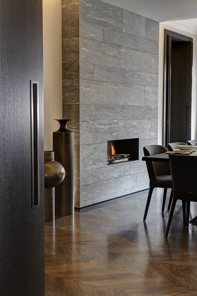 The stone floor and silk-clad walls of the hallway sets the material scene for the apartment. A hidden passage through to the private areas of the house allows for a user vs guest experience: function is always considered first, but as the apartment has such a focus on entertaining it was important to prioritise the sense of arrival. From the hallway, the kitchen can be glimpsed at the top of the stairs, and beyond it, the exceptional views onto the elegant garden. These important front rooms with their repeated windows are the perfect location for the house’s entertaining spaces. Symmetrical openings between these rooms in turn emphasise the central feature of the space: the remaining chimney breast. This strong vertical plane was clad in vals stone on all sides and a double sided contemporary fireplace (its opening size dictated by the existing flues) added a function and focus for both rooms. Continuity between reception, dining room and kitchen was further achieved by the seamless flow of chevron wooden flooring delicately detailed with ebony borders and a bronze inlay. The exceptional layered selection of textures, materials and decorative lighting create a compelling yet calm journey from one space to another. In the private spaces the walls are softened with textured silk and linen and clever joinery conceals modern conveniences. The bathrooms are another exercise in subtle drama: characterful stone contrasts against thoroughly modern ceramics from Armani Casa with beautiful rose gold brassware accents.