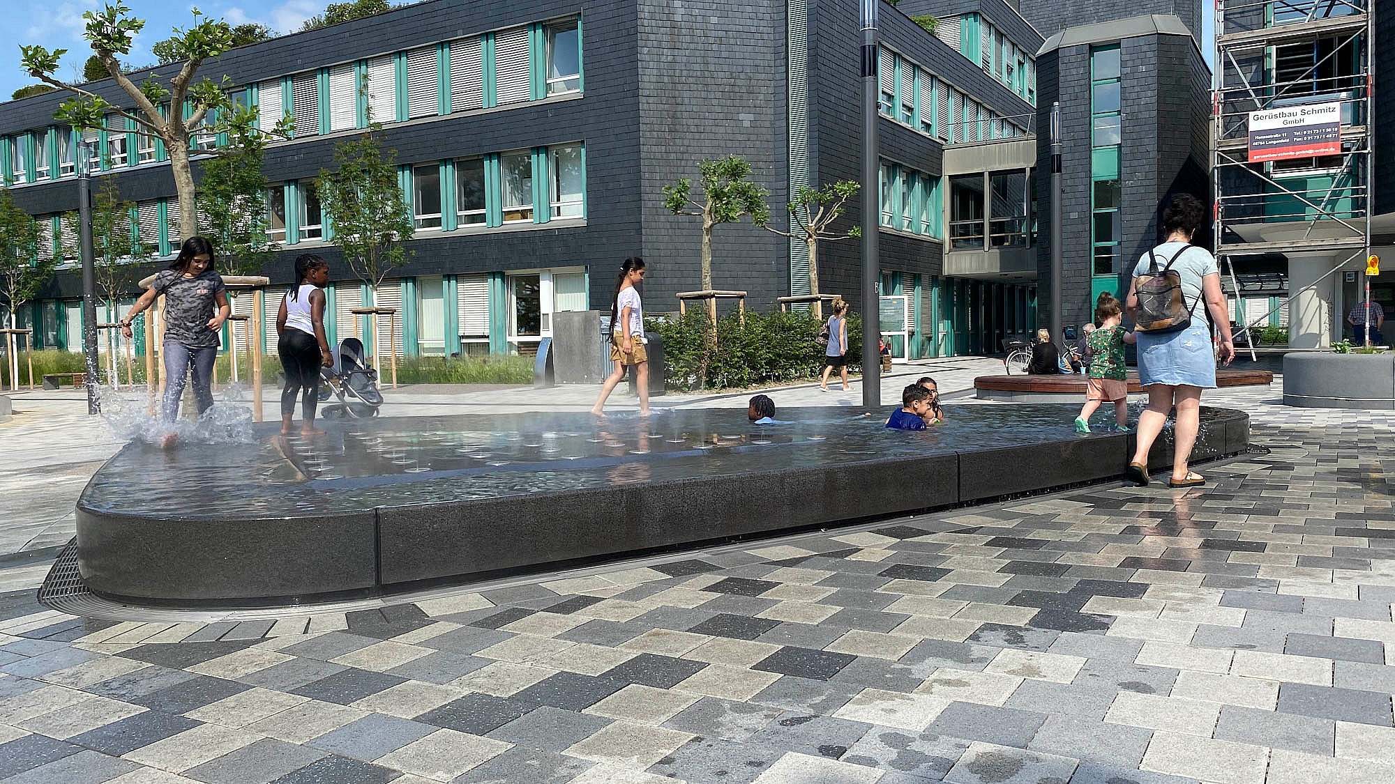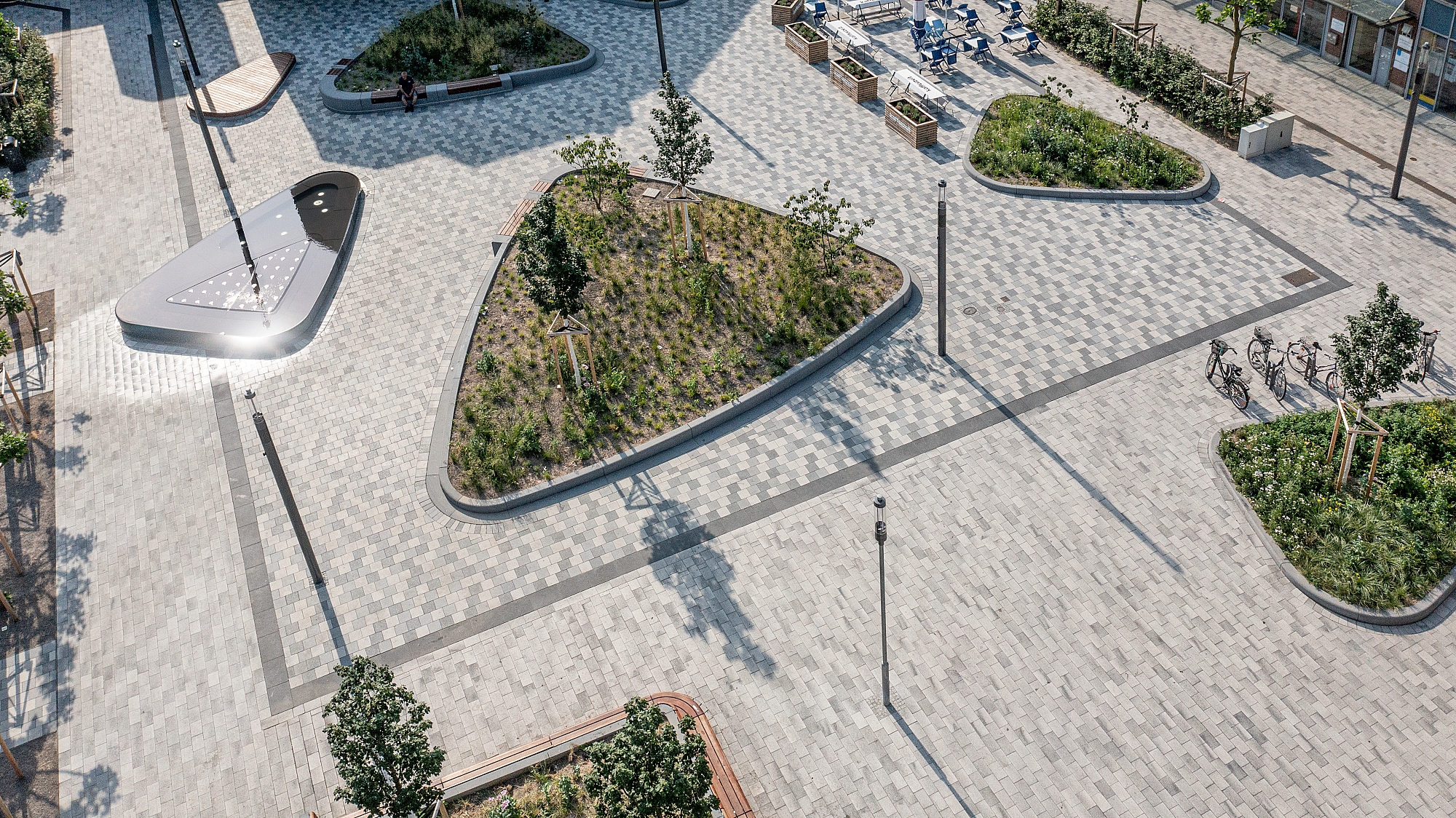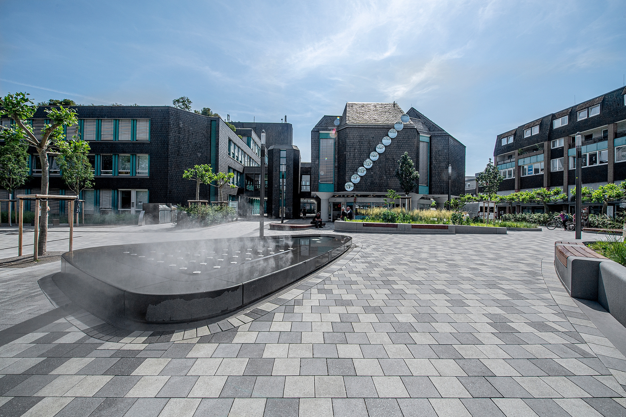 City oasis for everyone! Konrad-Adenauer-Platz is centrally located in downtown Langenfeld. The square area, which is partly covered by an underground car park, borders directly on the town hall and is surrounded by different uses such as gastronomy, retail and services. With a concise concrete block paving and custom-made concrete block island elements from METTEN Stein+Design, the Essen office "Förder Landschaftsarchitekten" transformed the inner-city square into an inviting urban space with a high quality of stay. The islands form a green oasis in the city, a "town hall garden" that ensures a better urban climate through water, planting and a small paved area. Preserved plane trees and newly planted maple trees, perennials and green spaces also add “green” to the public city oasis. Konrad-Adenauer-Platz is one of the central places in downtown Langenfeld. It was getting on in years and no longer looked contemporary. With its redesign, the square was restructured, its quality of stay improved and accessibility implemented. In order to improve the quality of the urban space, the city of Langenfeld, together with the planning office "Förder Landschaftsarchitekten", first looked for design ideas that would be shared with the public. Many citizens took the opportunity to let their ideas flow into the redesign of the square. The quality of stay and family friendliness were very important to everyone involved, reports landscape architect Arnaud Greder. Ultimately, the planning office "Förder Landschaftsarchitekten" bundled all the ideas and created an overall concept from them, which is based, among other things, on the redesign goals: improving the quality of stay, reorganizing the square area and accessibility. For the adjoining action and movement areas, including the Umbriano® pavement stone in granite gray and white that opens up the space. Almost 4,000 square meters of space were redesigned with the concrete paving, laid in straight rows measuring 30 x 20 x 10 centimeters and 12.5 x 12.5 x 10 centimeters at the building connections. With Umbriano®, the special CleanTop® surface protection with CF 90 makes it easier to maintain and clean the square: "It was important to us to give this central urban space a new quality of use and to strengthen its inviting components in the long term with a well-kept look," says Arnaud Greder. The manufacturing process developed by METTEN specifically for Umbriano® is unique and protected by international patents. The paved square is repeatedly interrupted by various “islands”. Arranged in the middle of the square are “islands” with seating walls and areas of vegetation or with water elements. In front of the health department, "islands" invite you to linger as play and activity areas. In addition, the islands, as a kind of "town hall garden", contribute to an improvement in the urban climate through water, planting and a small amount of paved area. The “island surrounds” are also custom-made from concrete blocks to match the paving. The basis for this is provided by the ConceptDesign line from METTEN Stein+Design. The block step system also comes from the ConceptDesign line, which compensates for a change in terrain and enables quick access to the square via the adjacent access roads. Equipped with a colour-contrasting concrete inlay warning strip, the staircase also ensures safe use for visually impaired citizens. "With the redesign of Konrad-Adenauer-Platz, we have succeeded in giving Langenfeld's city center a new identity that enriches city life. The new paving, which has a strong surface effect and which contributes to a safe, walkable urban space, makes a significant contribution to this,” summarizes landscape architect Greder. METTEN Stein+Design only uses high-quality sand and natural stone chippings to design its surfaces, which, in combination with the surface treatment, create the special look. The valuable material is used in a very resource-saving manner. Basically, the natural stone chippings are only used in the facing concrete, i.e. in the top layer.