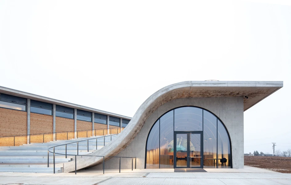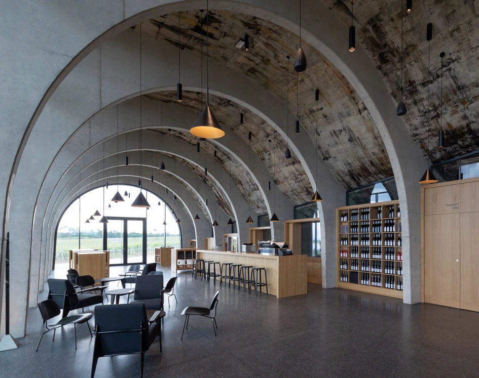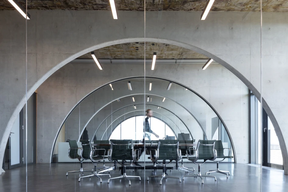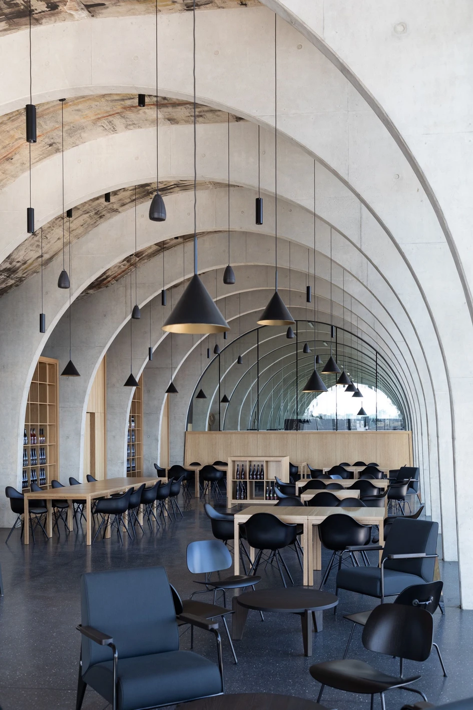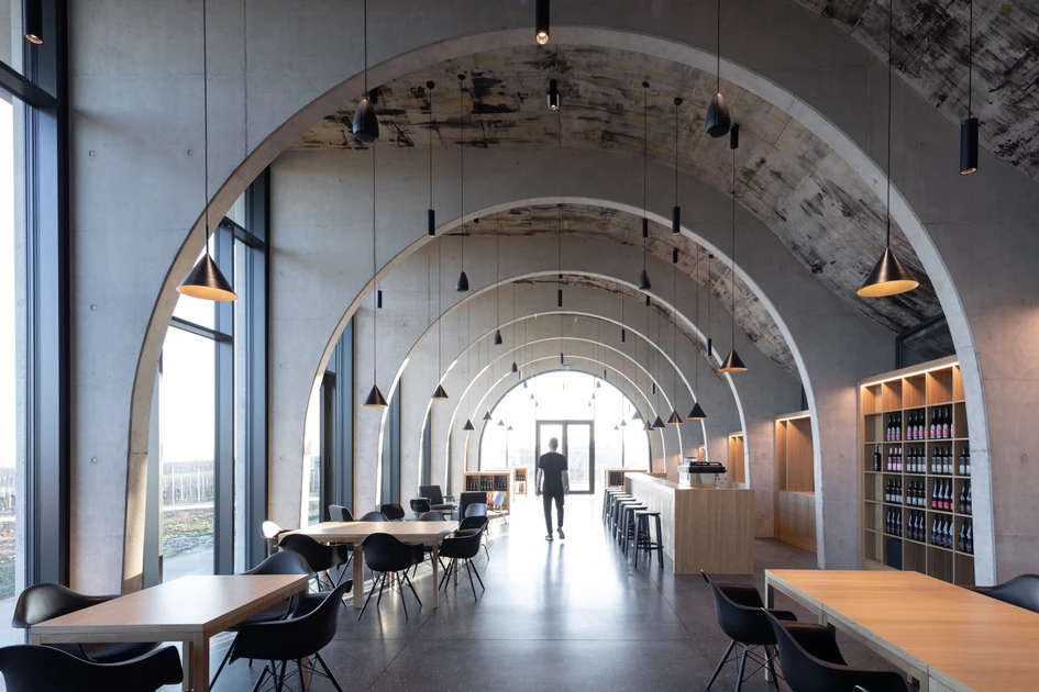 Towered by the concave roof of the amphitheater, the space unfolds into a vast cellar, embracing the design of archetypal Czech wineries defined by the exposed rib construction of the arches. Each reinforced concrete arch is individually designed to fit a specific angle of the ceiling, while the distance between the arches is determined by that between the vine rows.