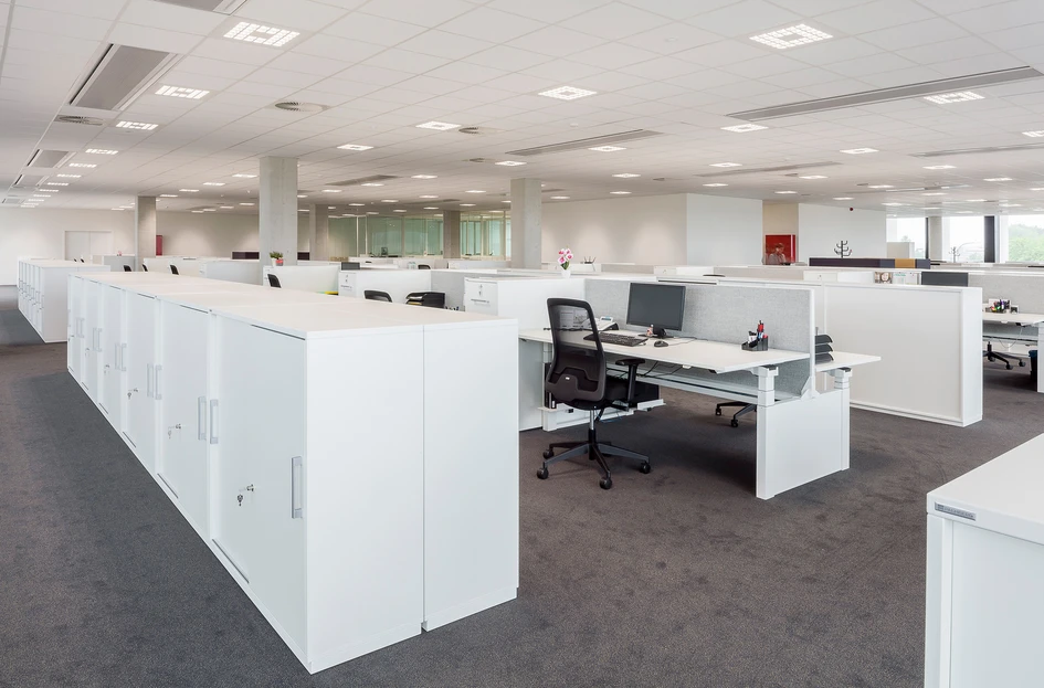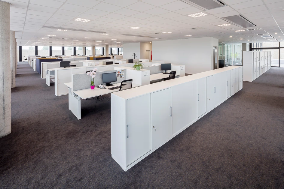 A welcoming showroom is designed to invite customers and guests of the company to linger. On the upper storey of the new building complex, the project in parallel focused on the conception of an open office landscape, accompanied by adjoining individual offices. In addition, the work environment was to be employee-oriented and ergonomic. This requirement was optimally met by using the electromotive solution of the workplace family CREW from PALMBERG.
