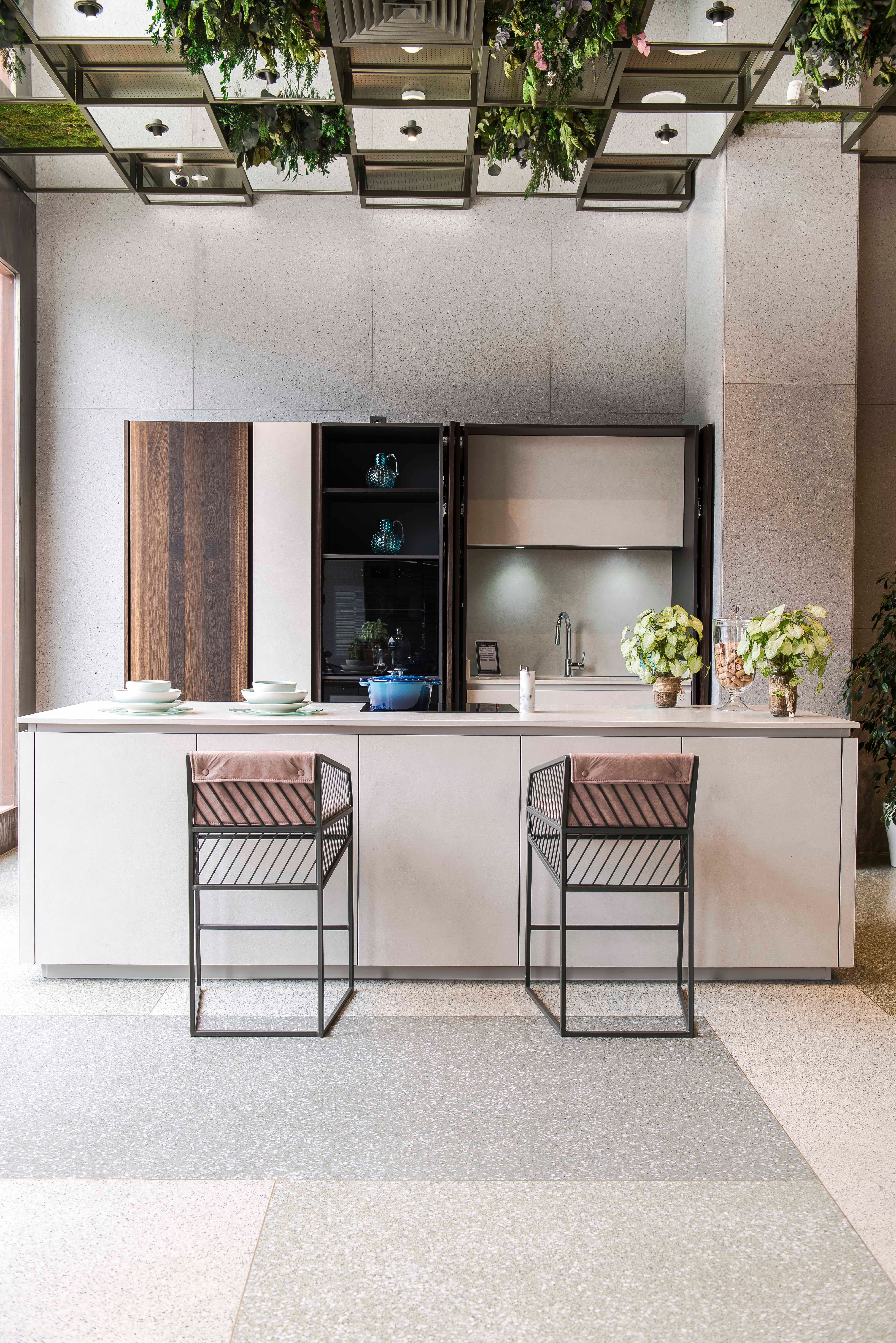 Mirror and plant orieanted practices on the ceiling makes this transition clear. Seating elements, storage elements and bar located at the entrance ceiling with the analogy of leaf vein placed on the countertop, it shows nature and tradition memory in our mind.