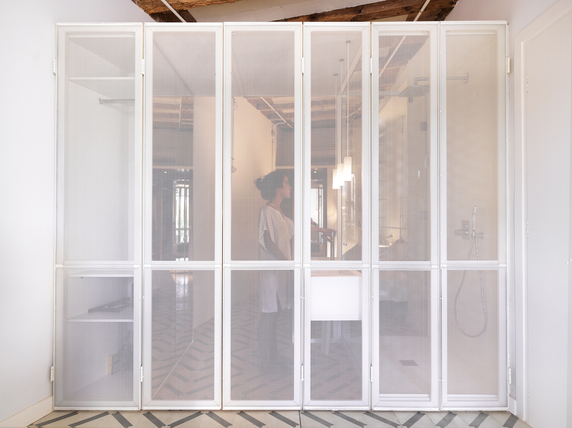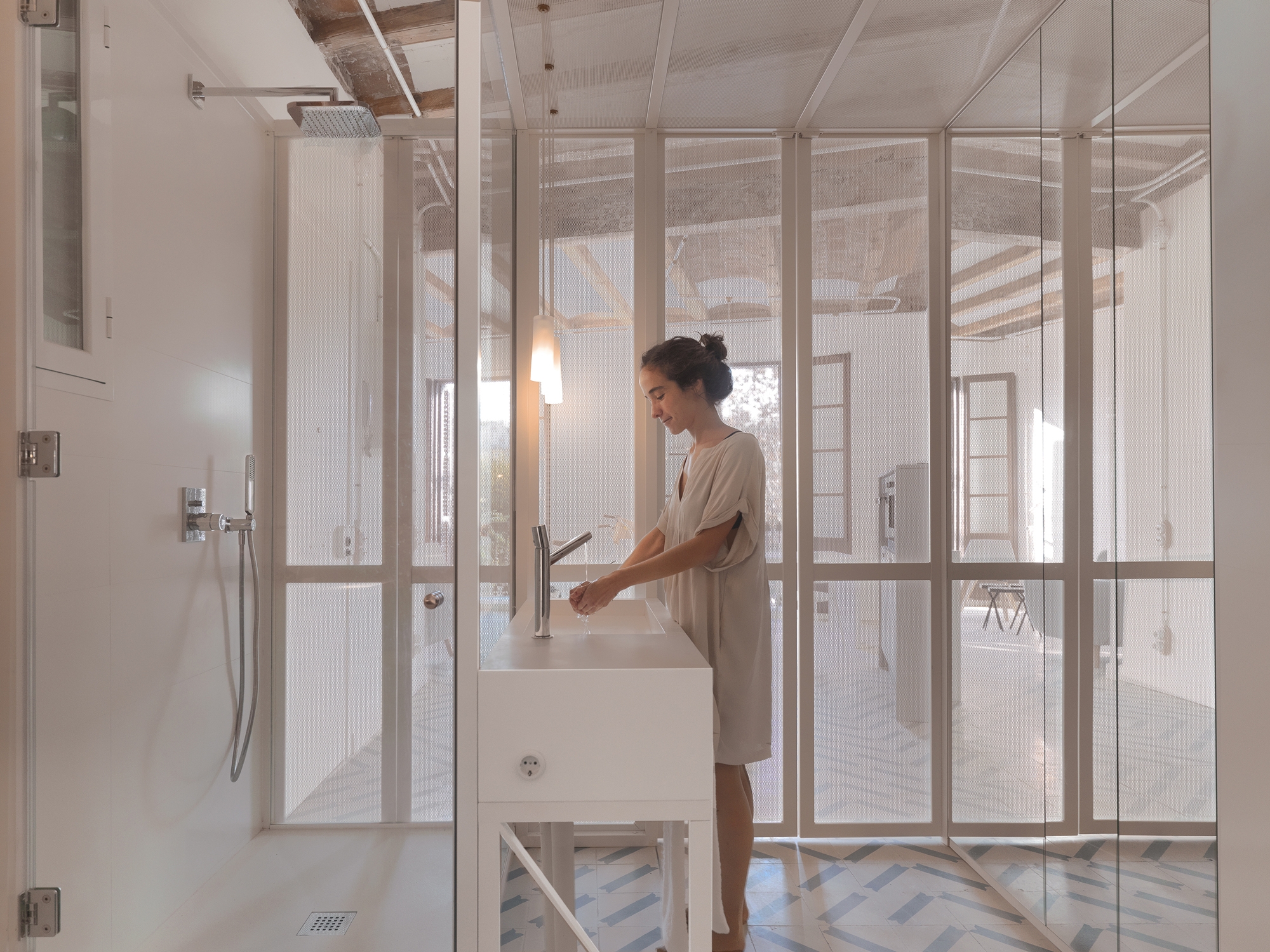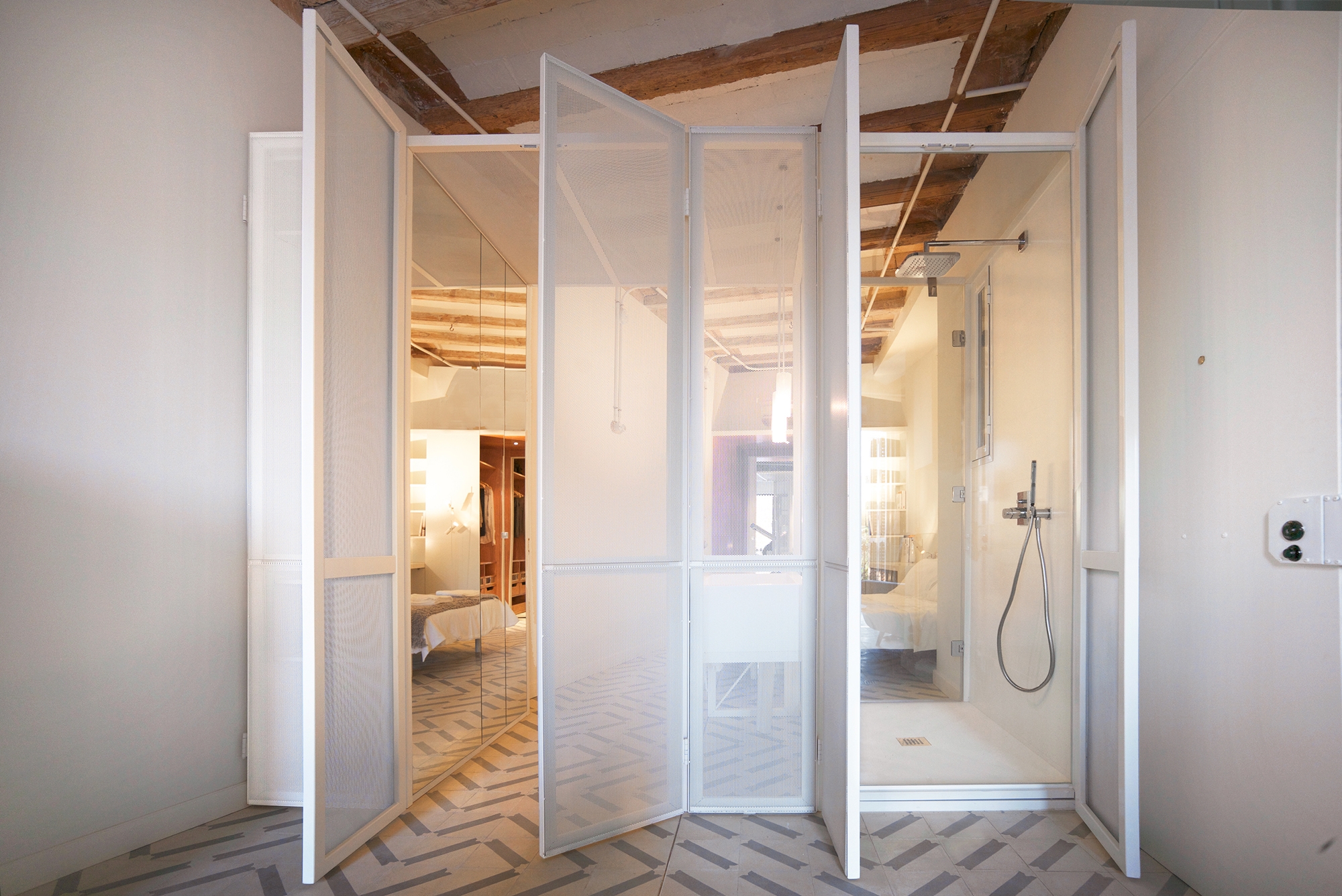 Esta es una estructura compuesta de unos paneles microperforados que separan la zona húmeda, filtran la luz y aportan privacidad a modo de celosía para la habitación. De esta forma se separa de una forma elegante la zona de noche de la de día. Durante la noche esta ¨Caja de Luz¨ se invierte y mediante el uso de luz regulable ilumina la zona de estar de una forma ambiental y relajante.
