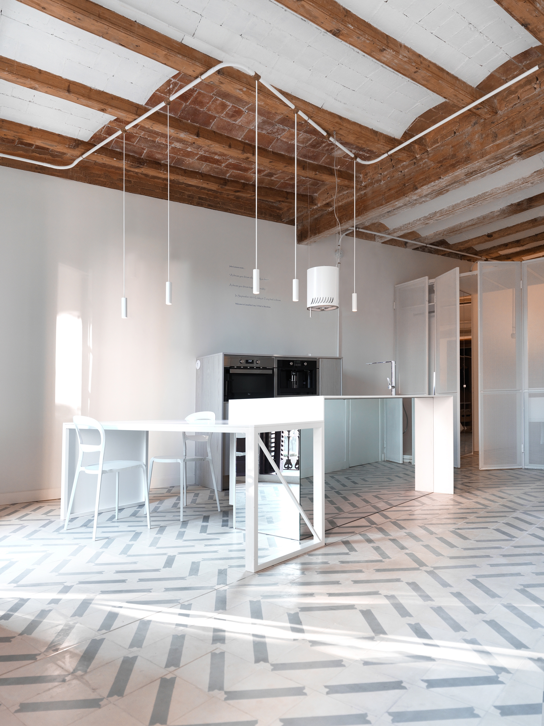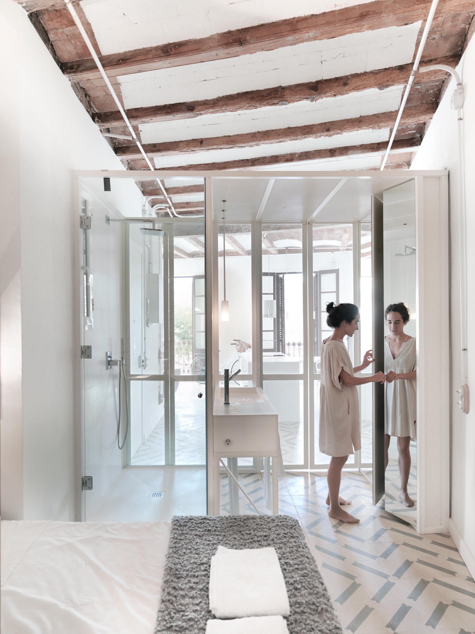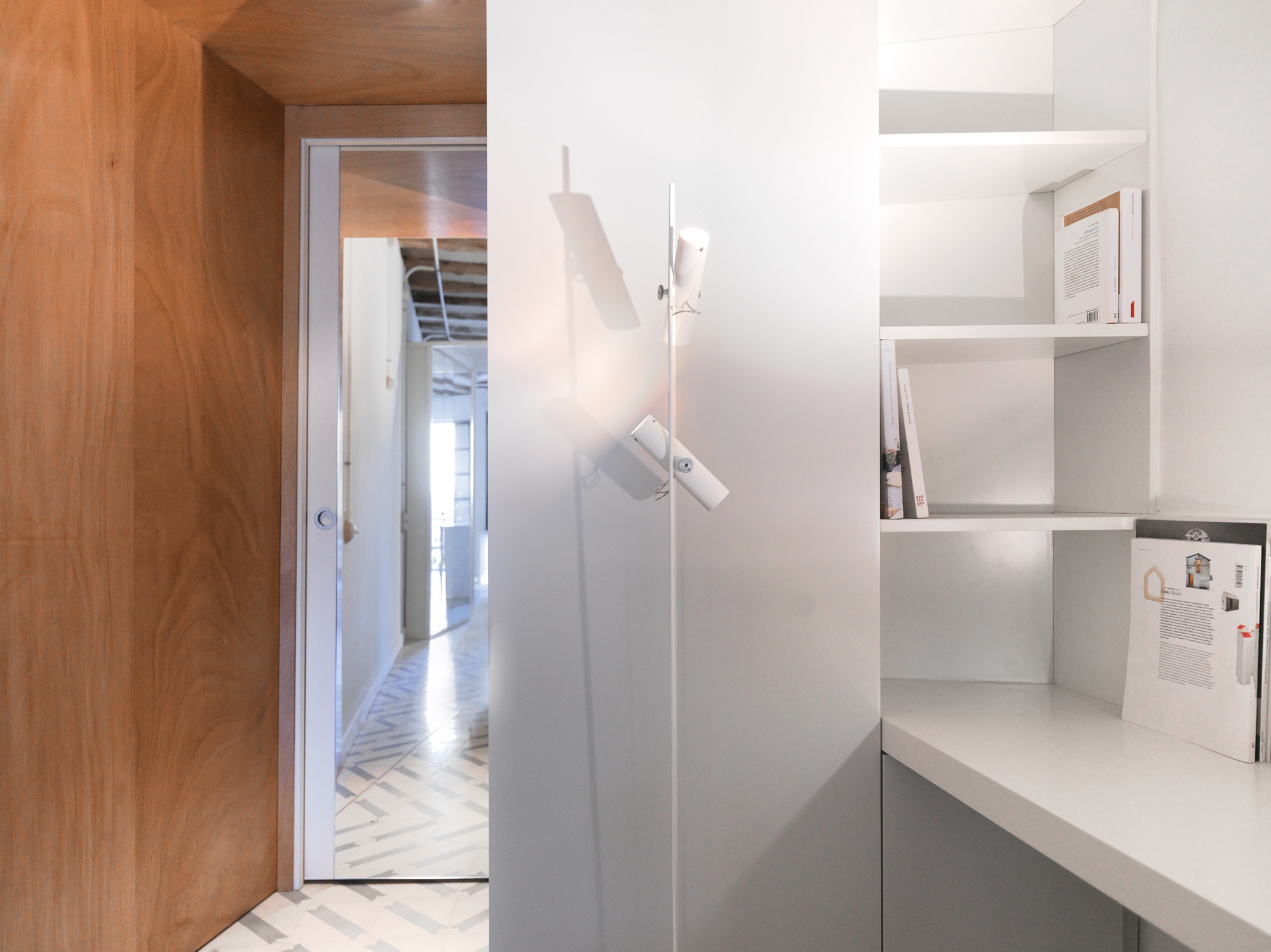 El pavimento de mosaico original se encontró en muy mal estado por lo que los arquitectos diseñaron uno completamente nuevo siguiendo el método de fabricación tradicional, pero con un patrón único y contemporáneo. Se utilizan espejos en puntos estratégicos del apartamento, como en la ¨Caja de Luz¨ y en la cocina para magnificar sus resumidas dimensiones y reflejar la luz o elementos arquitectónicos que dan continuidad espacial. Todas las instalaciones se canalizan superficialmente y han sido especialmente diseñadas y cuidadas al detalle, enmarcando los techos y decorando las paredes.