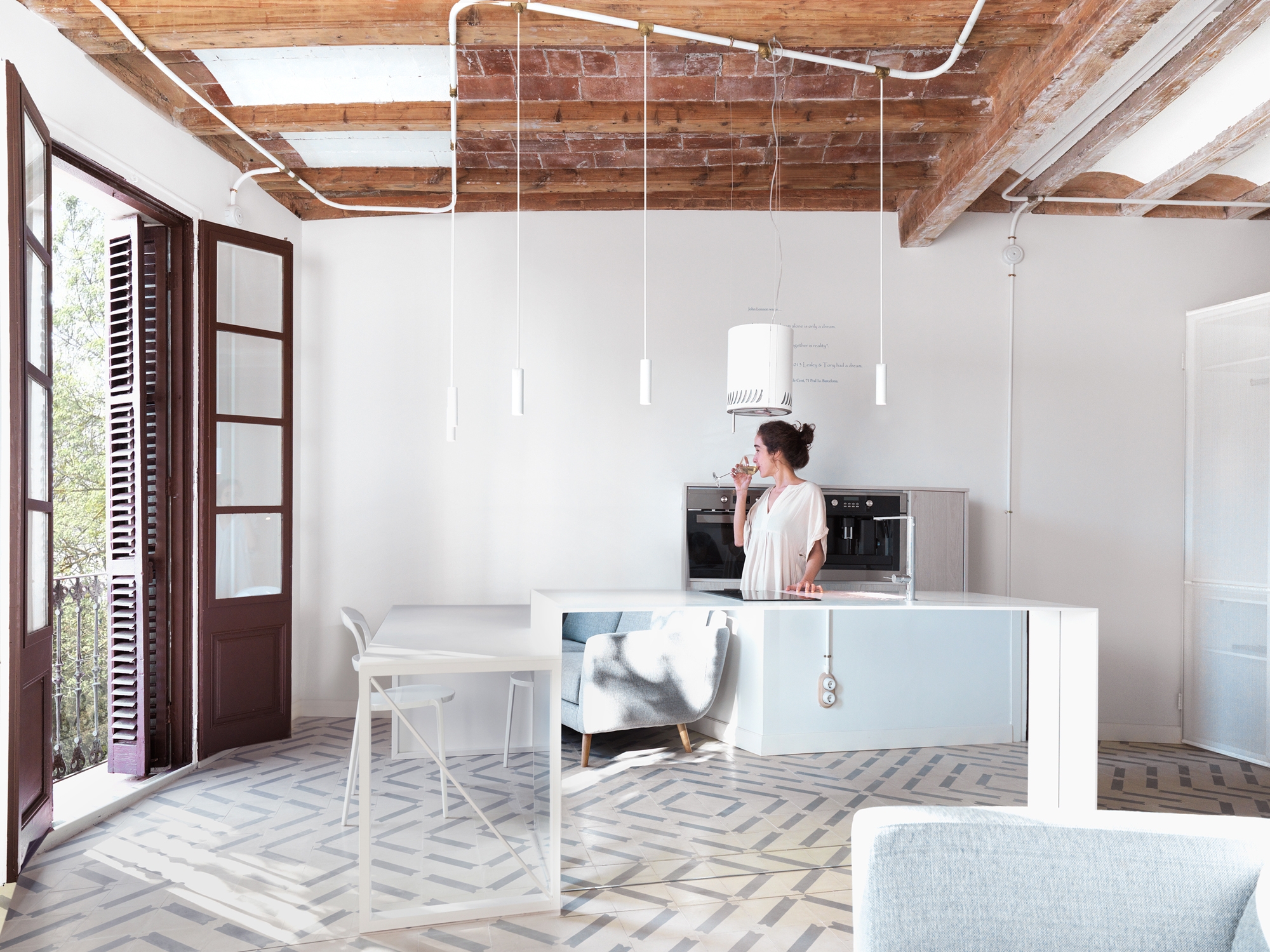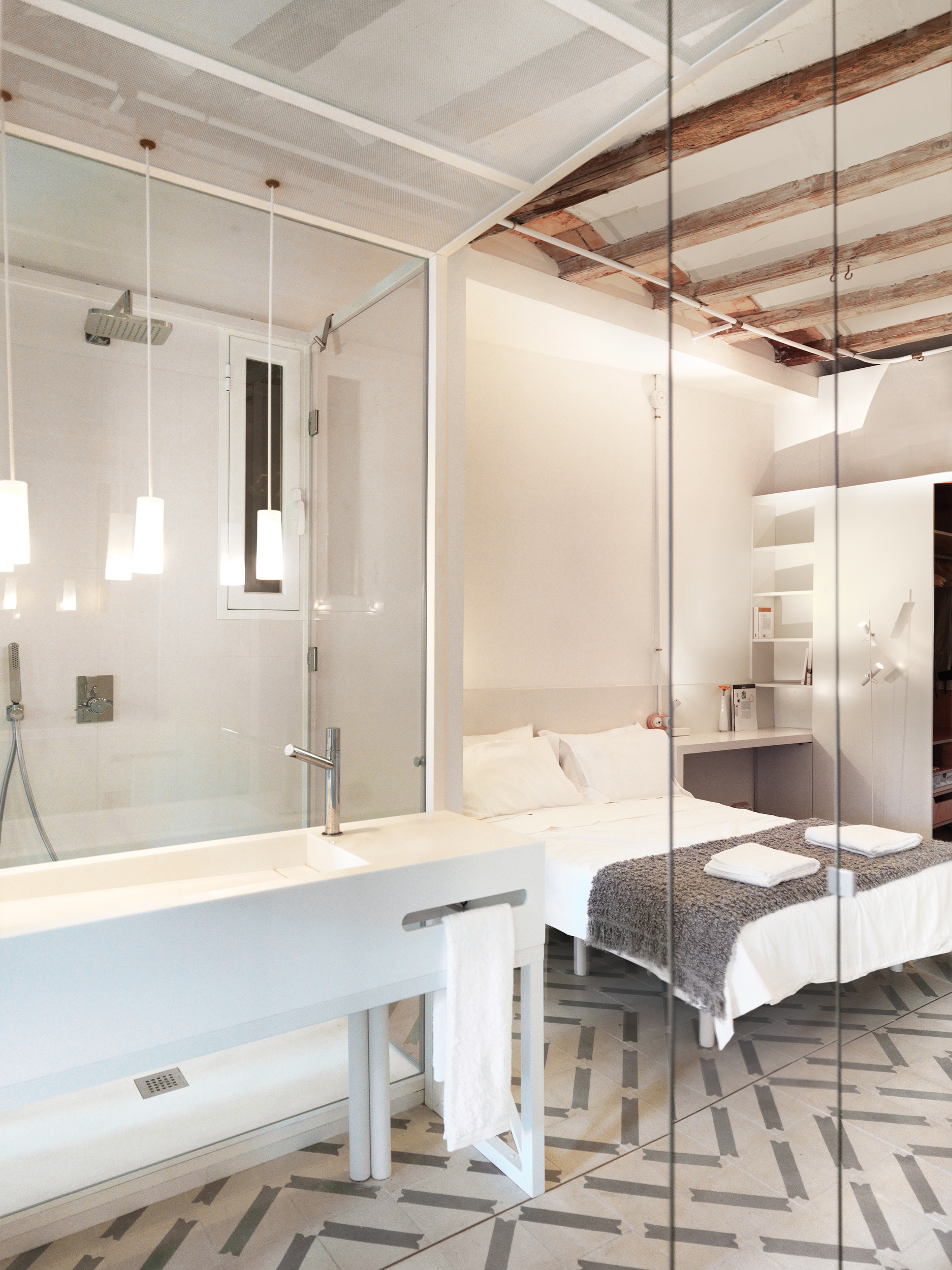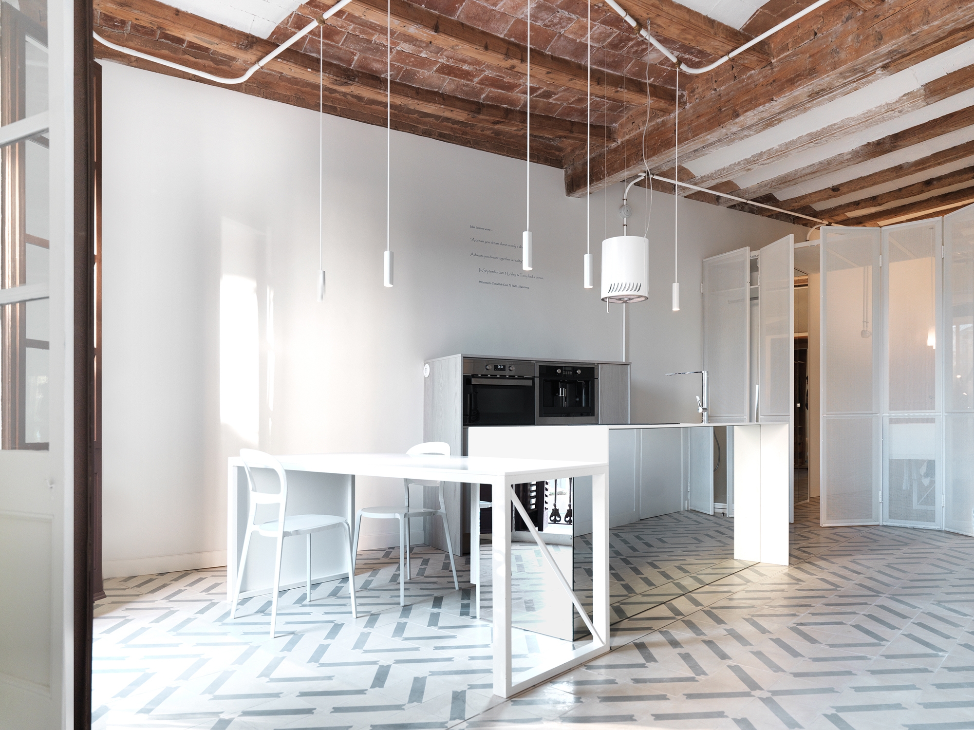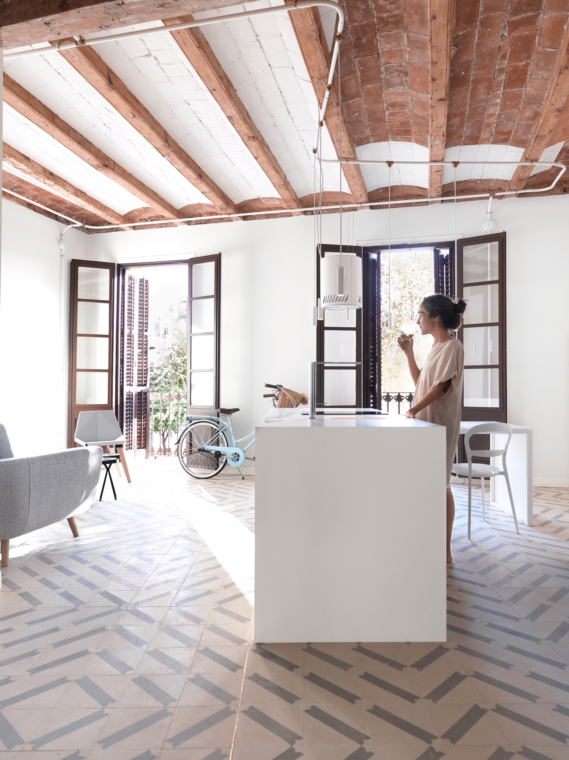El pavimento de mosaico original se encontró en muy mal estado por lo que los arquitectos diseñaron uno completamente nuevo siguiendo el método de fabricación tradicional, pero con un patrón único y contemporáneo. Se utilizan espejos en puntos estratégicos del apartamento, como en la ¨Caja de Luz¨ y en la cocina para magnificar sus resumidas dimensiones y reflejar la luz o elementos arquitectónicos que dan continuidad espacial. Todas las instalaciones se canalizan superficialmente y han sido especialmente diseñadas y cuidadas al detalle, enmarcando los techos y decorando las paredes.